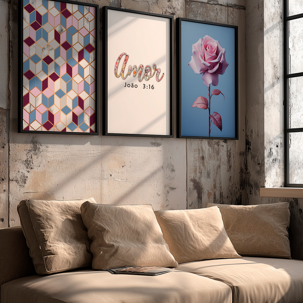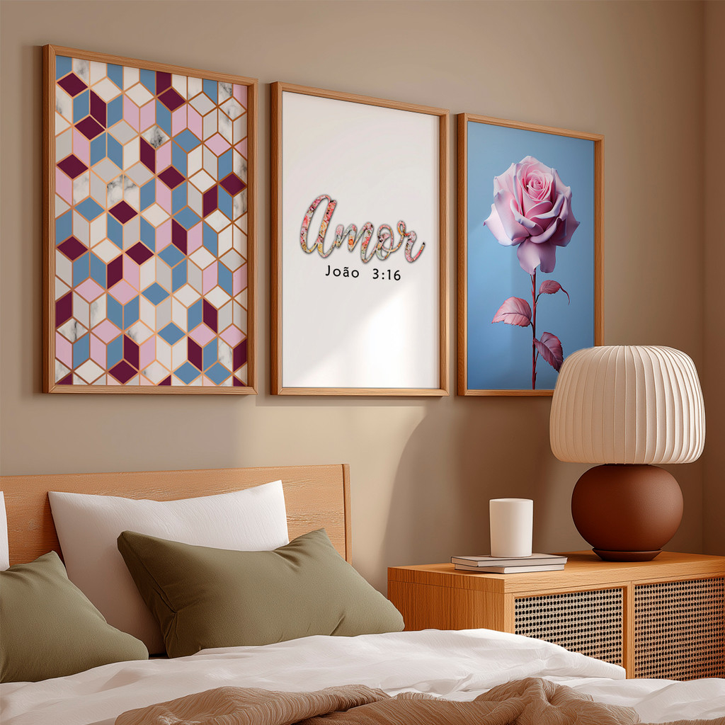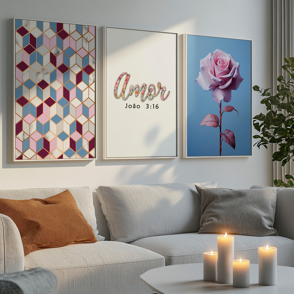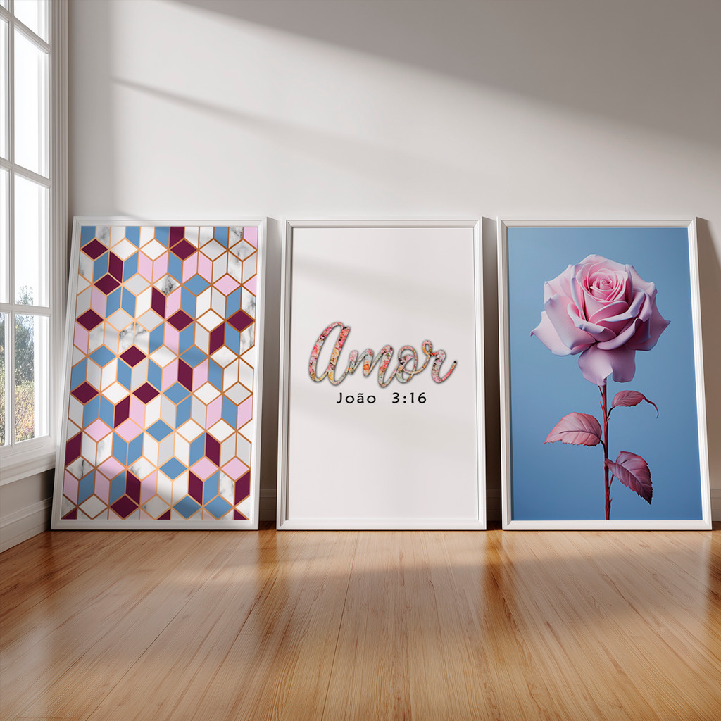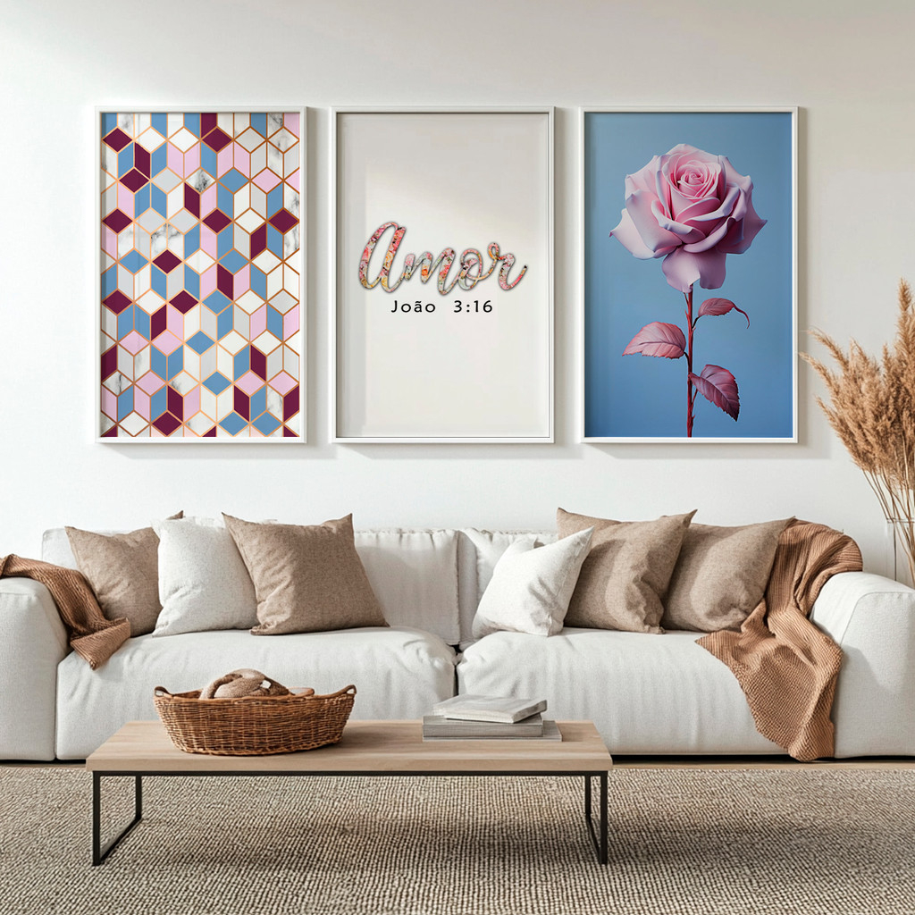 Este conjunto de três telas une arte geométrica, mensagem espiritual e delicadeza floral em uma composição equilibrada e cheia de significado. A palavra “Amor”, acompanhada da referência bíblica João 3:16, traz um toque de fé e reflexão, enquanto os elementos visuais reforçam sensibilidade e elegância.