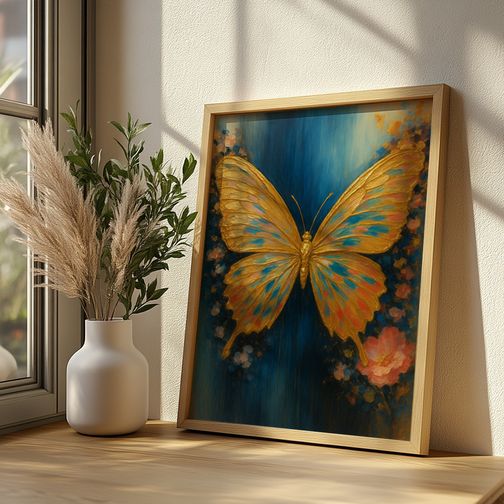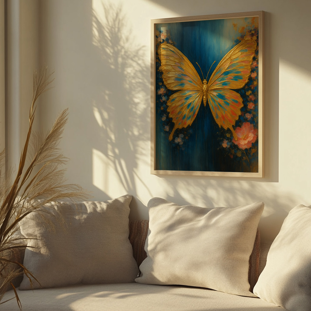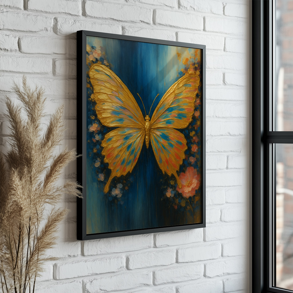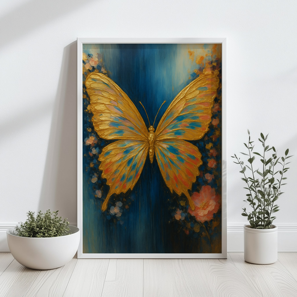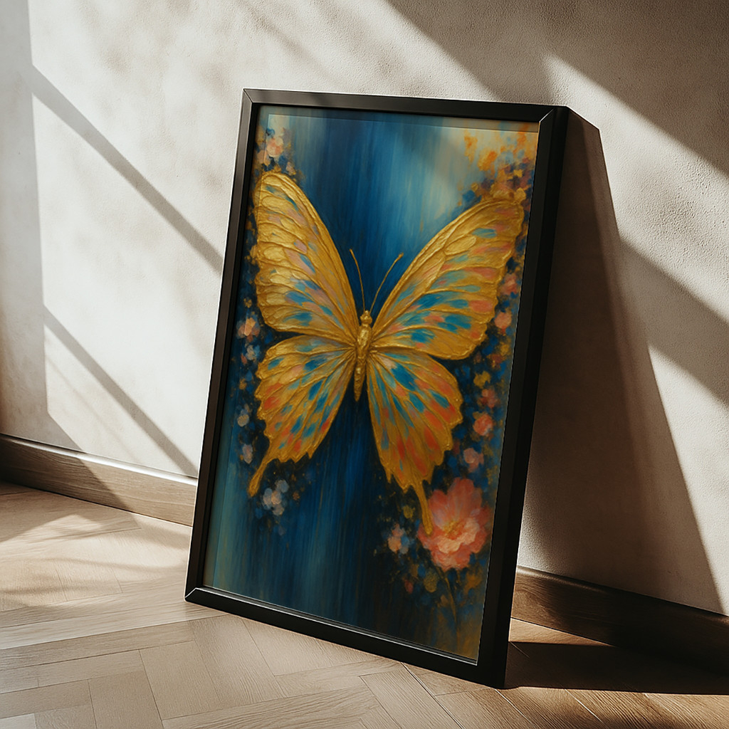 A obra se destaca por seu fascinante jogo de contrastes e texturas visuais incrivelmente ricas. O fundo em um azul profundo e envolvente, marcado por pinceladas verticais artísticas, faz com que as asas texturizadas em dourado vibrante saltem aos olhos com um brilho quase palpável. Delicados toques de ciano e rosa nas asas conversam harmoniosamente com as suaves formas florais abstratas na base da composição, conferindo um ar romântico, misterioso e onírico a esta verdadeira joia decorativa.