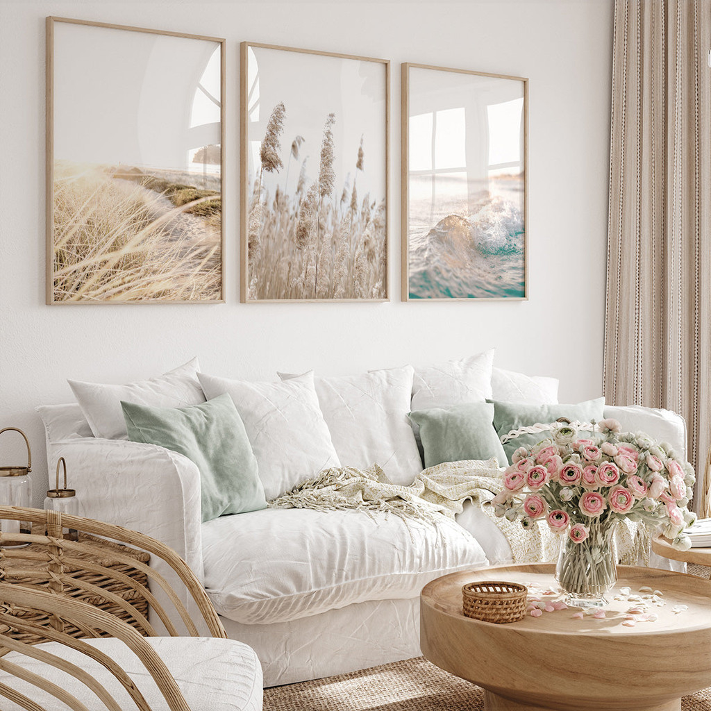 Este trio de quadros traz a essência da natureza litorânea em composições que transmitem leveza e tranquilidade. Cada imagem captura um momento único: a luz suave sobre a vegetação, a dança das plantas ao vento e o movimento delicado das ondas. Juntas, as três telas criam uma atmosfera serena e envolvente.