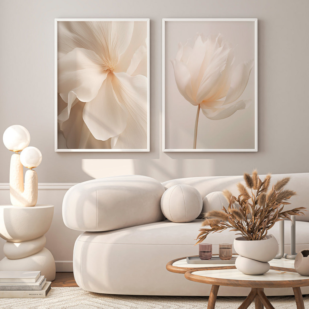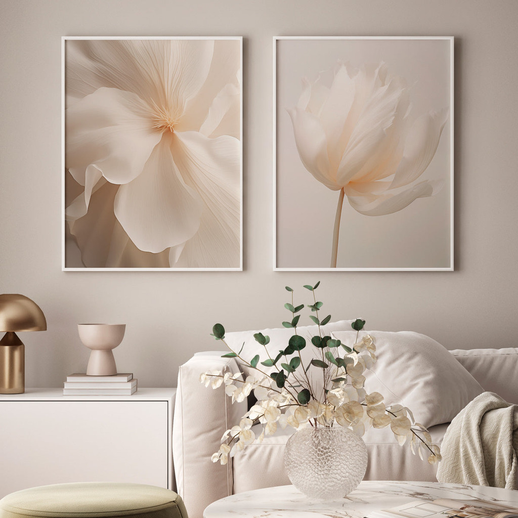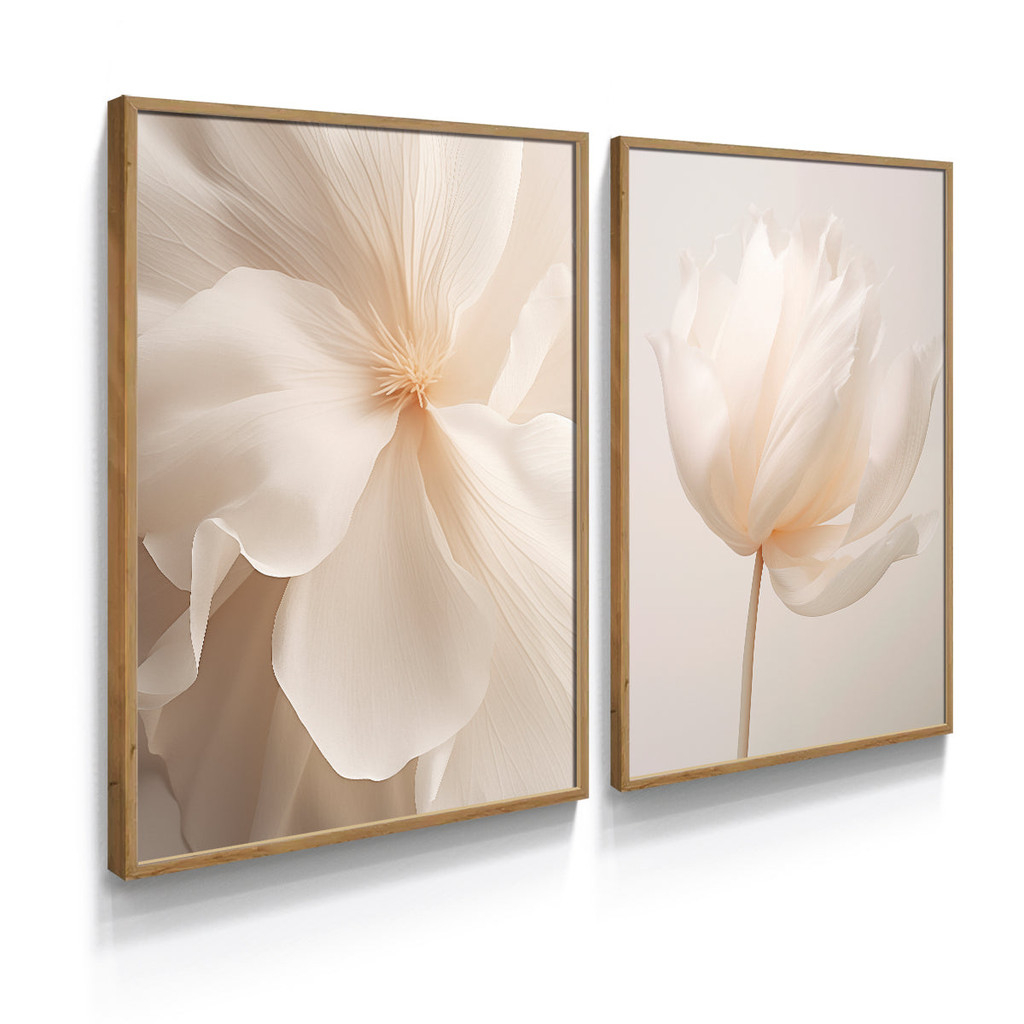 Cada detalhe das pétalas transmite movimento e naturalidade, ressaltando a pureza das formas e a serenidade das cores. A suavidade das flores é realçada pelo fundo neutro, que valoriza o contraste delicado entre sombra e luz. O resultado é uma arte que inspira calma e equilíbrio, transformando o ambiente em um verdadeiro refúgio visual.