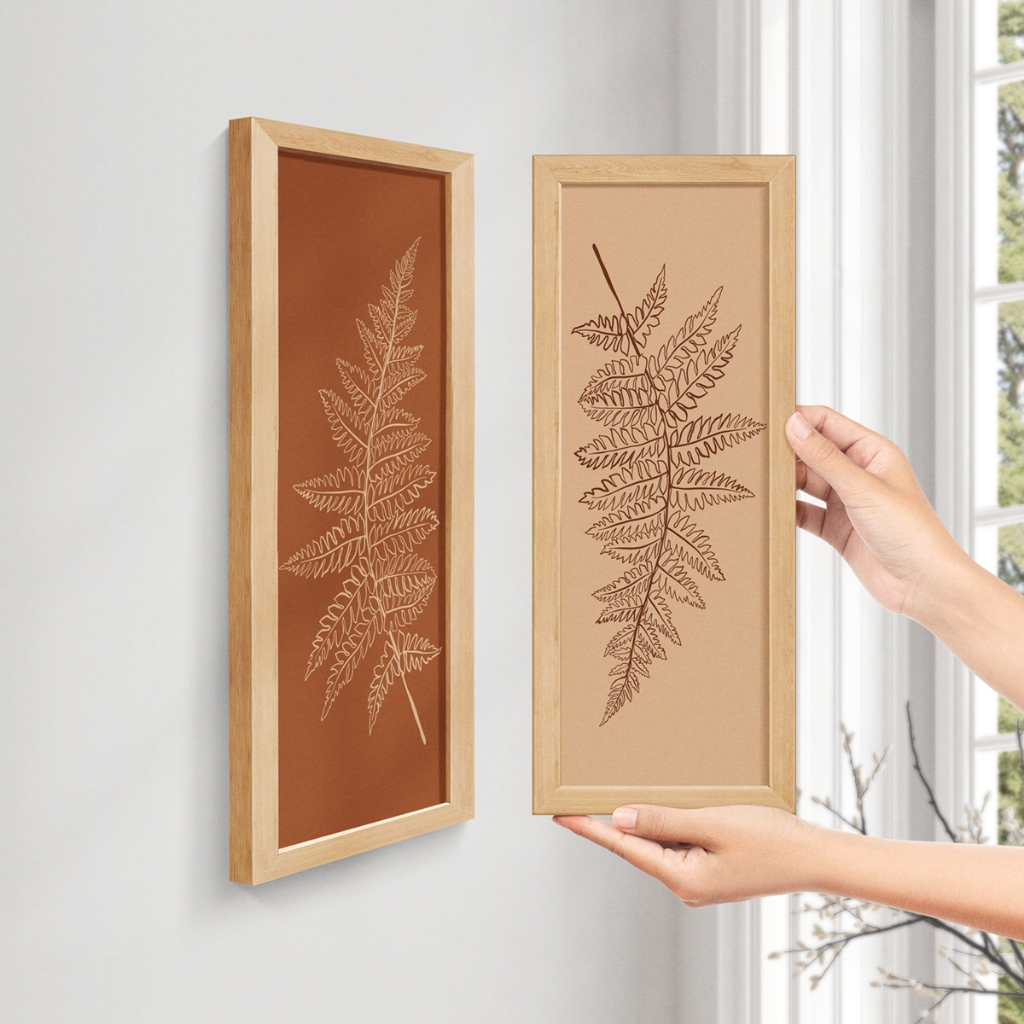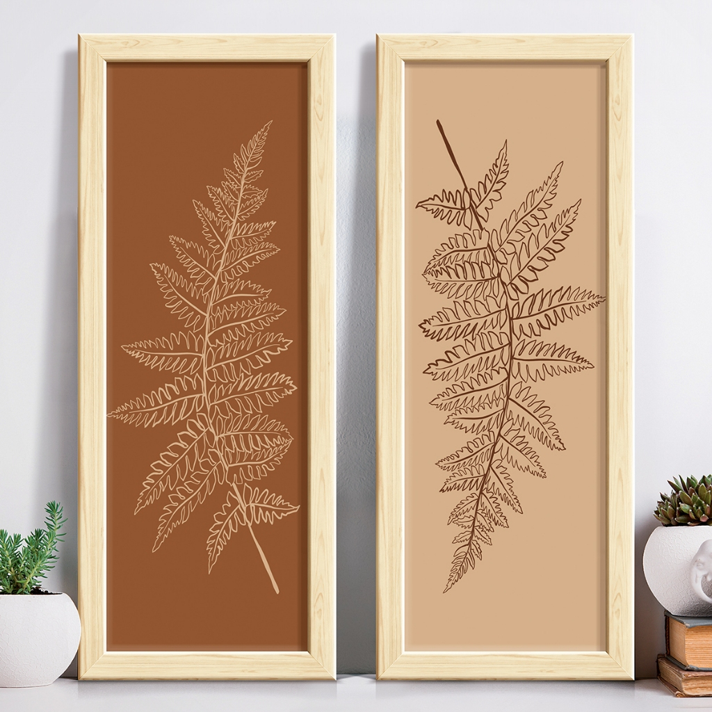 Este conjunto de duas telas apresenta folhagens estilizadas em traços lineares delicados, destacadas em tons terrosos sofisticados. As ilustrações trazem leveza e elegância, criando um visual contemporâneo que combina perfeitamente com qualquer ambiente.