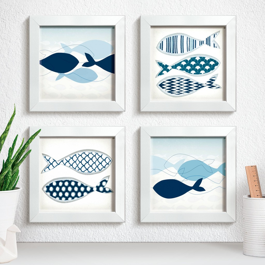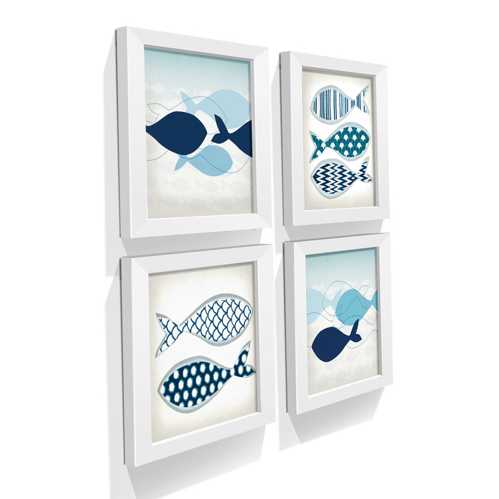 Este conjunto de quatro quadros traz a leveza e o frescor do estilo náutico para a decoração, criando um ambiente acolhedor e sereno. Com ilustrações modernas de peixes em tons de azul, as peças evocam tranquilidade e movimento suave, como o balanço do mar. É uma composição perfeita para quem busca um toque contemporâneo aliado a elementos naturais.