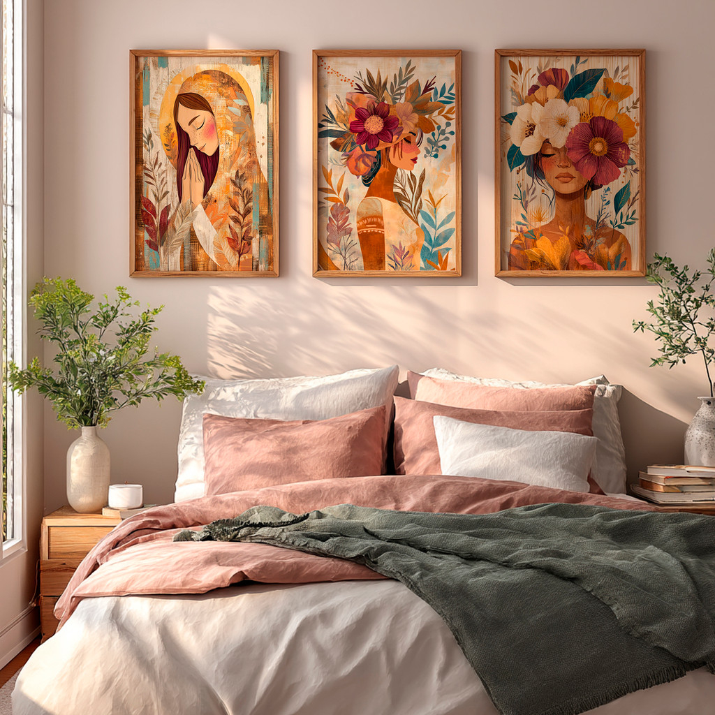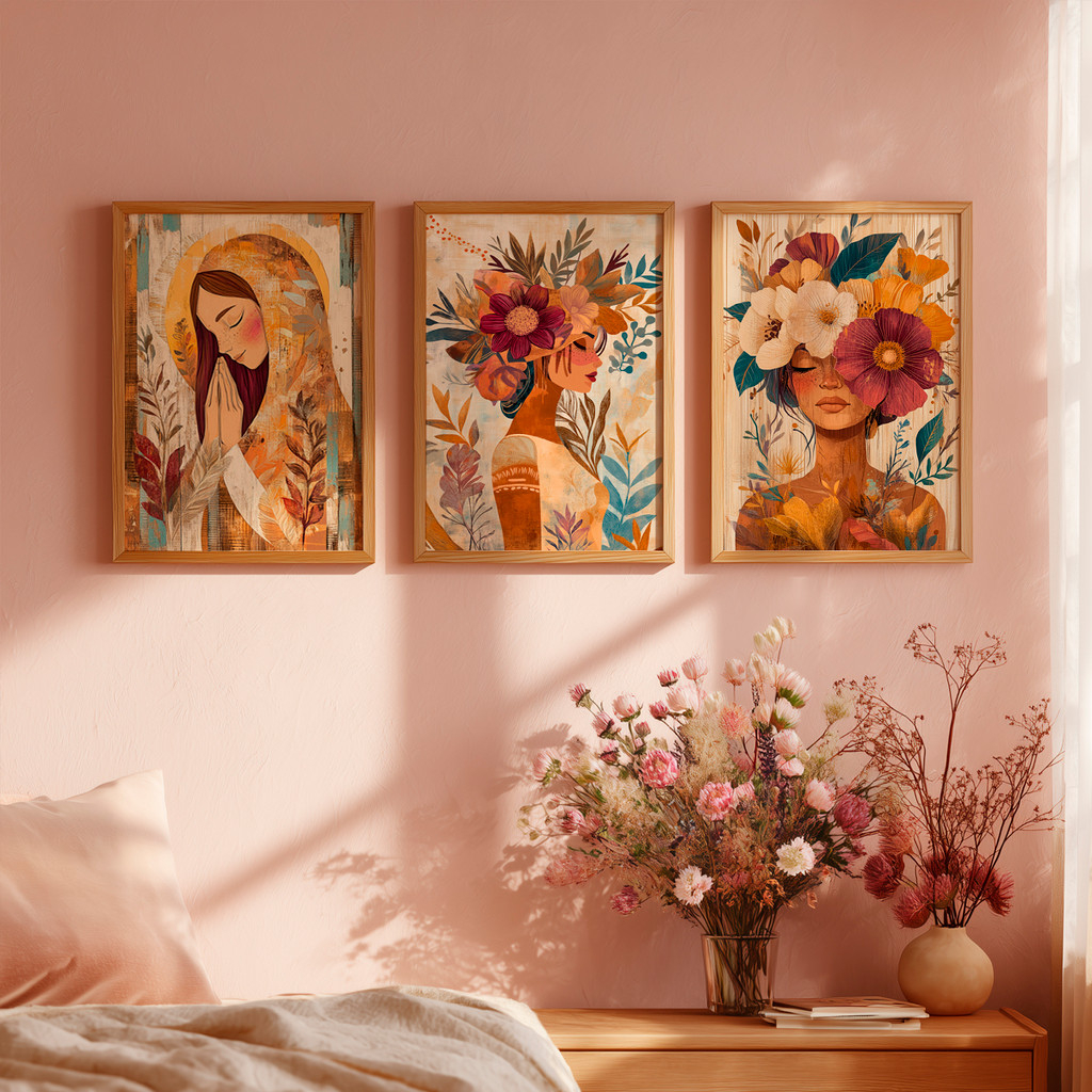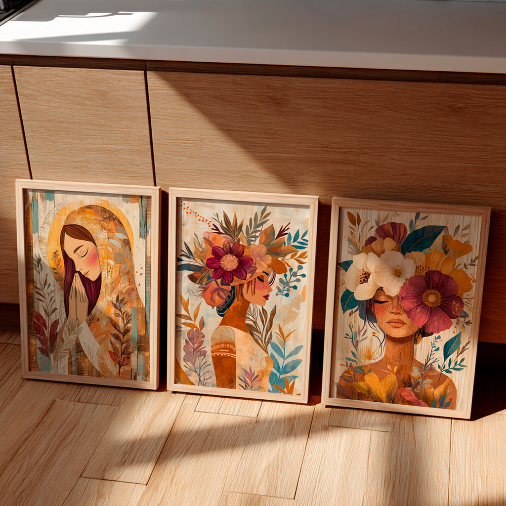 Este trio de quadros combina arte moderna e elementos naturais, criando uma atmosfera aconchegante e elegante. Cada peça apresenta figuras femininas estilizadas envoltas por flores e folhagens vibrantes, trazendo delicadeza e profundidade ao ambiente. As composições equilibram cores quentes e suaves, valorizando qualquer espaço com estilo e personalidade.