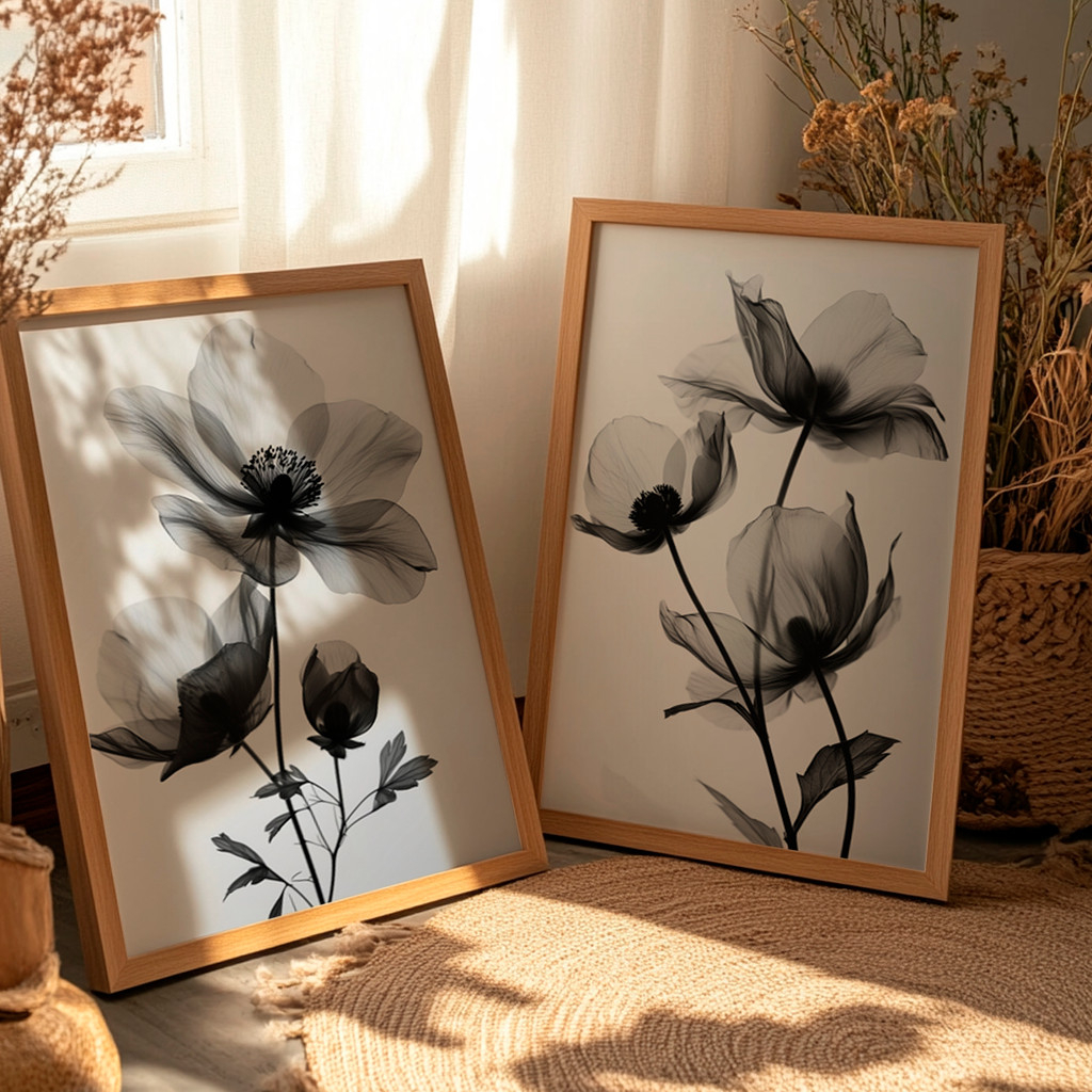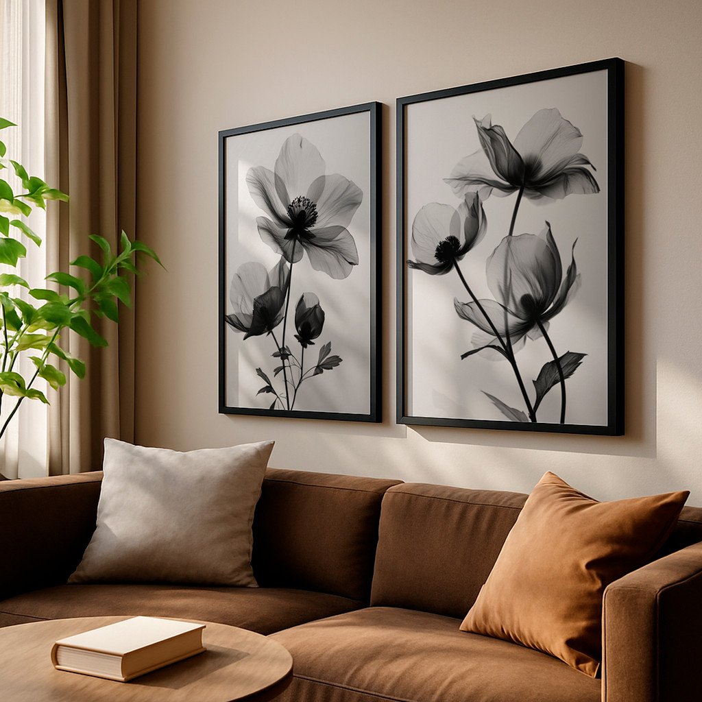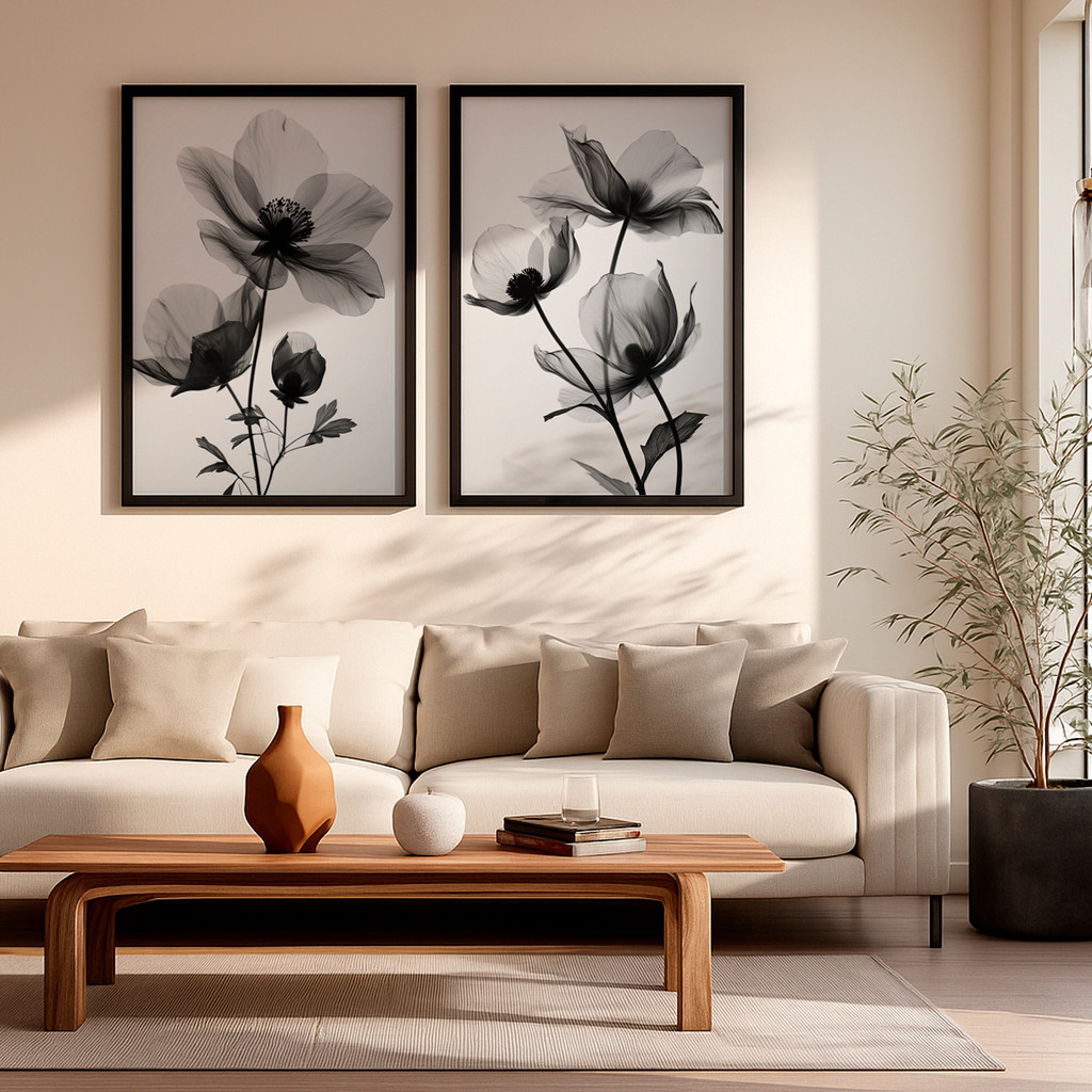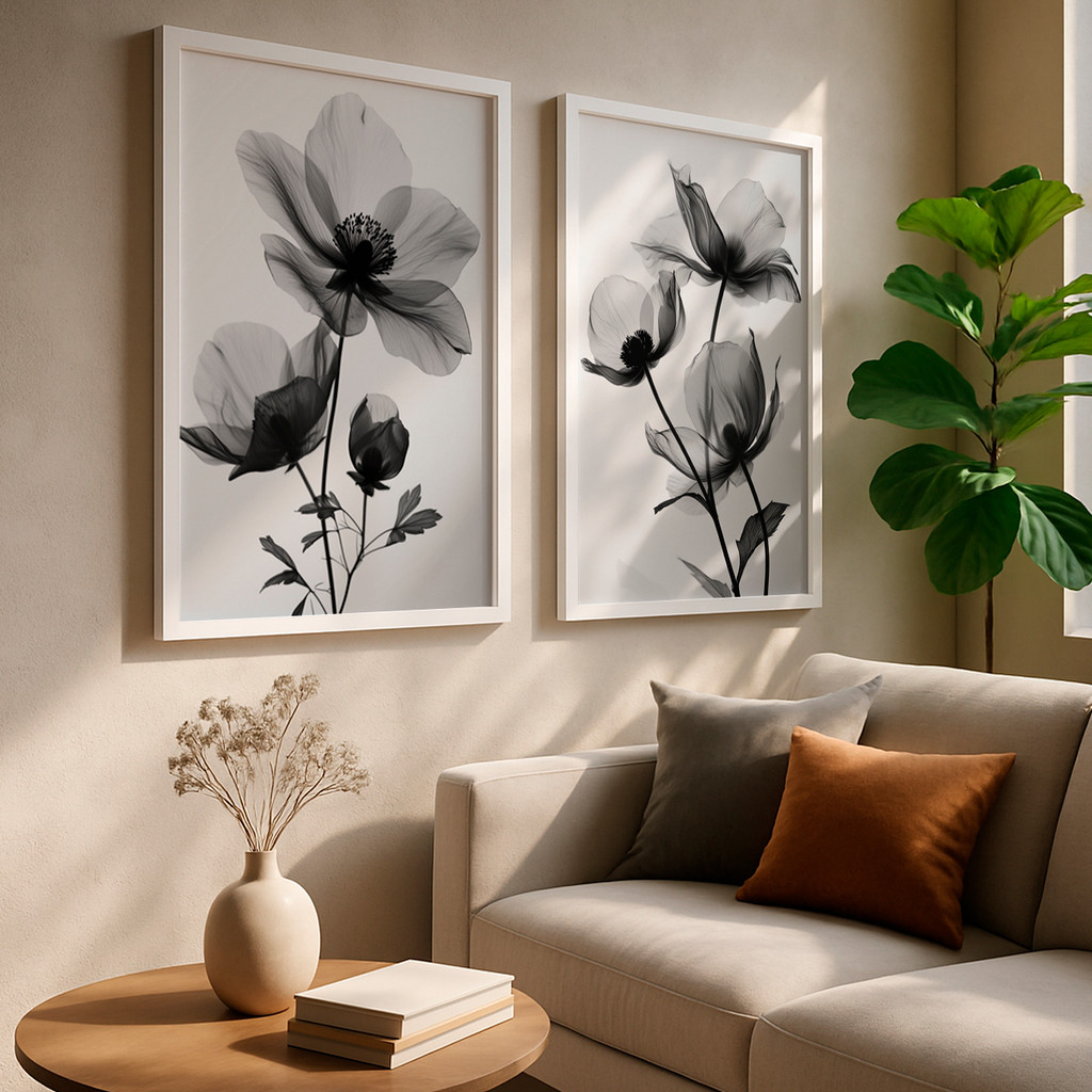Este conjunto de duas telas traz a elegância atemporal do preto e branco aplicada a delicadas flores em transparência. As pétalas suaves e etéreas criam um efeito visual refinado, como se fossem iluminadas por uma luz natural suave. O resultado é uma dupla sofisticada, perfeita para ambientes que buscam equilíbrio entre minimalismo e elegância.