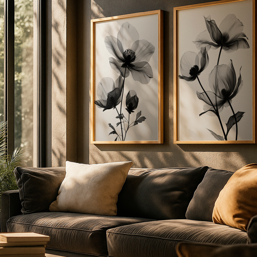 A delicadeza das formas florais contrasta com a profundidade das sombras, criando composições que ficam lindas em salas de estar, quartos, escritórios ou espaços de leitura. A estética limpa e moderna combina facilmente com diferentes estilos de decoração, desde o contemporâneo até o escandinavo.