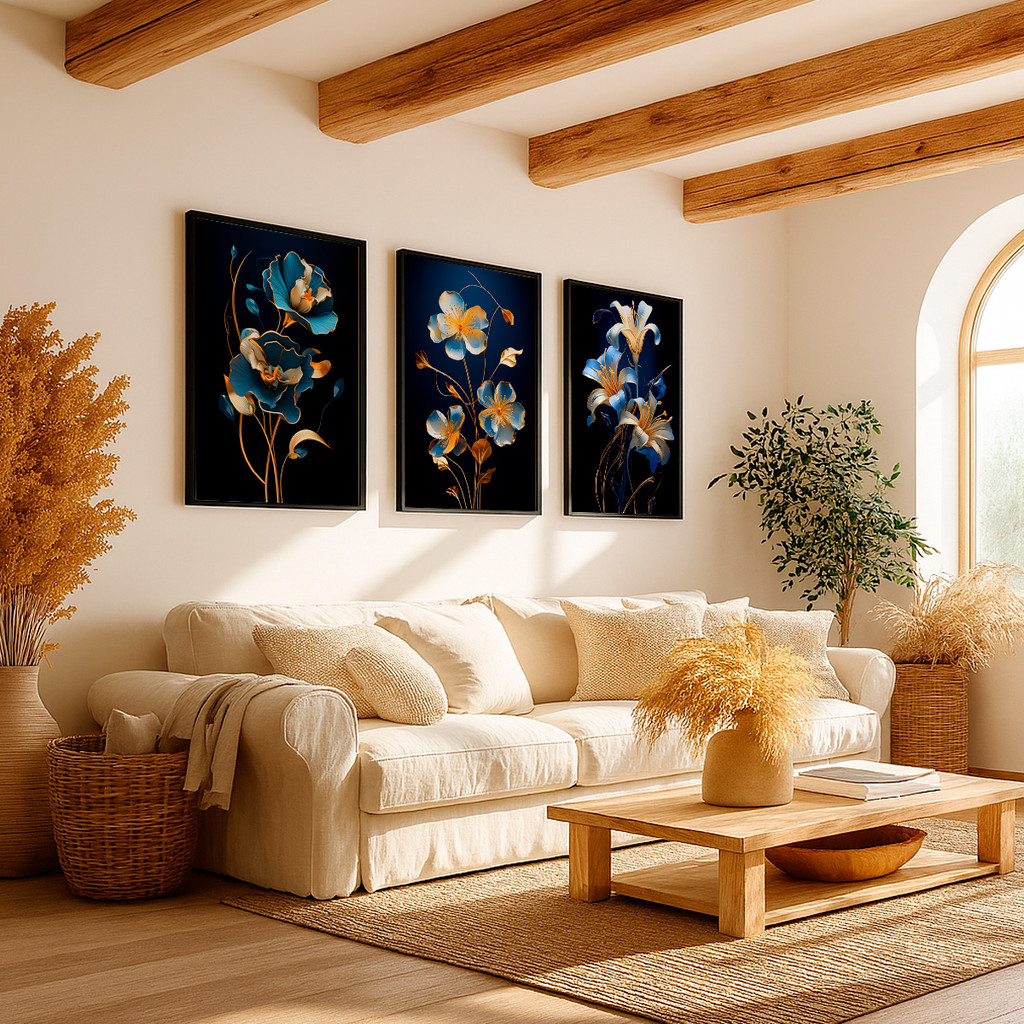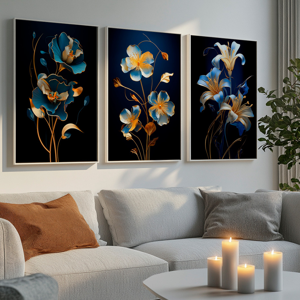 Este conjunto de três telas apresenta flores estilizadas em tons sofisticados de azul e dourado sobre fundo escuro, criando um contraste marcante e extremamente elegante. As formas delicadas e os traços fluidos remetem à arte contemporânea, transmitindo requinte, leveza e profundidade visual.