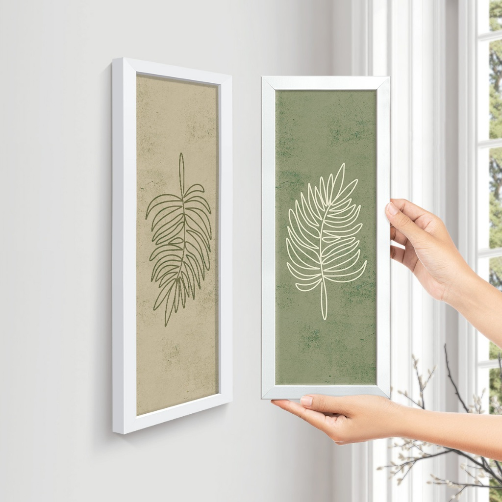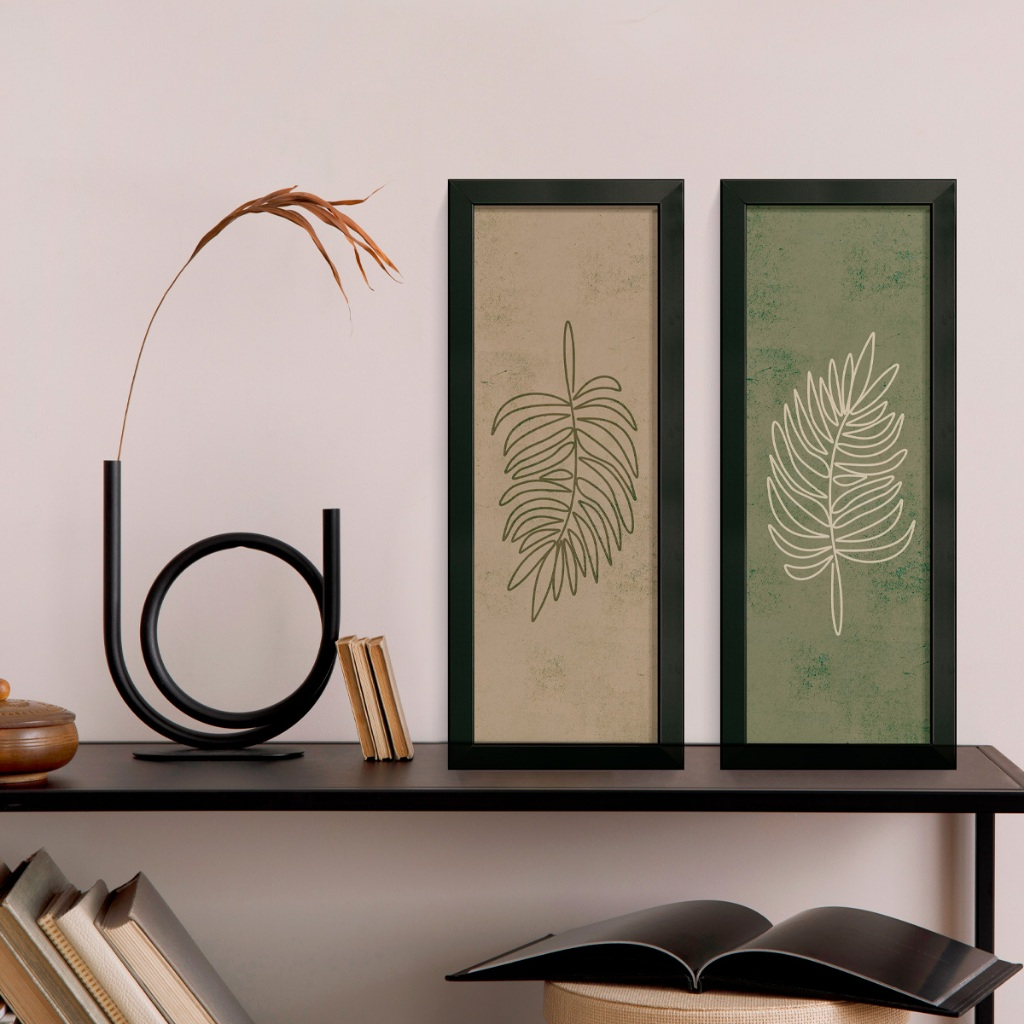 Este conjunto de duas telas apresenta ilustrações botânicas em traços minimalistas, criando um visual leve e sofisticado. Os desenhos de folhas, cada um com personalidade própria, trazem equilíbrio e naturalidade ao ambiente.