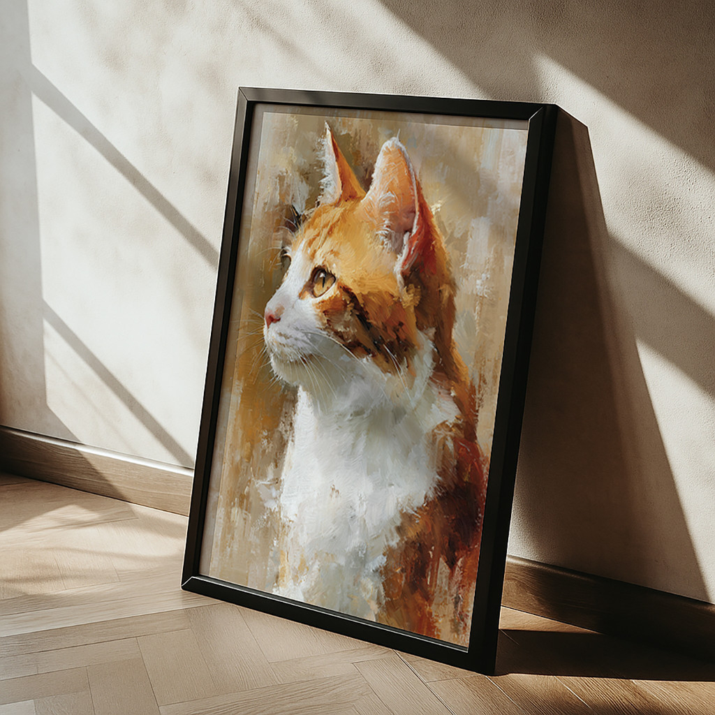 A riqueza visual desta tela impressiona pela técnica de pinceladas expressivas e texturizadas, criando um efeito quase tridimensional que prende o olhar. A paleta de cores acolhedora, que mescla tons vibrantes de laranja, âmbar e branco puro, reflete a luz de maneira extraordinária, conferindo movimento e vibração à pelagem do animal. Envolvida por uma moldura em madeira minimalista, a pintura ganha um contorno contemporâneo e elegante que valoriza o estilo da decoração.