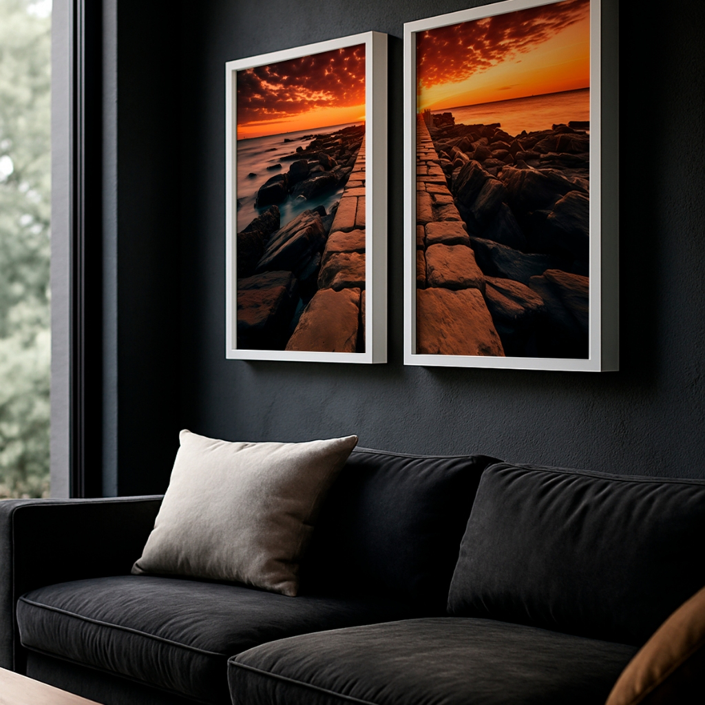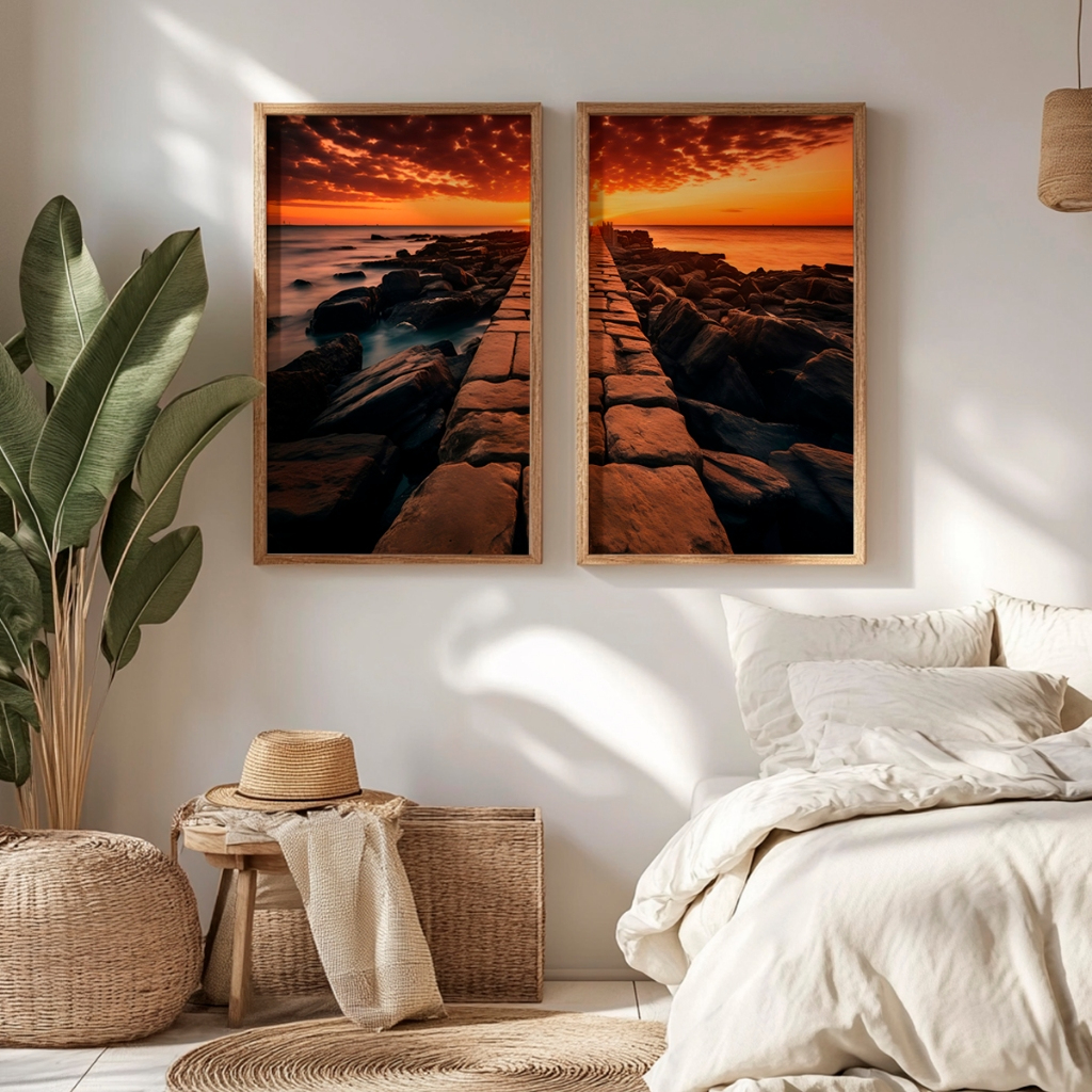 A força desta composição reside no contraste magistral entre o céu em chamas, pintado em tons vibrantes de laranja e carmesim, e as rochas escuras e texturizadas do quebra-mar. A divisão estratégica em duas telas cria uma perspectiva linear hipnotizante que guia o olhar para o infinito, enquanto as molduras em madeira emolduram este espetáculo de luz como uma joia preciosa. É a união perfeita entre a força bruta da natureza e o design contemporâneo refinado.