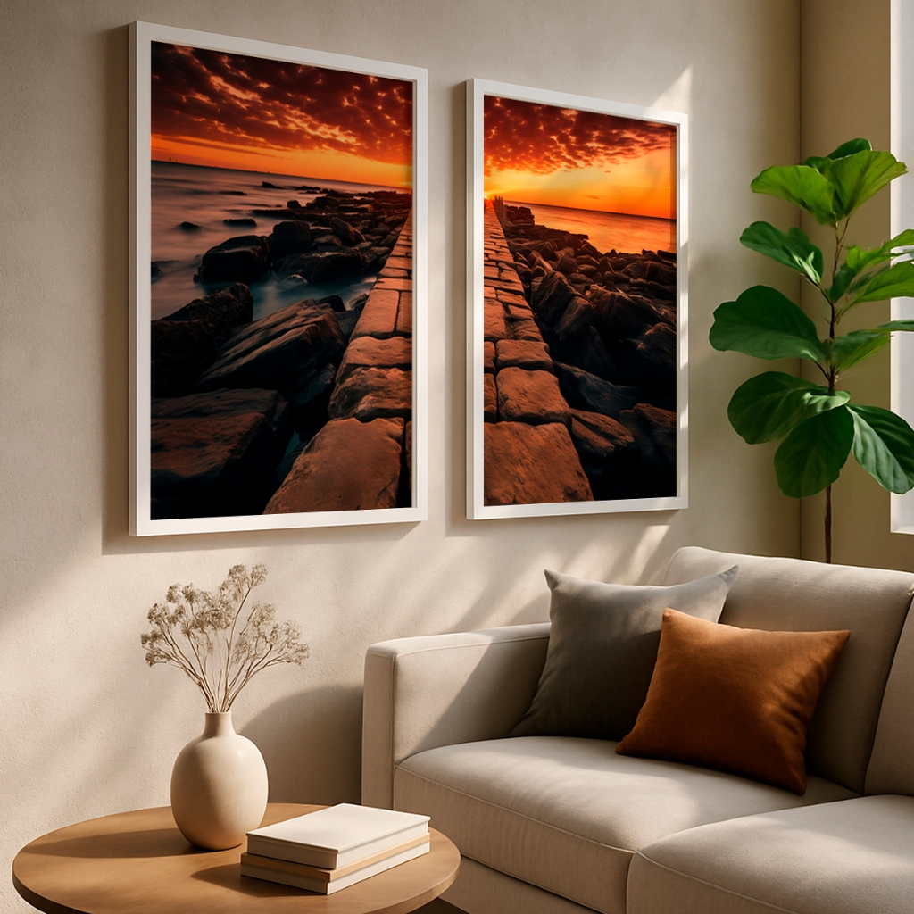 Dê as boas-vindas a uma experiência visual que transcende o tempo com o díptico Horizonte Incandescente. Este conjunto não é apenas uma imagem; é um portal diário para a serenidade épica de um pôr do sol inesquecível. Imagine chegar em casa após um dia longo e ser recebido por essa explosão de cores quentes e pela promessa silenciosa do horizonte sem fim, trazendo calma e inspiração instantâneas para o seu espaço.