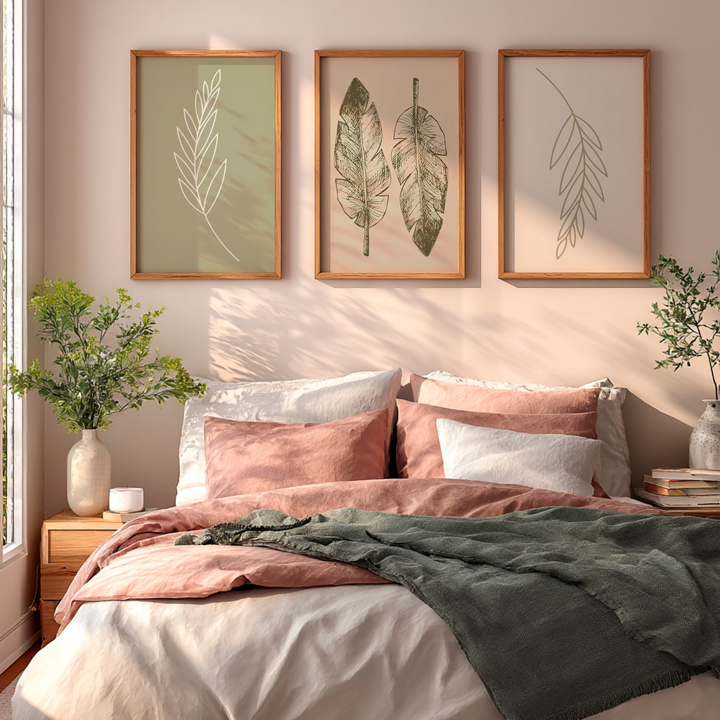 Este trio de quadros combina delicadeza, suavidade e um toque natural que transforma qualquer ambiente em um espaço mais acolhedor. Com folhas, penas estilizadas e traços orgânicos, as peças se complementam de forma equilibrada, criando uma composição leve e elegante.