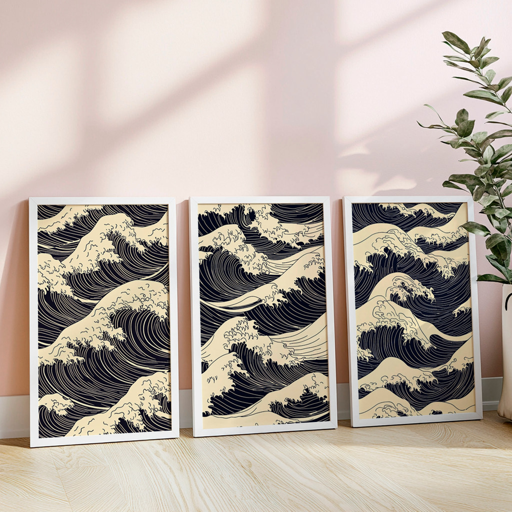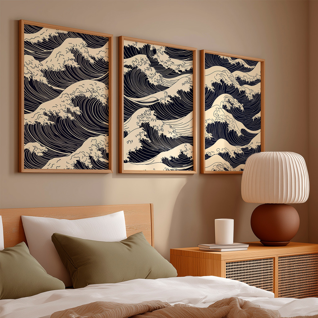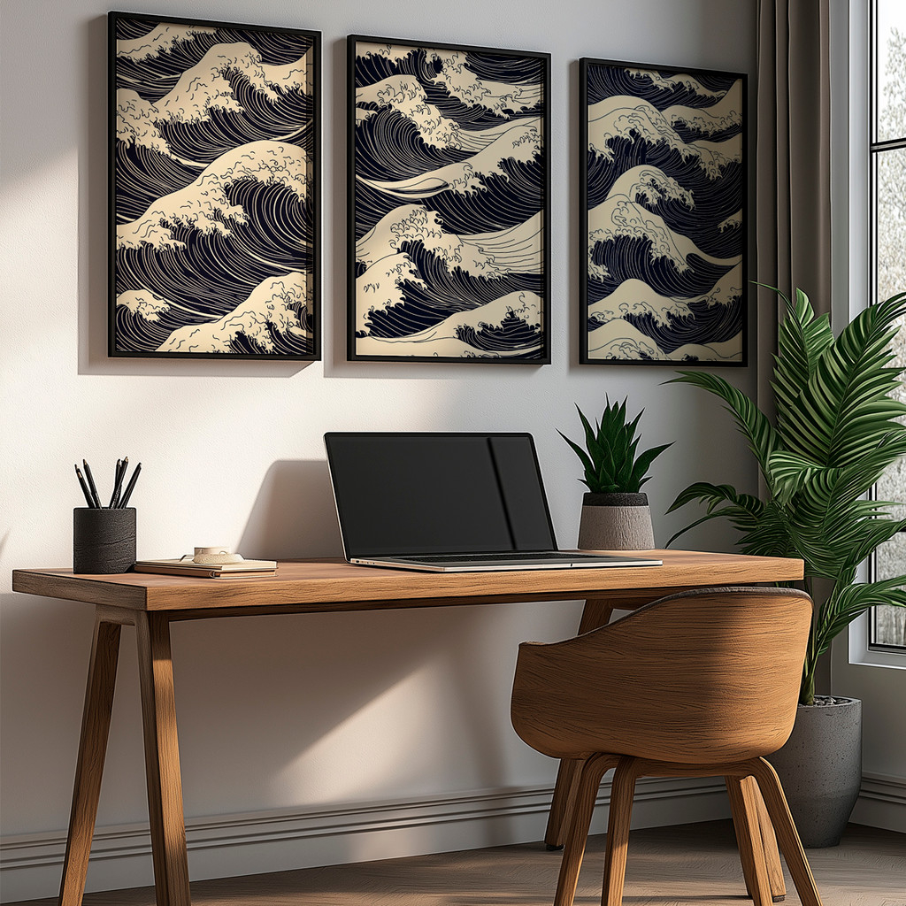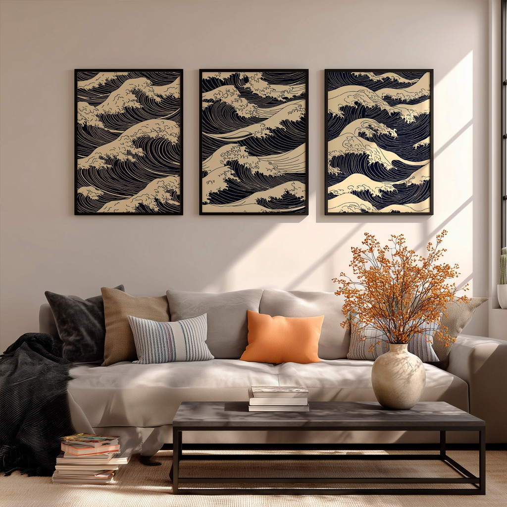 Este trio de quadros traz a beleza imponente das ondas representadas em um estilo artístico clássico, marcado por traços fortes e movimento fluido. A composição cria um impacto visual envolvente, preenchendo o ambiente com energia, dinamismo e elegância.