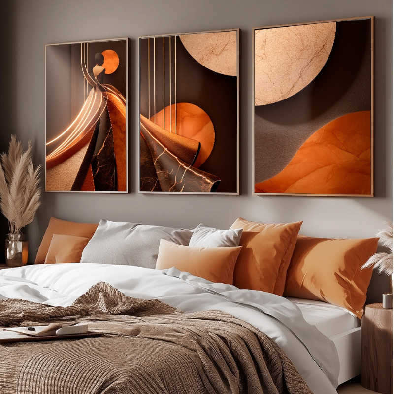 O Quadro Minimalismo Dinâmico traduz a harmonia entre arte e energia através de formas fluídas e tons quentes que remetem ao pôr do sol. Cada painel reflete o brilho do dourado e do cobre em perfeita sintonia, criando uma atmosfera acolhedora e sofisticada no ambiente. Uma peça que convida à contemplação e à sensação de conforto.