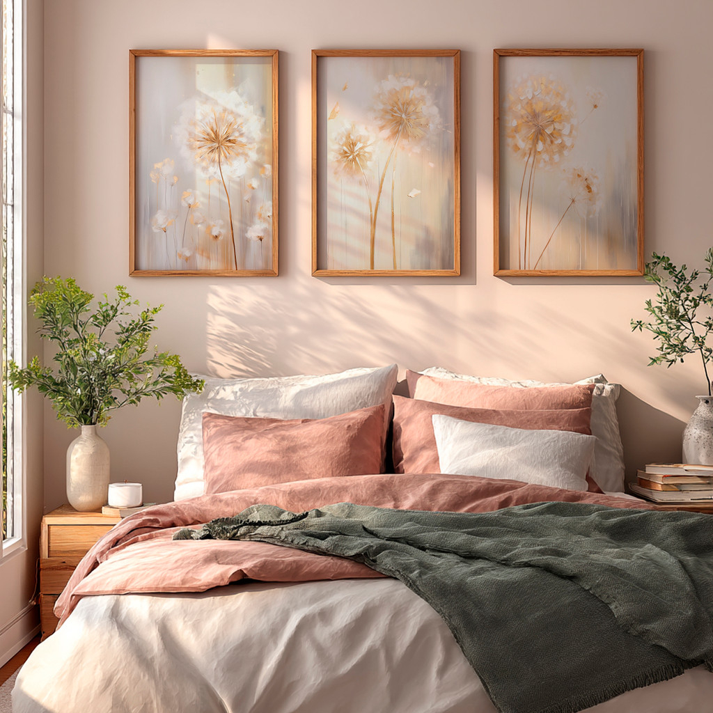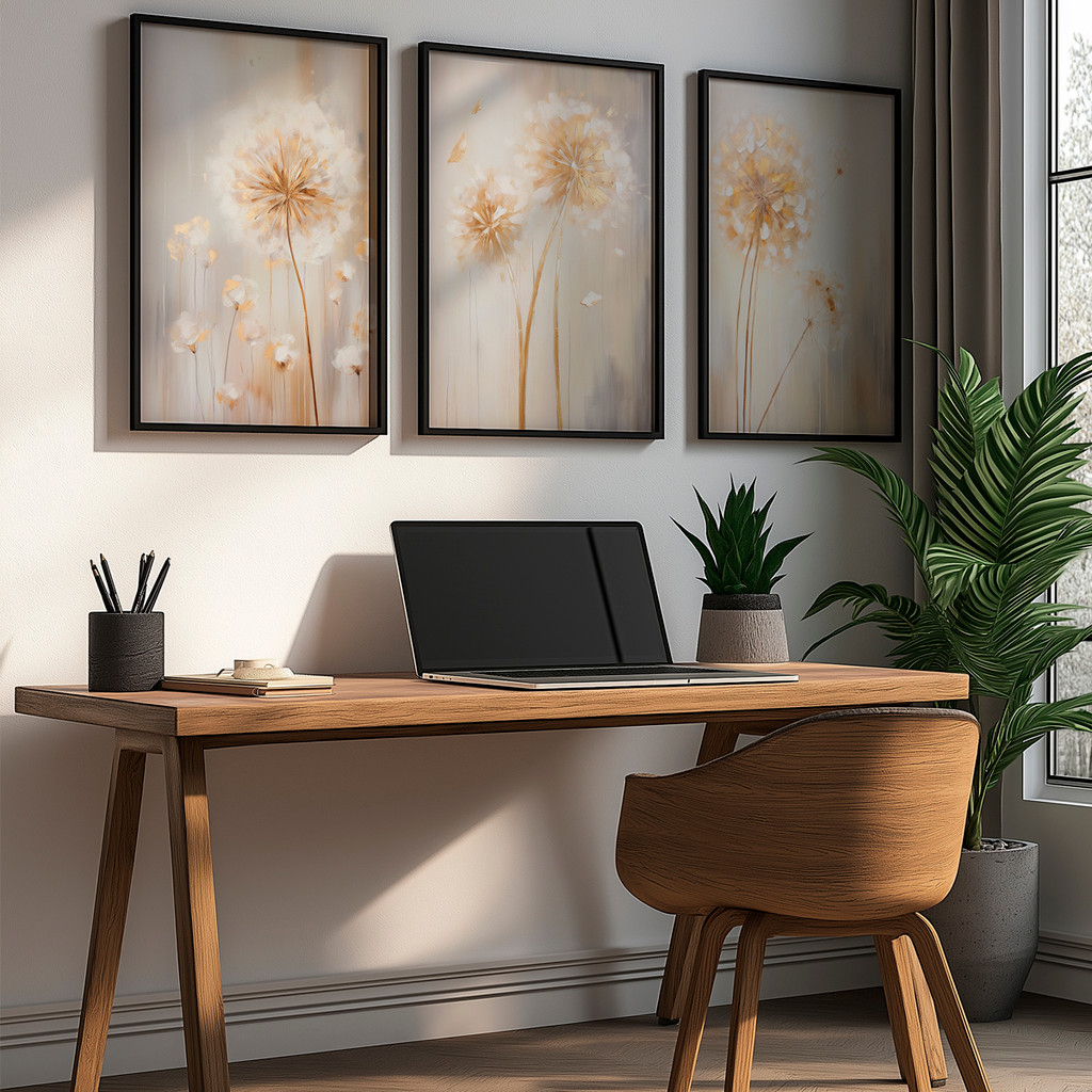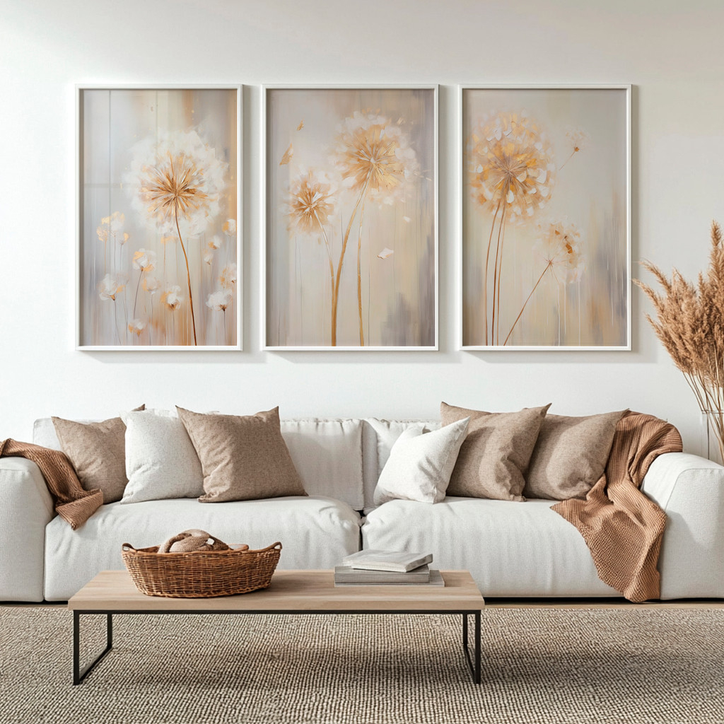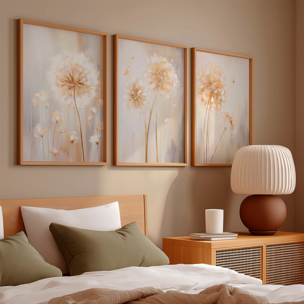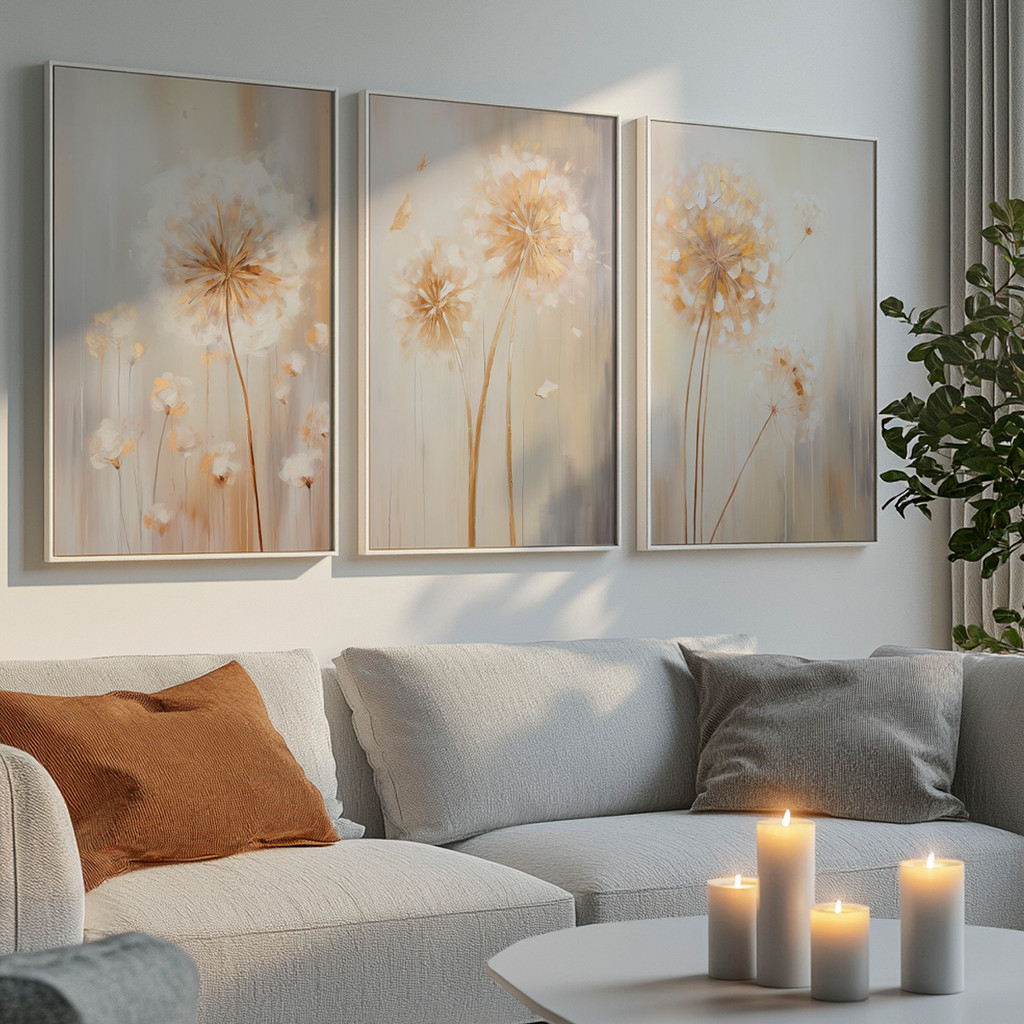 Ilumine seu ambiente com a sofisticação acolhedora deste conjunto que captura a essência da 'Golden Hour'. Inspirado na leveza dos campos de dentes-de-leão banhados pelo sol poente, esta obra irradia uma energia calorosa, transformando paredes frias em pontos de conforto visual imediato e requinte absoluto.