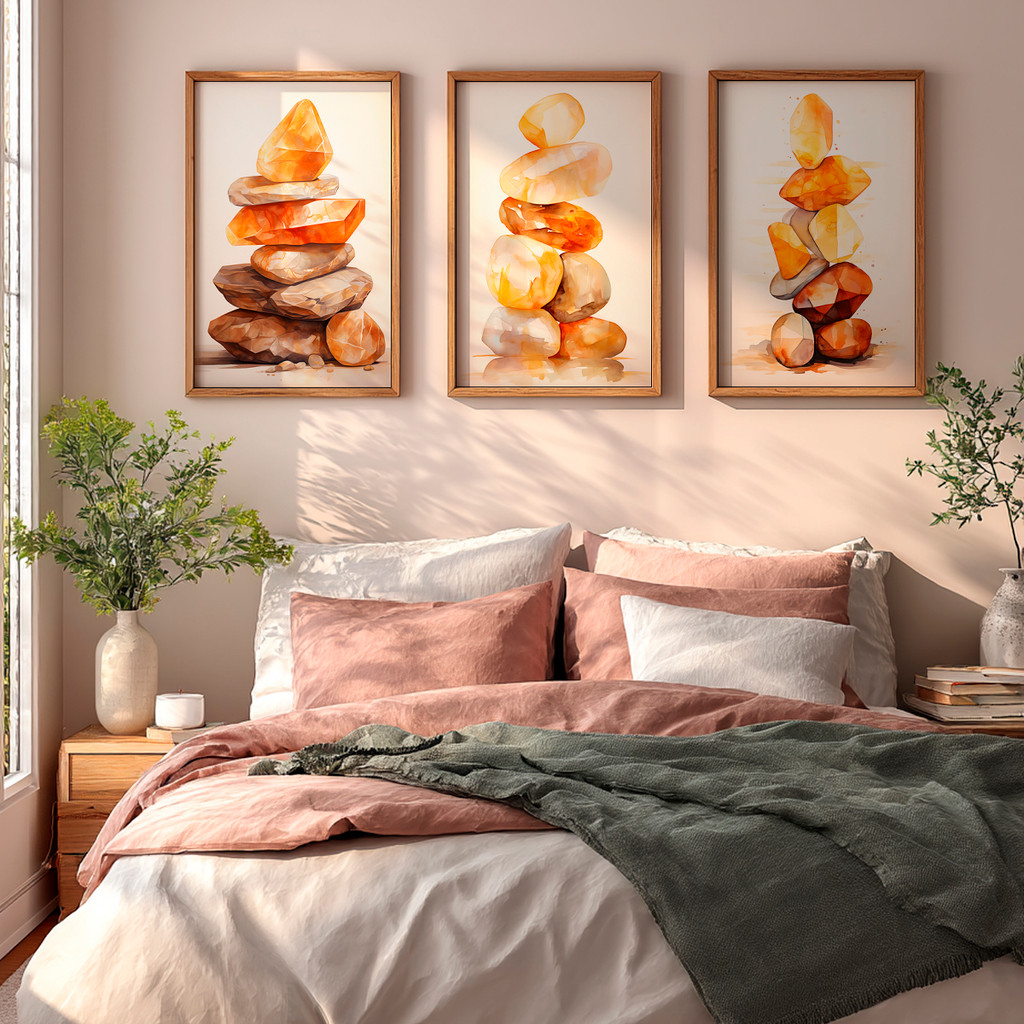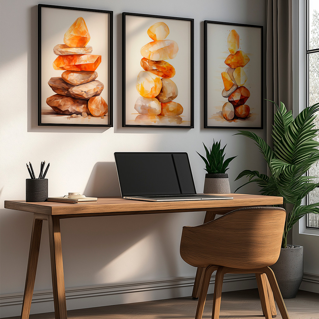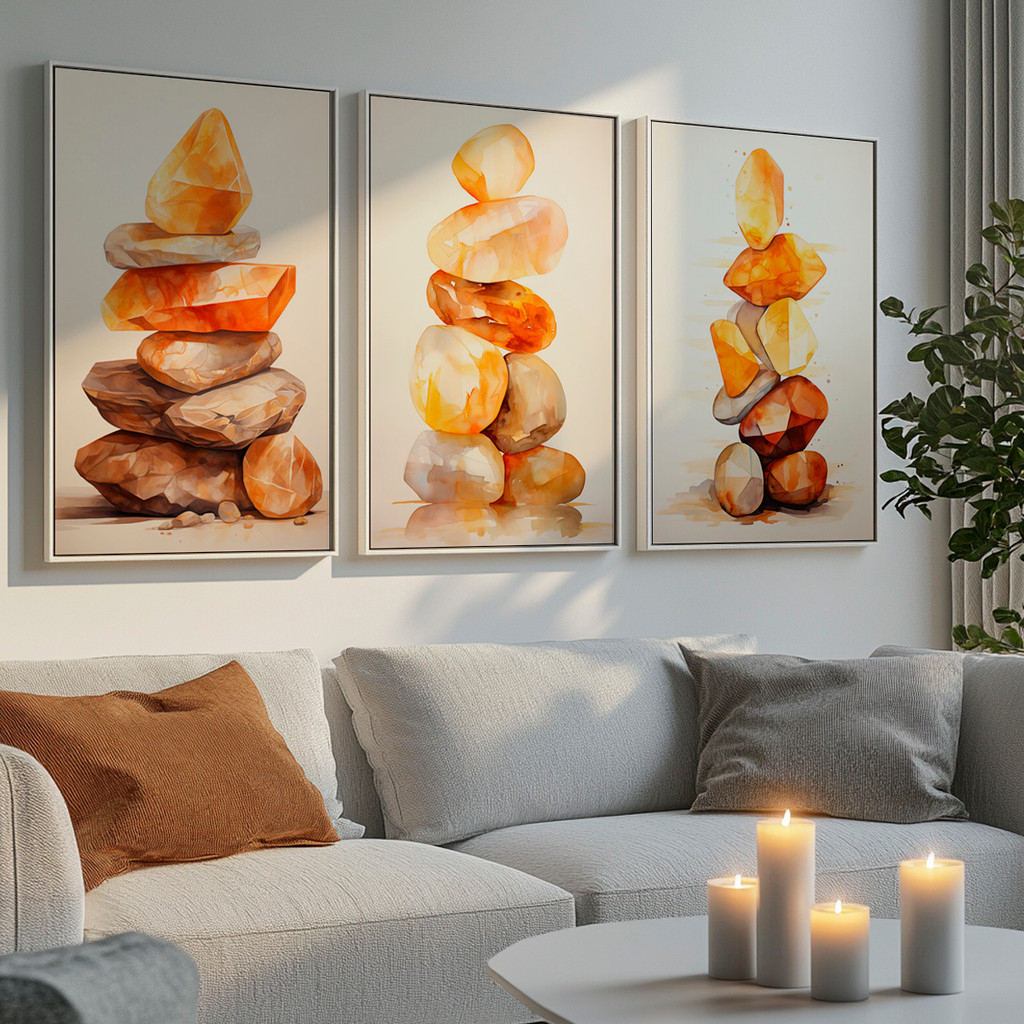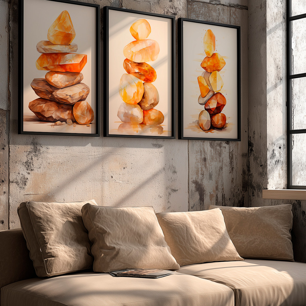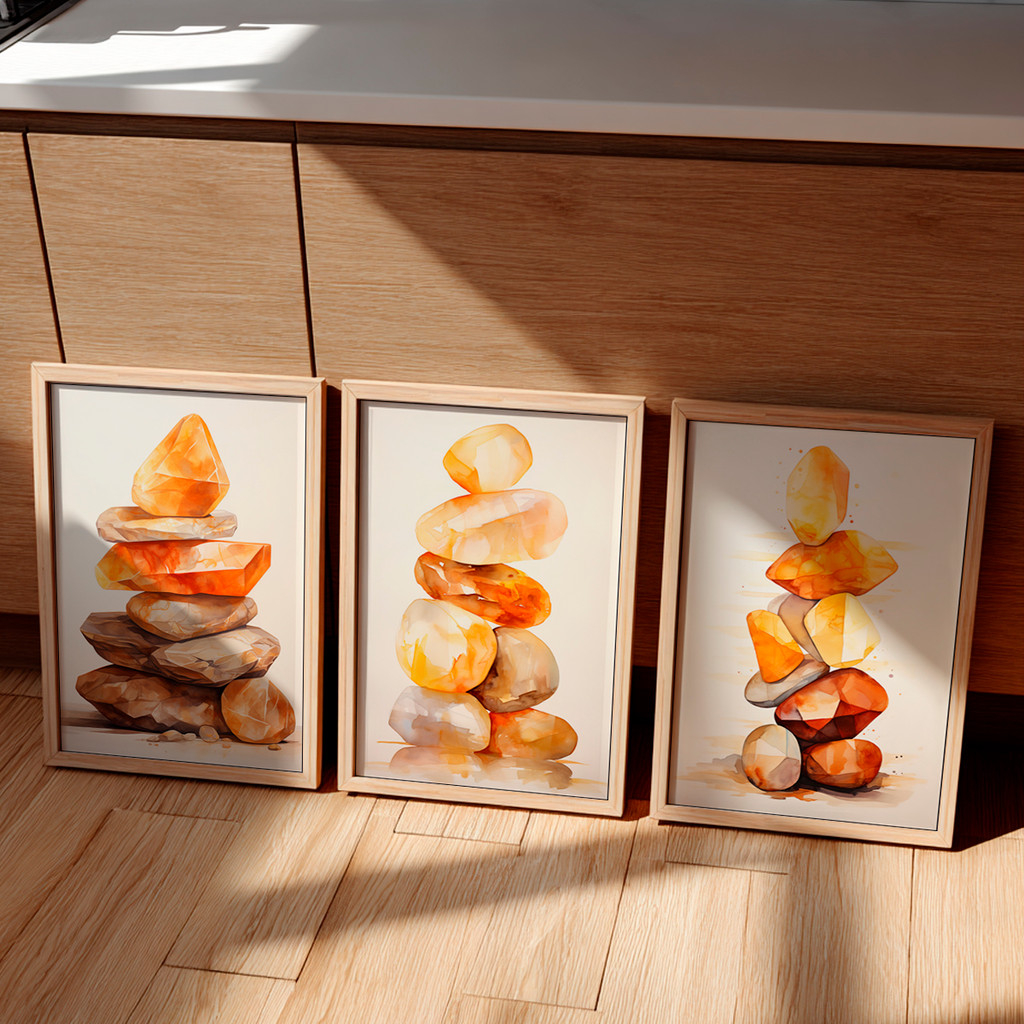 Este conjunto de três telas traz uma composição sofisticada e contemporânea, inspirada no equilíbrio e na harmonia das formas naturais. As pedras em tons âmbar e terrosos criam uma sensação de estabilidade e calma, tornando o ambiente mais acolhedor e elegante.
