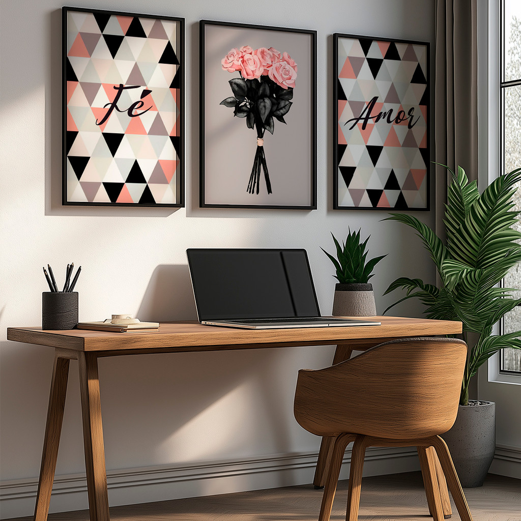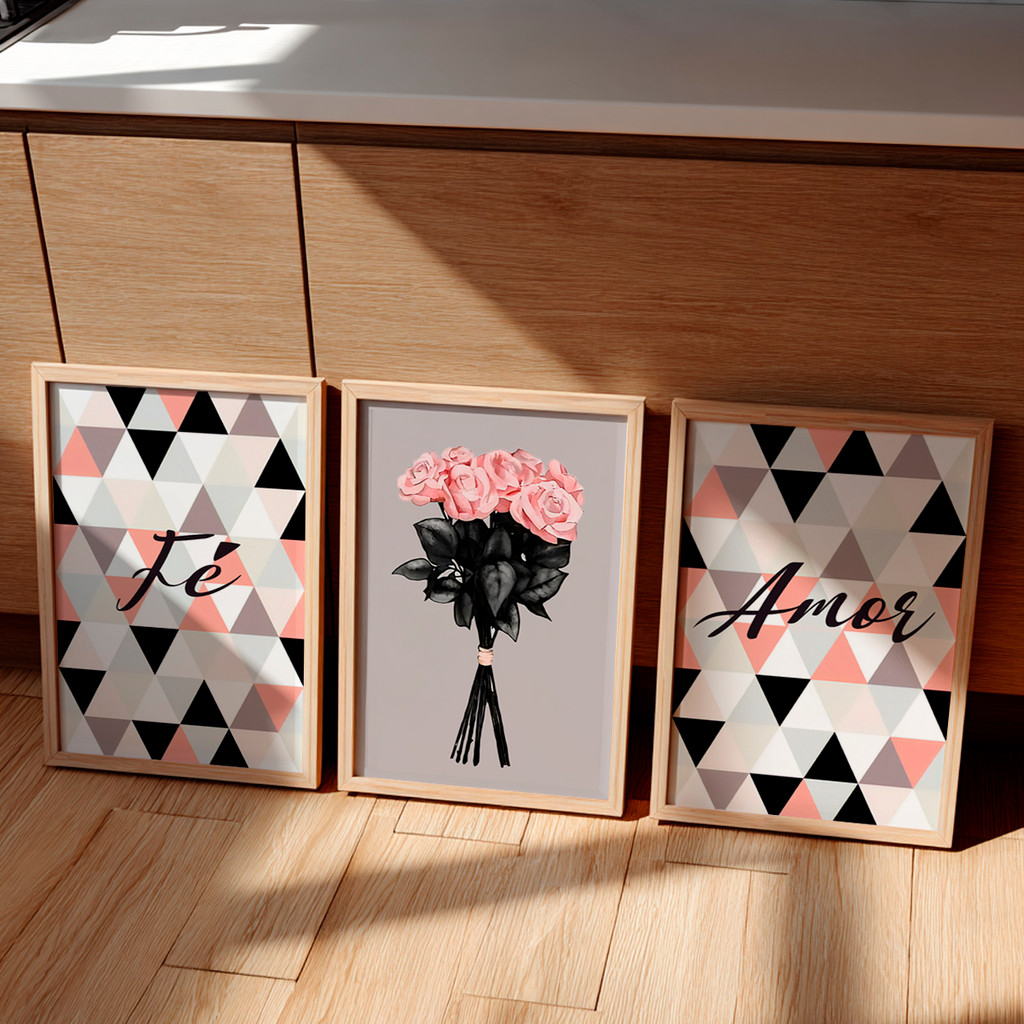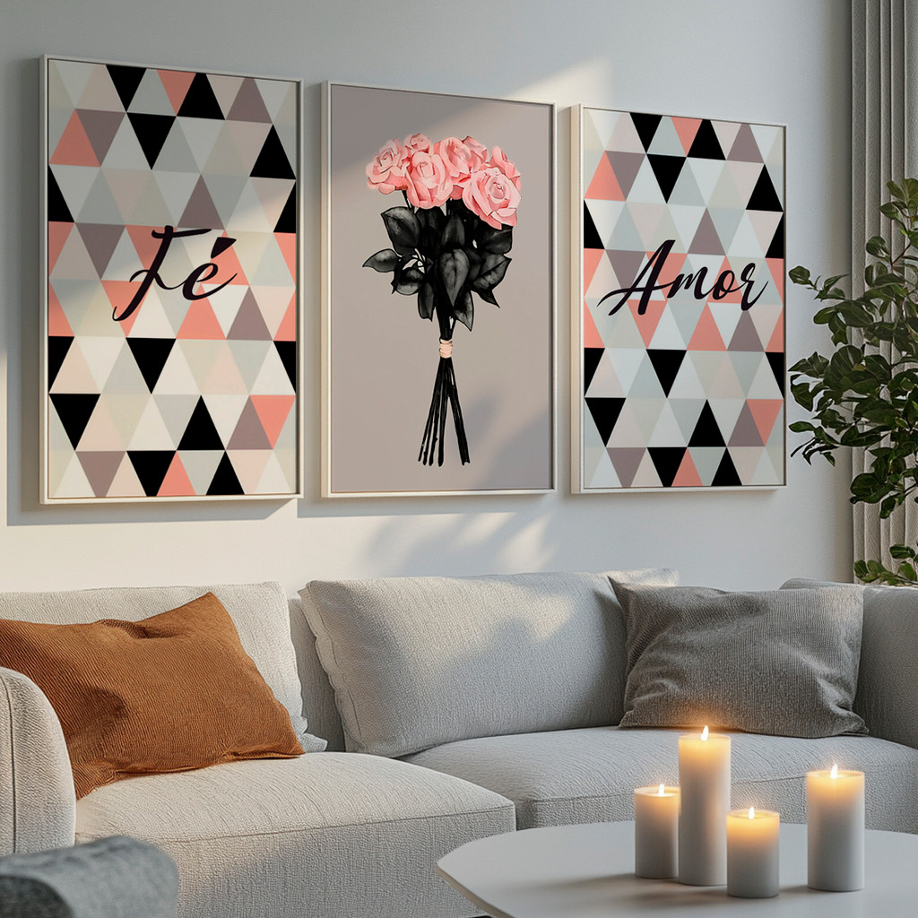 O Quadro Fé e Amor une arte contemporânea e significado emocional em uma composição delicada e sofisticada. As telas laterais apresentam padrões geométricos modernos acompanhados das palavras “Fé” e “Amor”, enquanto a tela central traz um buquê floral elegante, simbolizando carinho, esperança e conexão.