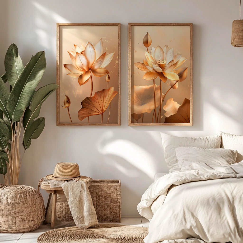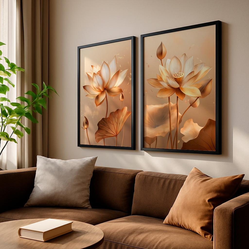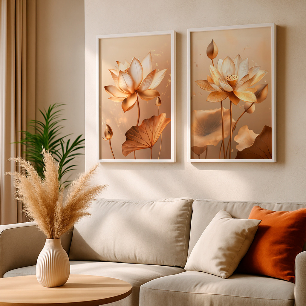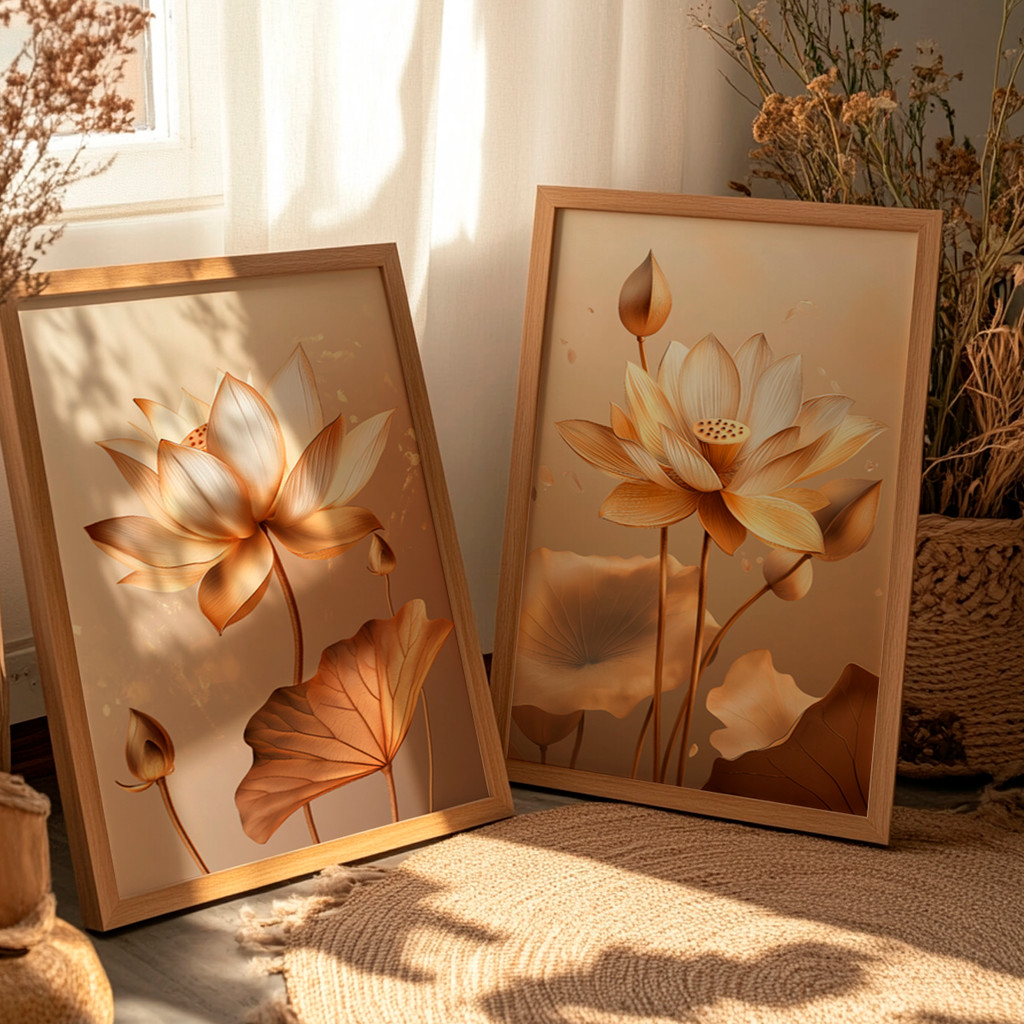 O Quadro Com Moldura Flor Dourada traz a delicadeza e a simbologia da flor de lótus em uma composição elegante e acolhedora. As ilustrações apresentam formas suaves e tons quentes que transmitem serenidade, equilíbrio e sofisticação ao ambiente, criando um ponto de destaque visual sem perder a leveza.