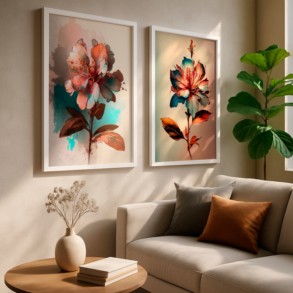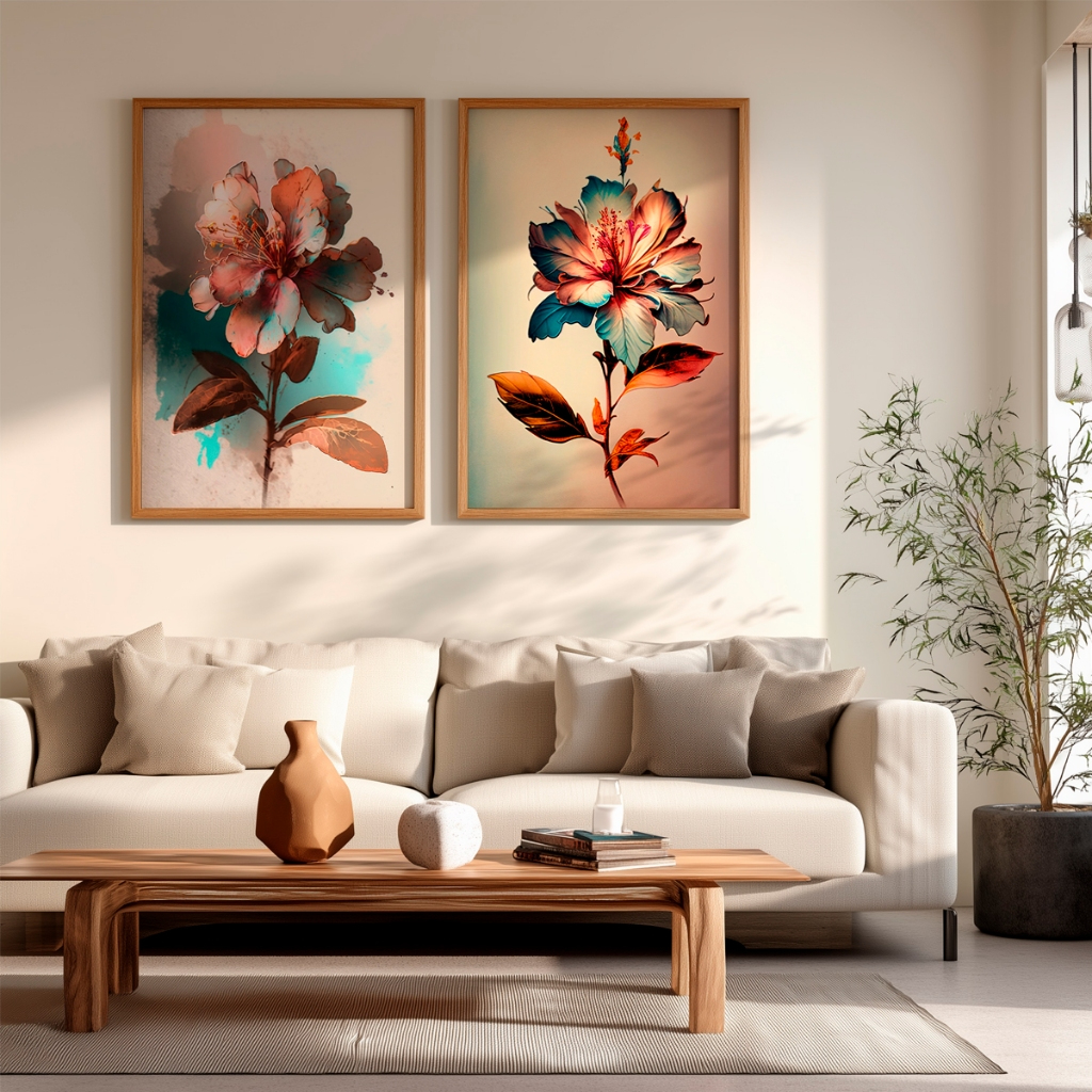 Este conjunto de dois quadros traz a beleza das flores reinterpretada de forma artística e contemporânea, unindo cores intensas e traços delicados que criam uma composição elegante e cheia de personalidade. As formas orgânicas e os contrastes sutis tornam a arte envolvente e visualmente marcante.