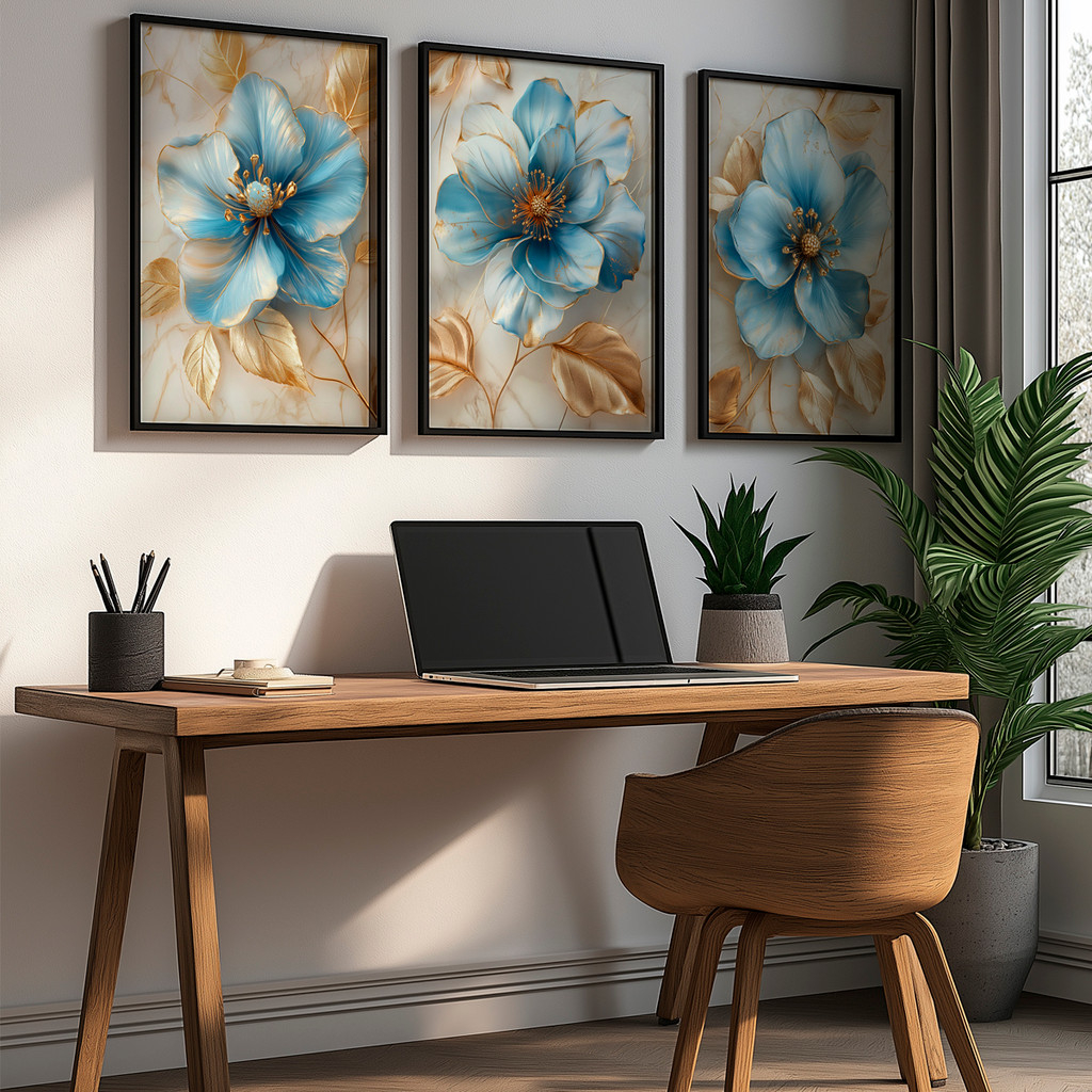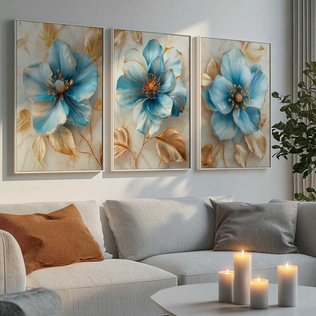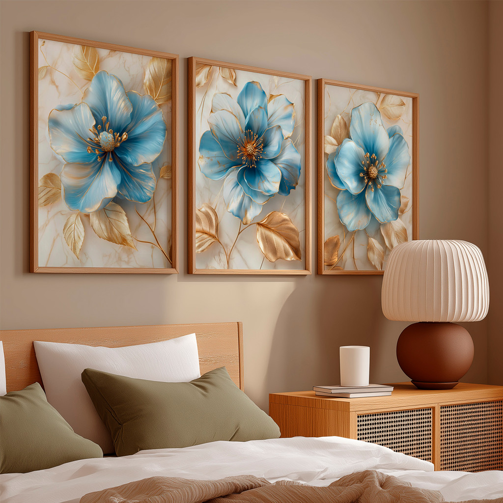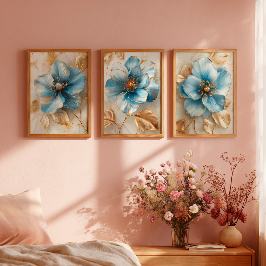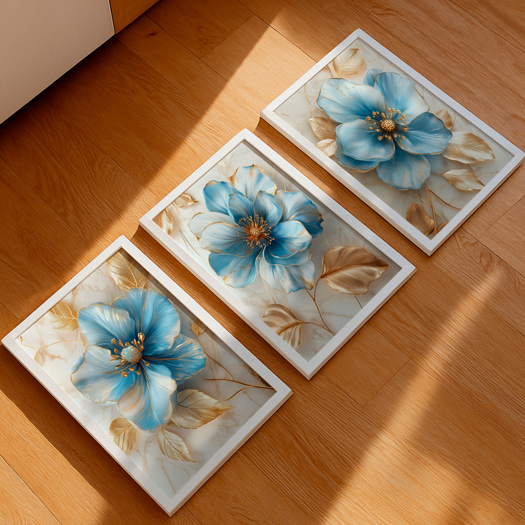 Este conjunto de três telas traz flores imponentes em tons de azul suave com detalhes em dourado, criando uma composição sofisticada e delicada ao mesmo tempo. As pétalas apresentam efeito artístico com leve textura, enquanto as folhas douradas adicionam elegância e um toque refinado à obra.