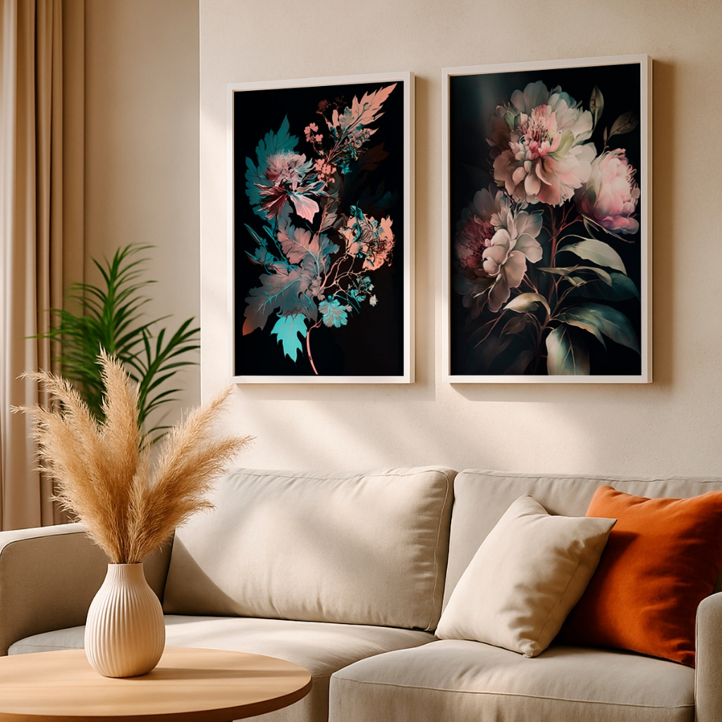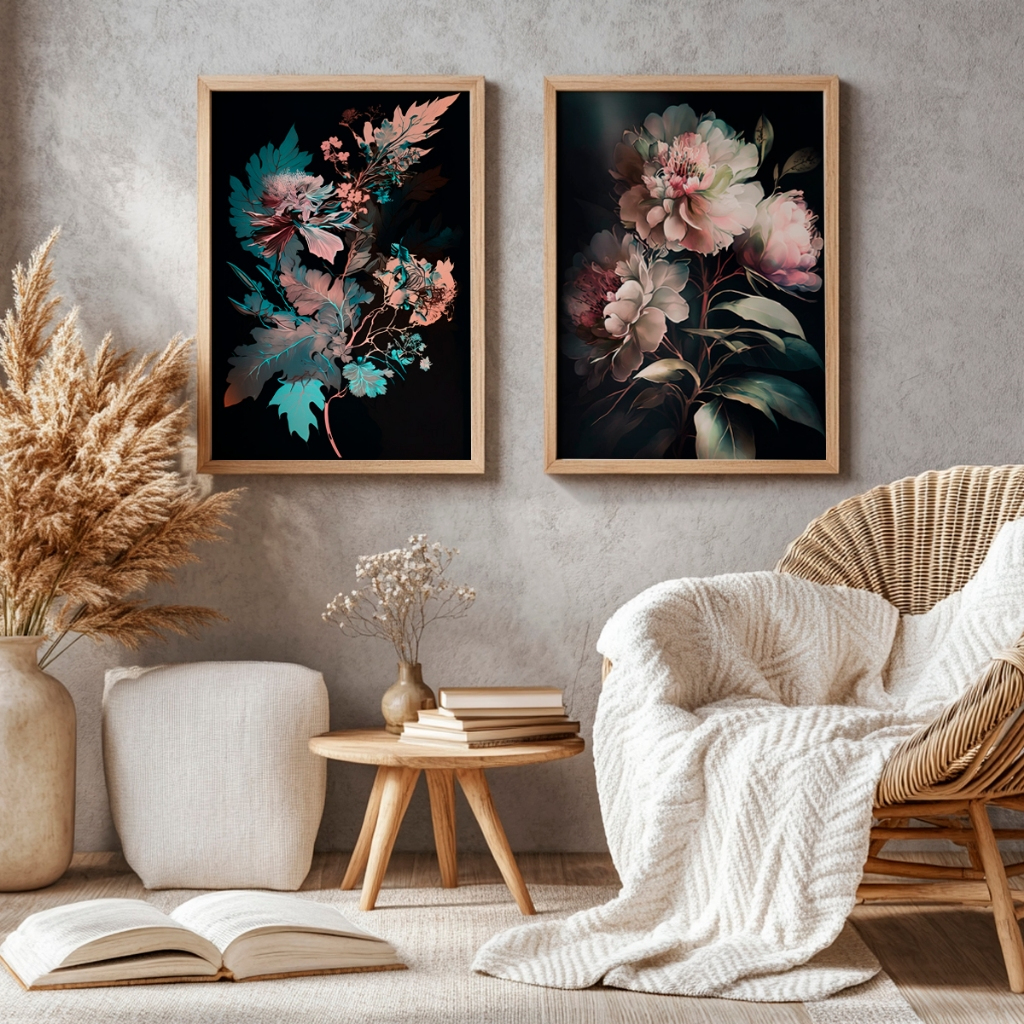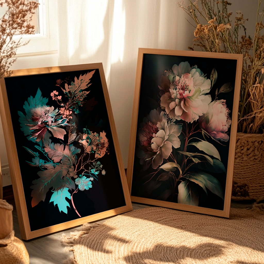 Este conjunto artístico apresenta flores exuberantes em uma composição sofisticada, onde os tons suaves e orgânicos ganham ainda mais destaque sobre o fundo escuro. A iluminação e os contrastes criam profundidade visual, resultando em um efeito elegante e contemporâneo que chama a atenção de forma sutil.