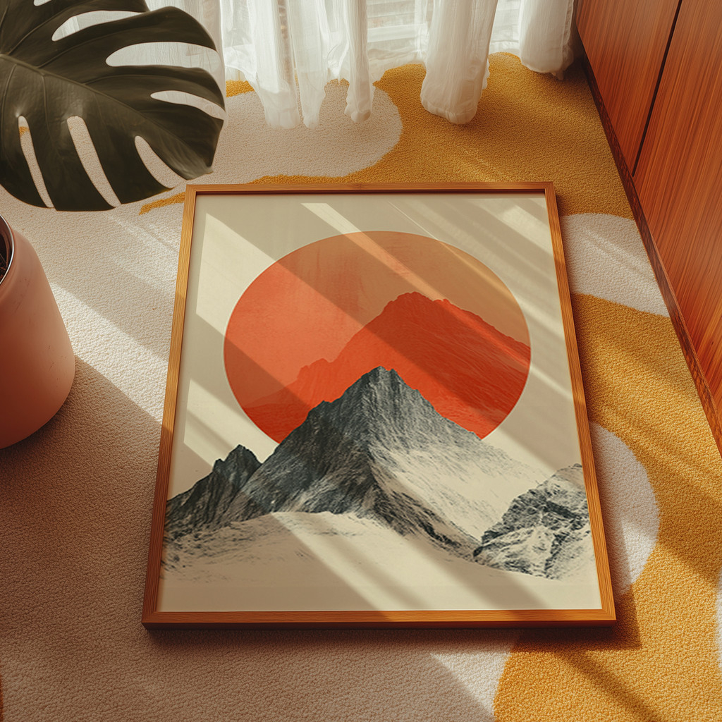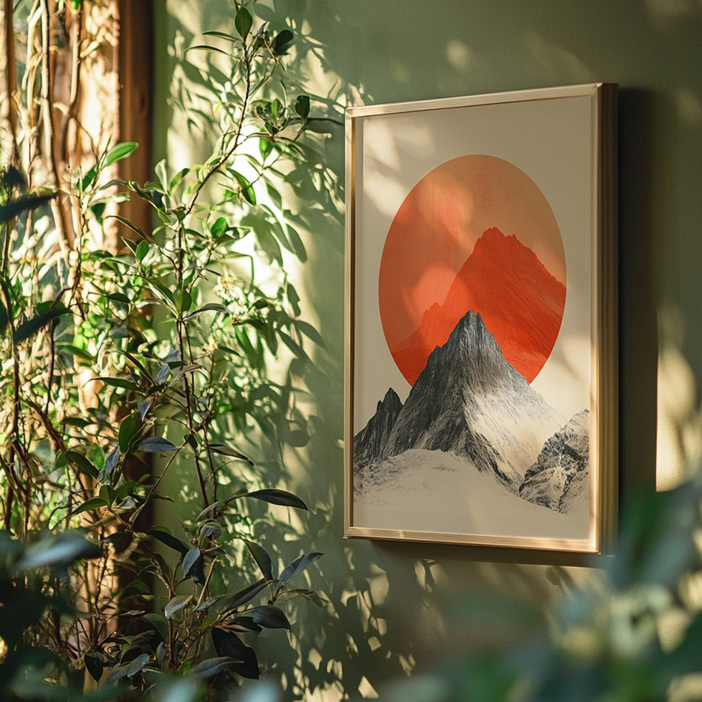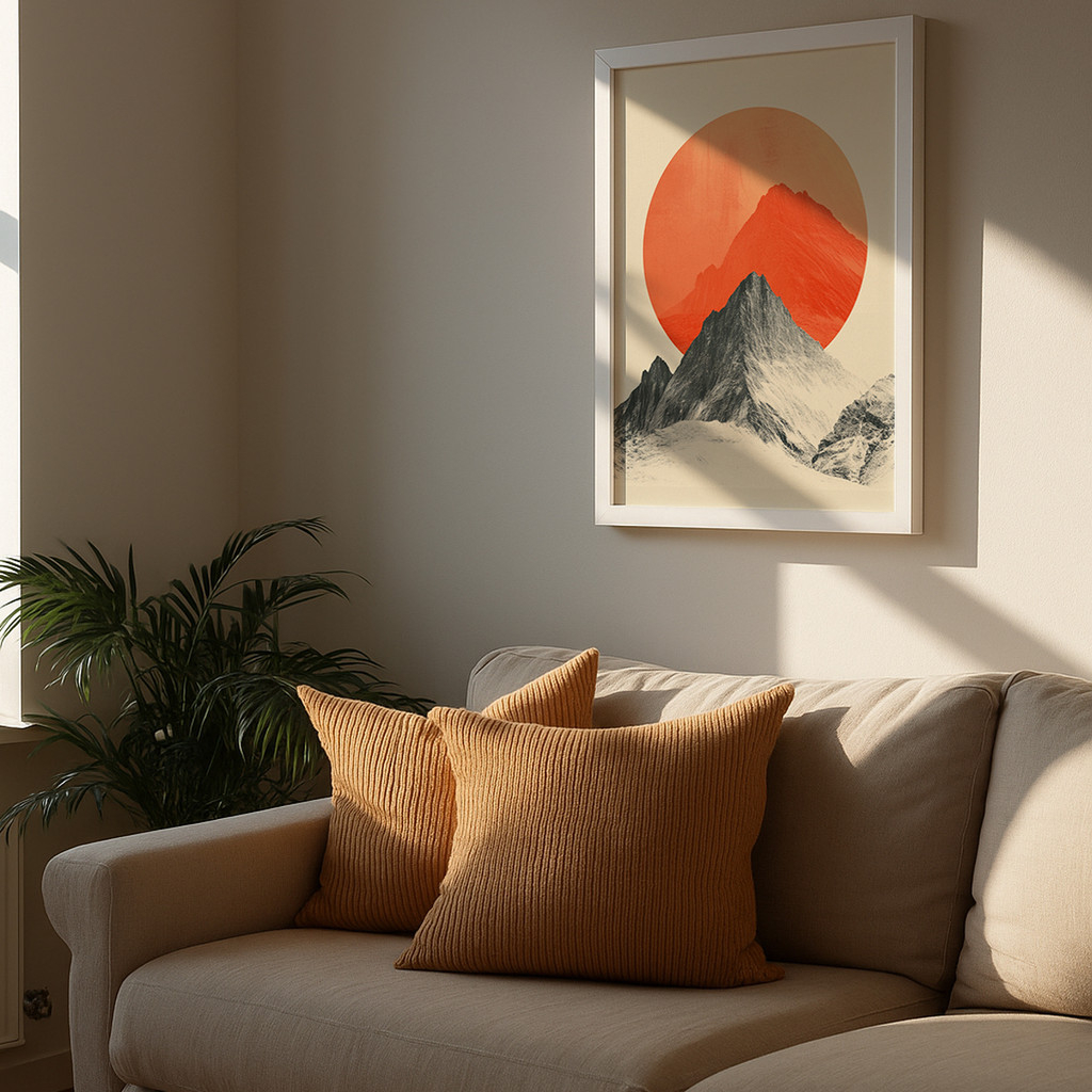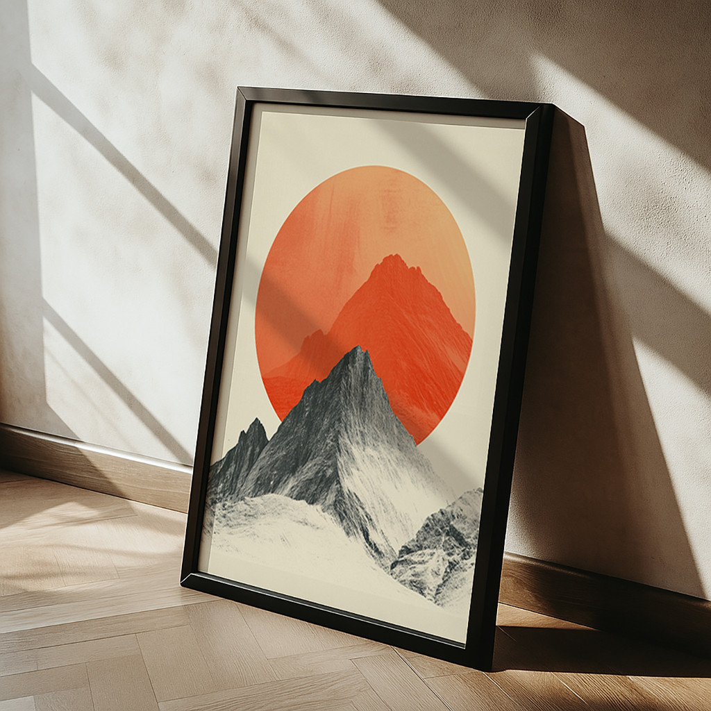 Deixe-se hipnotizar pelo jogo de contrastes genial desta composição geométrica. Em primeiro plano, um pico montanhoso ricamente texturizado em tons de preto e cinza ergue-se com imponência realista, criando um contraponto ousado com a silhueta alaranjada ao fundo. A grandiosa esfera solar em um vibrante tom de terracota domina a cena, irradiando uma sensação de luz e aquecimento sobre o fundo off-white.