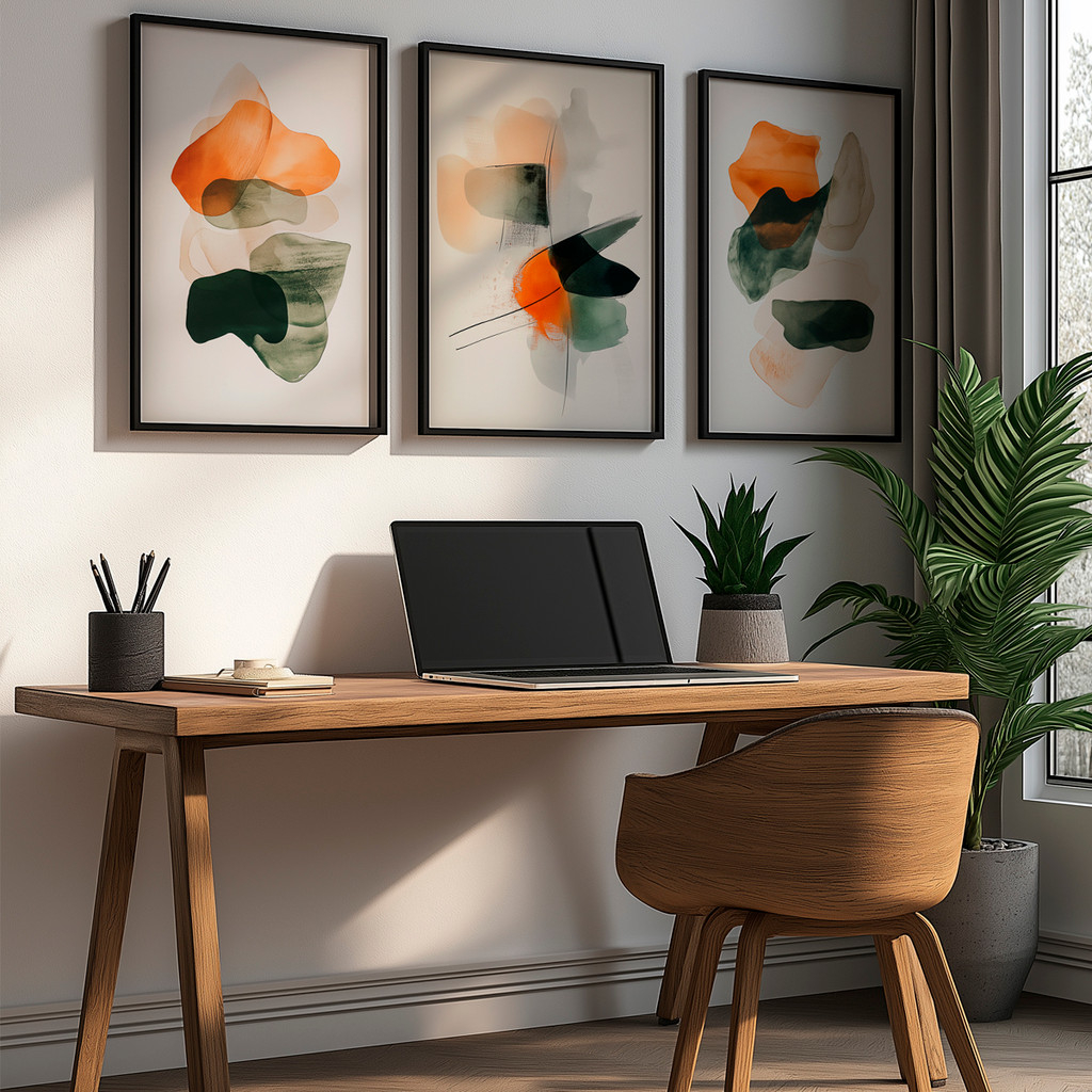 A combinação de tons terrosos, verdes profundos e nuances quentes confere modernidade e aconchego ao ambiente. Esse conjunto é perfeito para escritórios, salas de estar, quartos ou home offices, agregando personalidade e estilo de forma discreta e refinada.