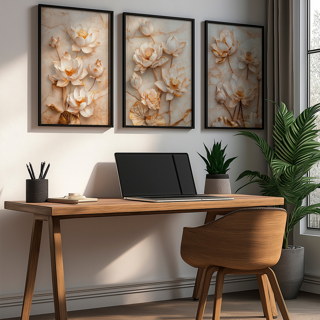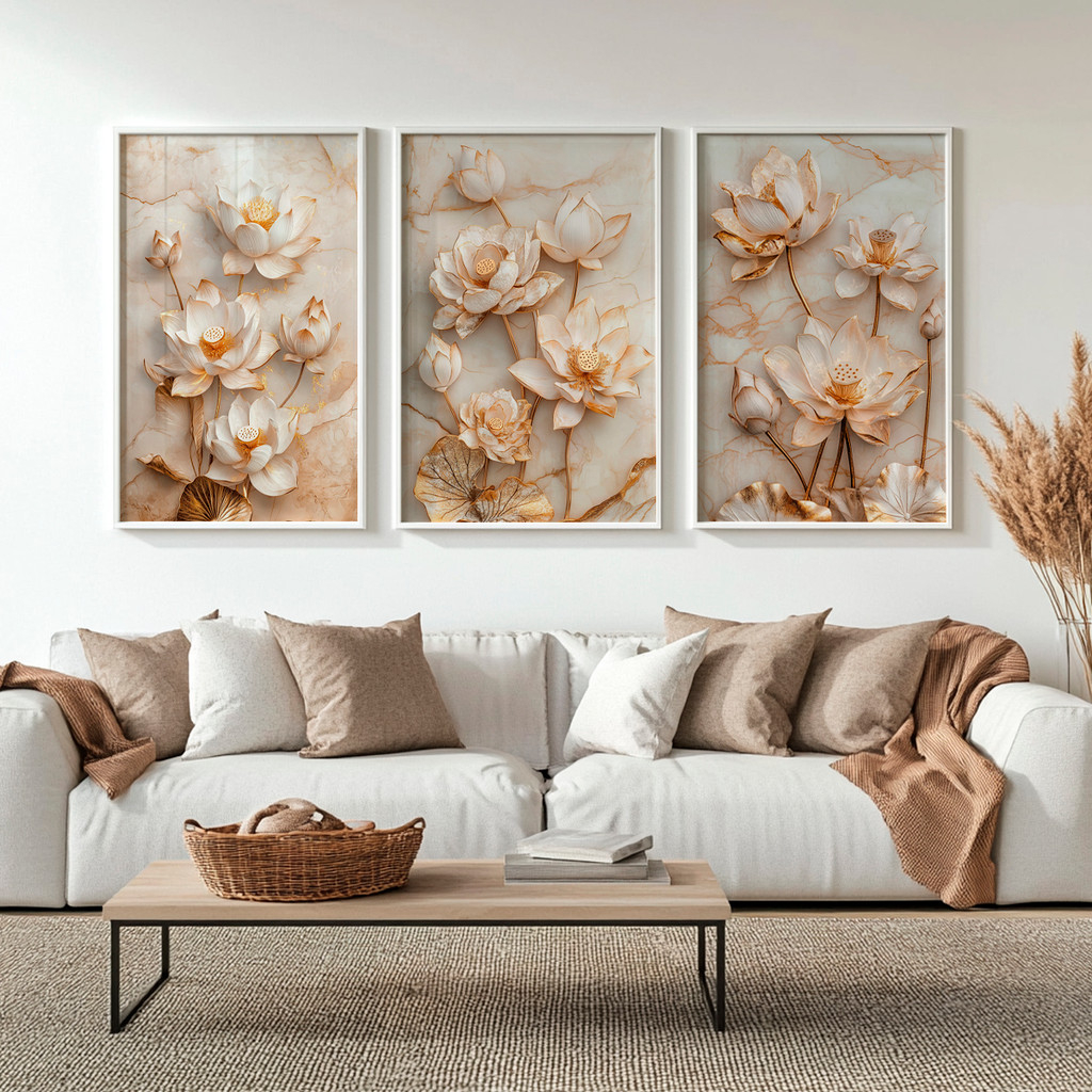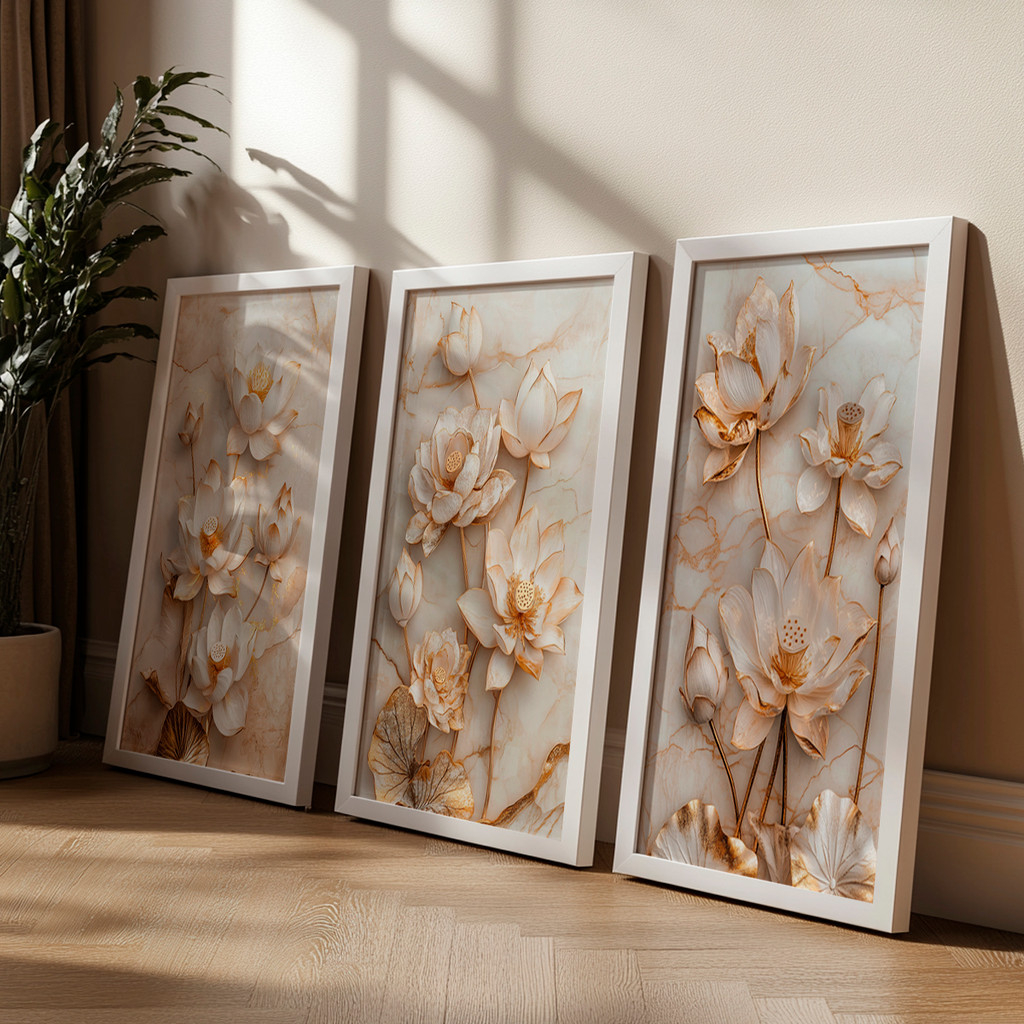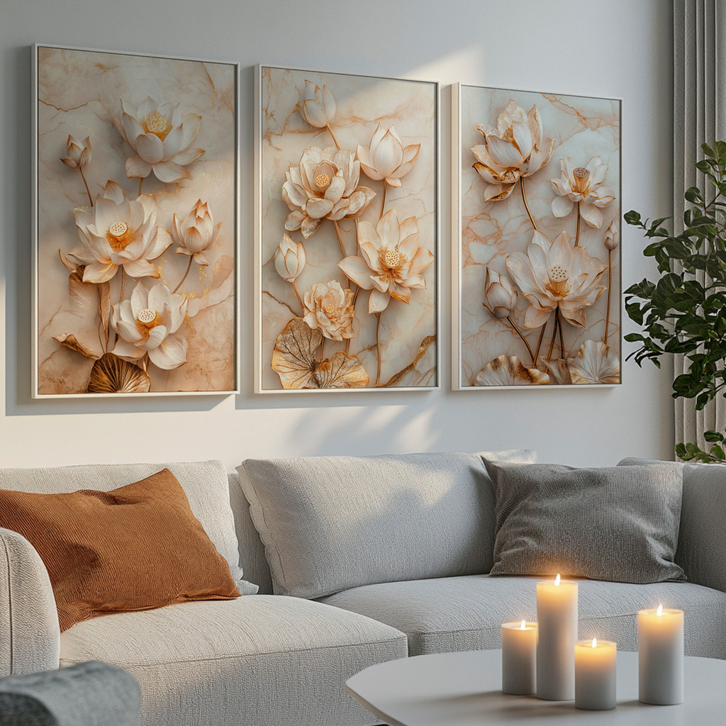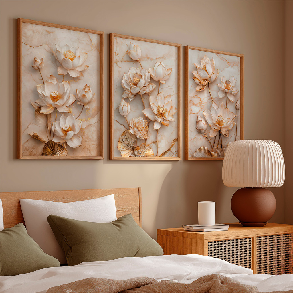 Transforme sua parede em um altar de sofisticação e paz interior com esta obra-prima que transcende a decoração. Inspirado na beleza sagrada da flor de lótus, símbolo universal de pureza e renascimento, este conjunto apresenta um efeito visual tridimensional impressionante, onde cada flor parece ter sido esculpida à mão em porcelana ou gesso nobre.