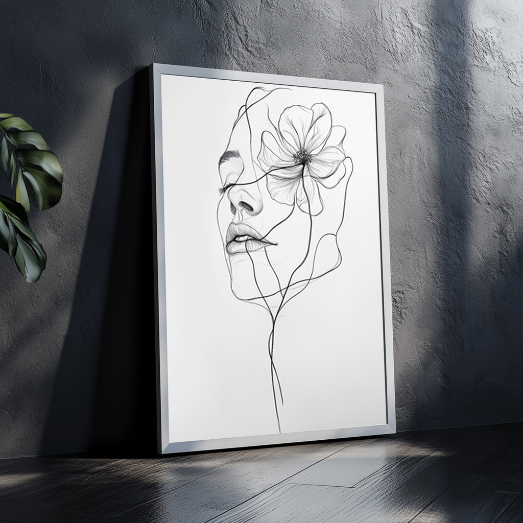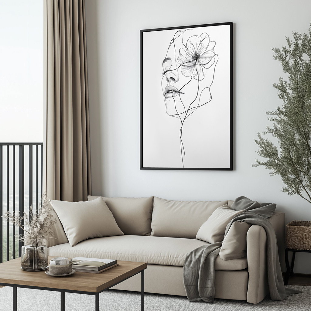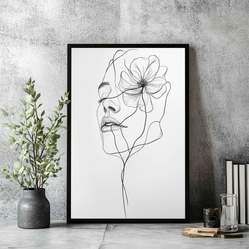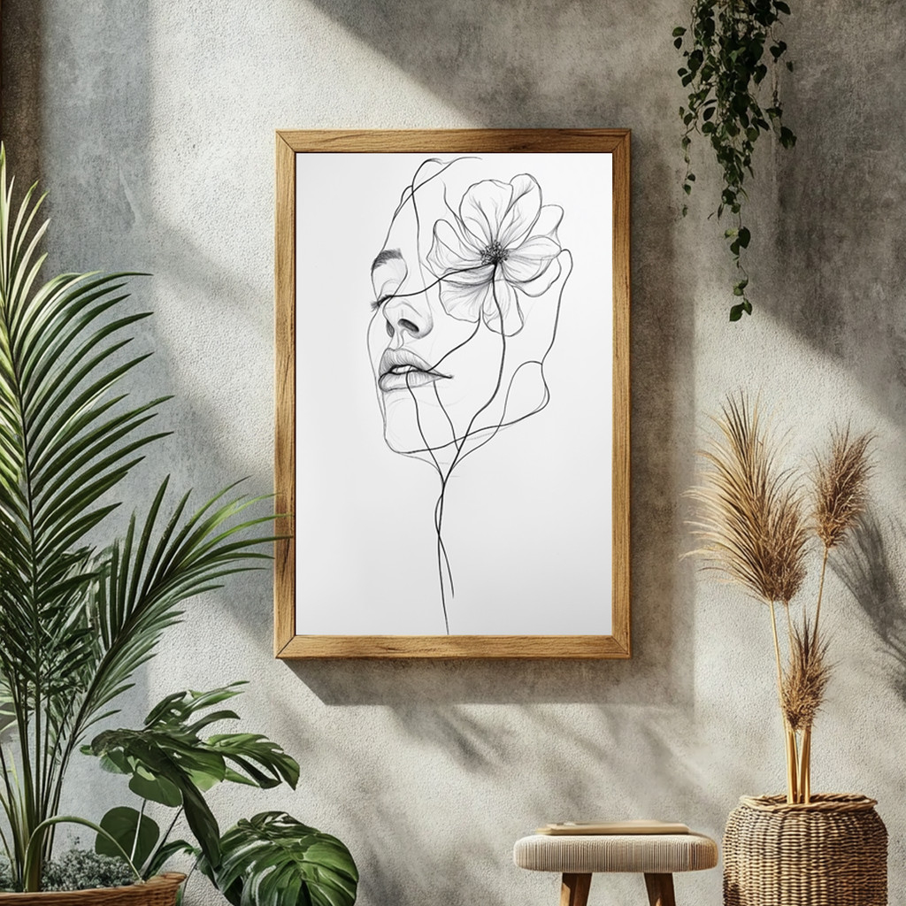O design magistral em "line art" cria um impacto estético absoluto: as linhas fluidas em preto sobre o fundo branco puro entregam uma aparência limpa, moderna e incrivelmente magnética. A flor majestosa que se entrelaça suavemente ao rosto feminino adiciona uma camada de romance e mistério à peça. Envolta por uma moldura em madeira, a composição ganha um calor orgânico formidável, garantindo que o quadro seja o grande destaque tanto em ambientes boho chic quanto em espaços minimalistas e escandinavos.