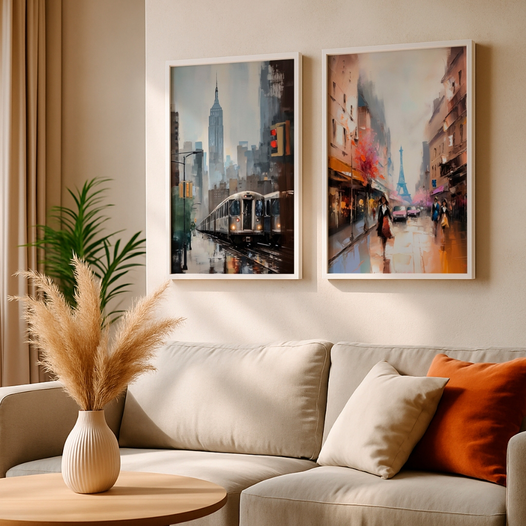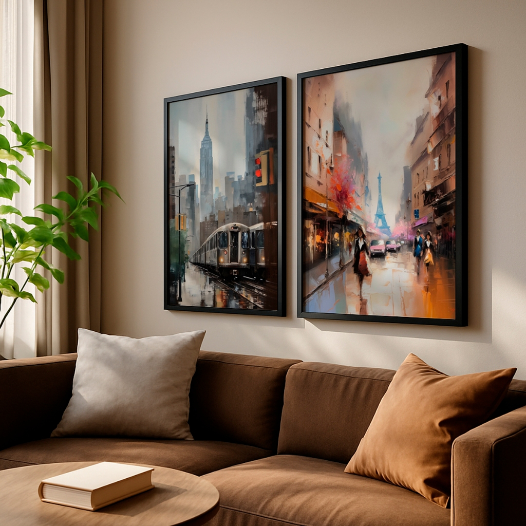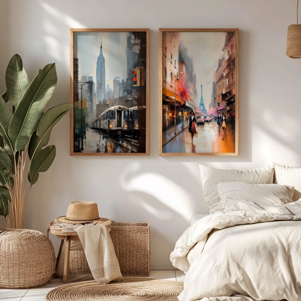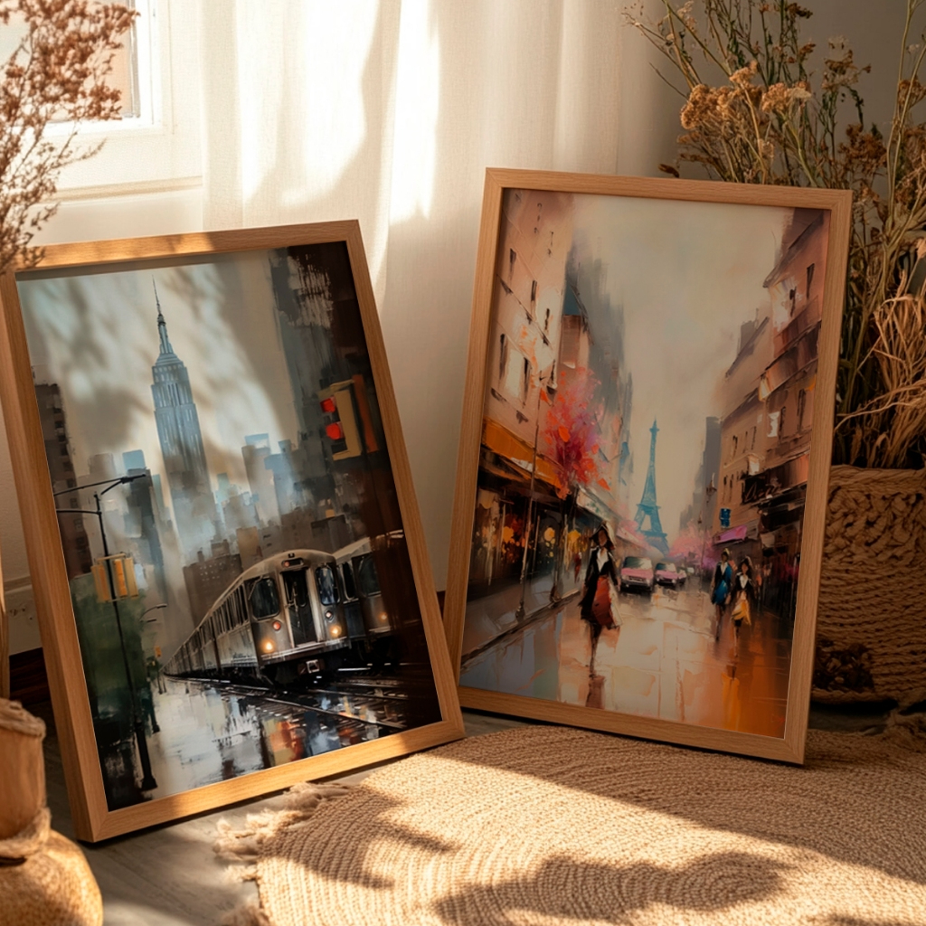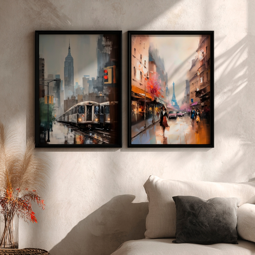 A genialidade desta composição mora no encontro perfeito de duas energias distintas capturadas com uma técnica impressionista de tirar o fôlego. Na tela à esquerda, a pulsação urbana de Nova York é eternizada em tons frios e envolventes de azul e cinza, onde um trem em movimento corta a cidade sob a silhueta imponente do Empire State. À direita, o romantismo atemporal de Paris irrompe em uma paleta vibrante de laranjas quentes, rosas e reflexos de chuva no asfalto, tendo a majestosa Torre Eiffel como pano de fundo. Essa dualidade cria um espetáculo cromático e emocional irresistível.