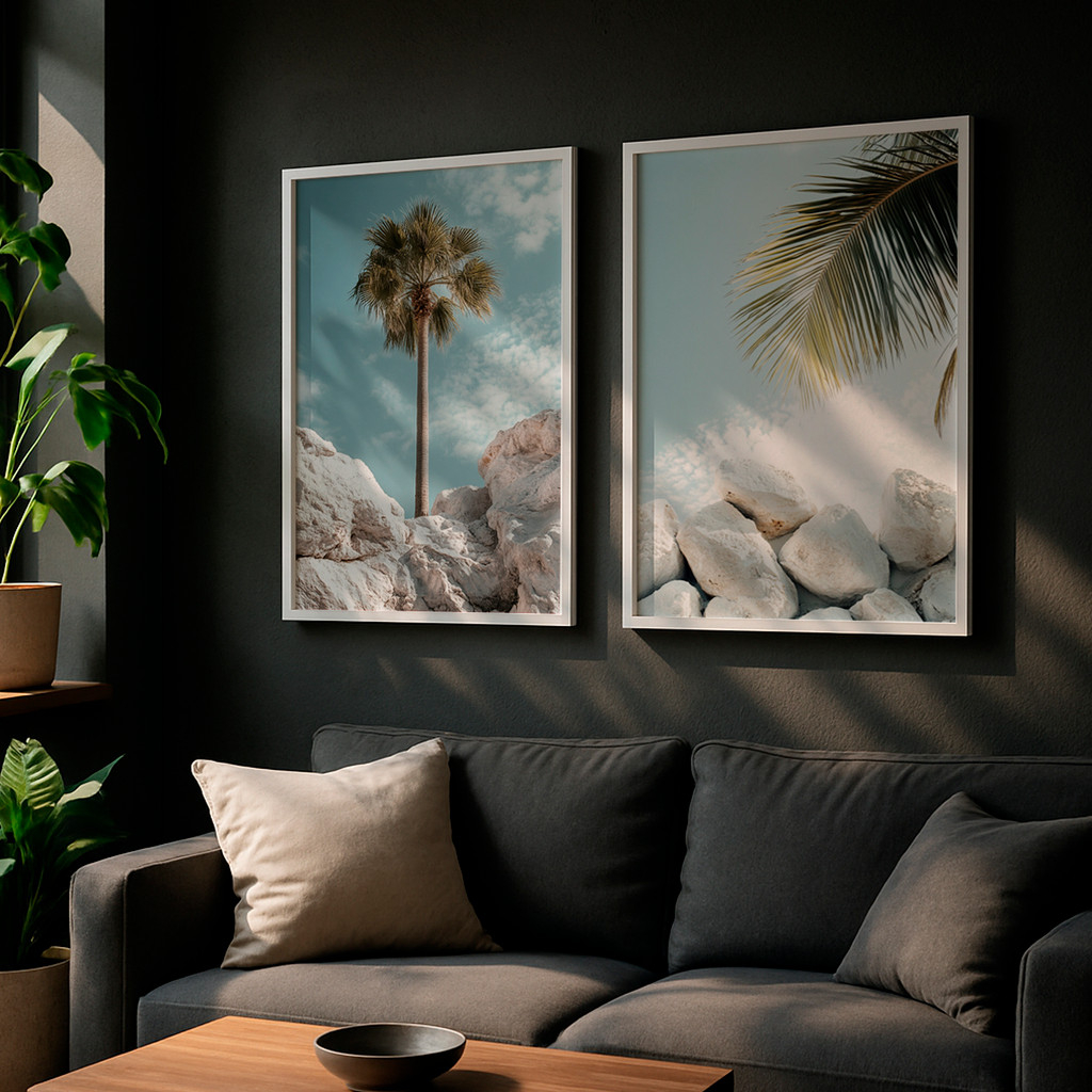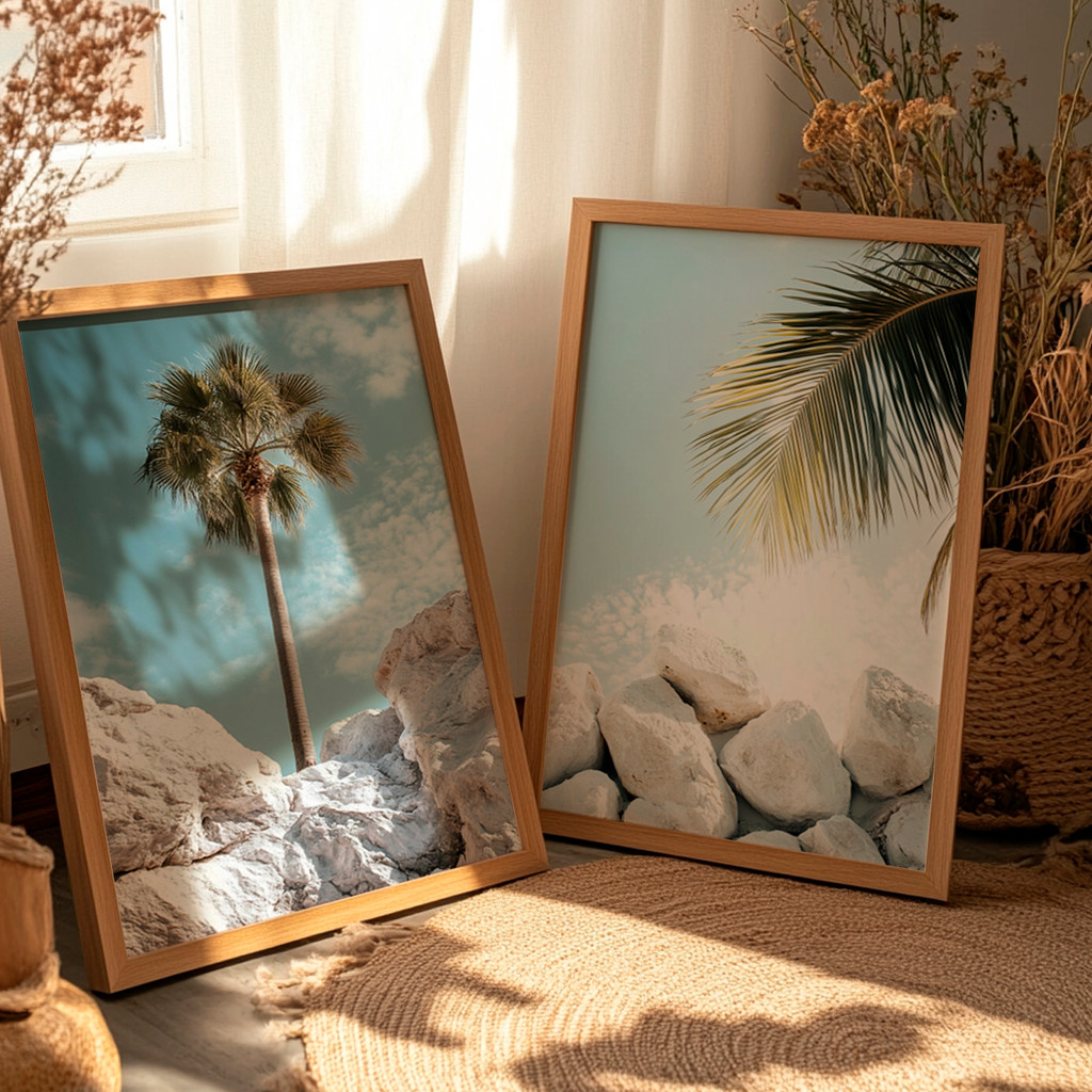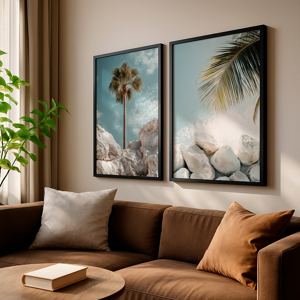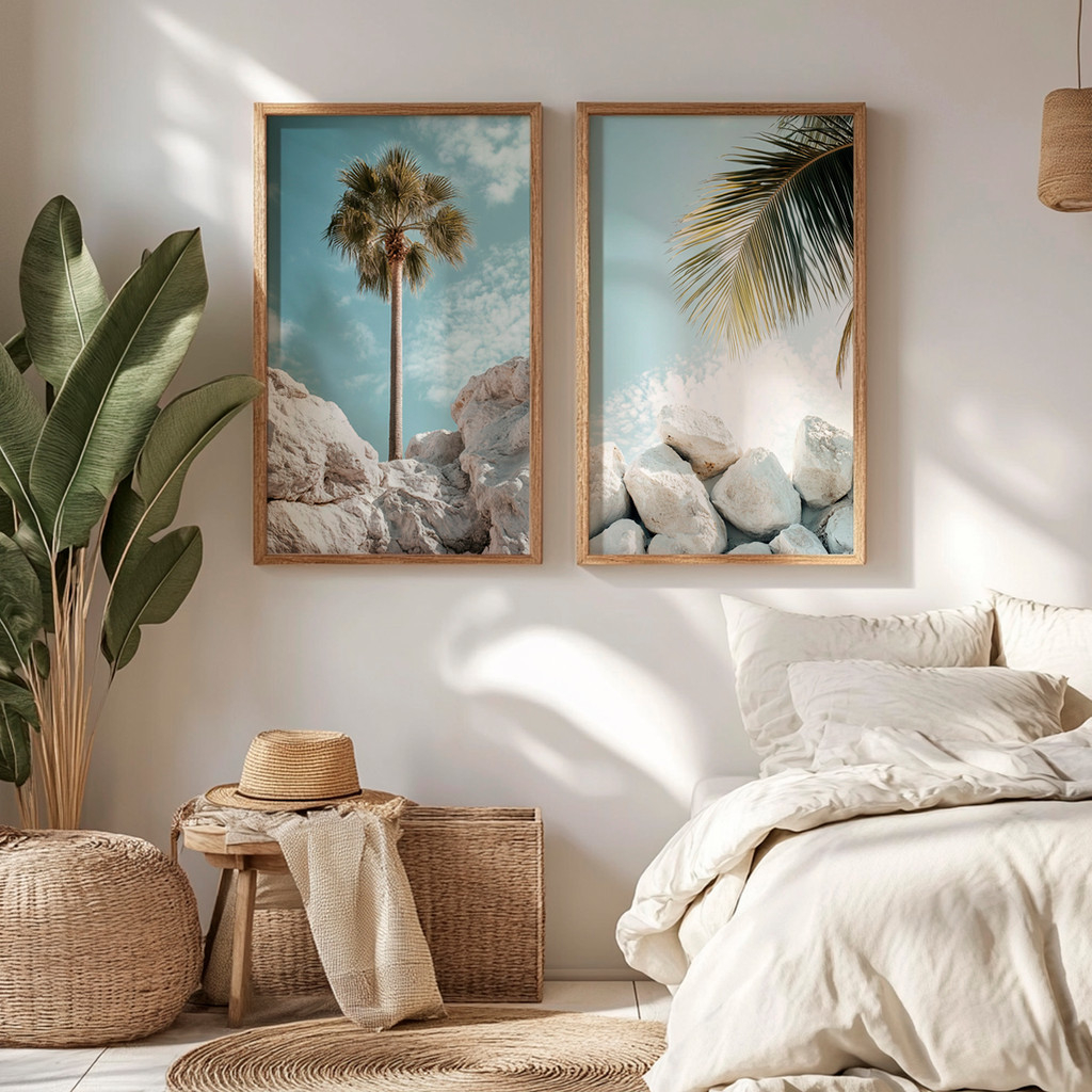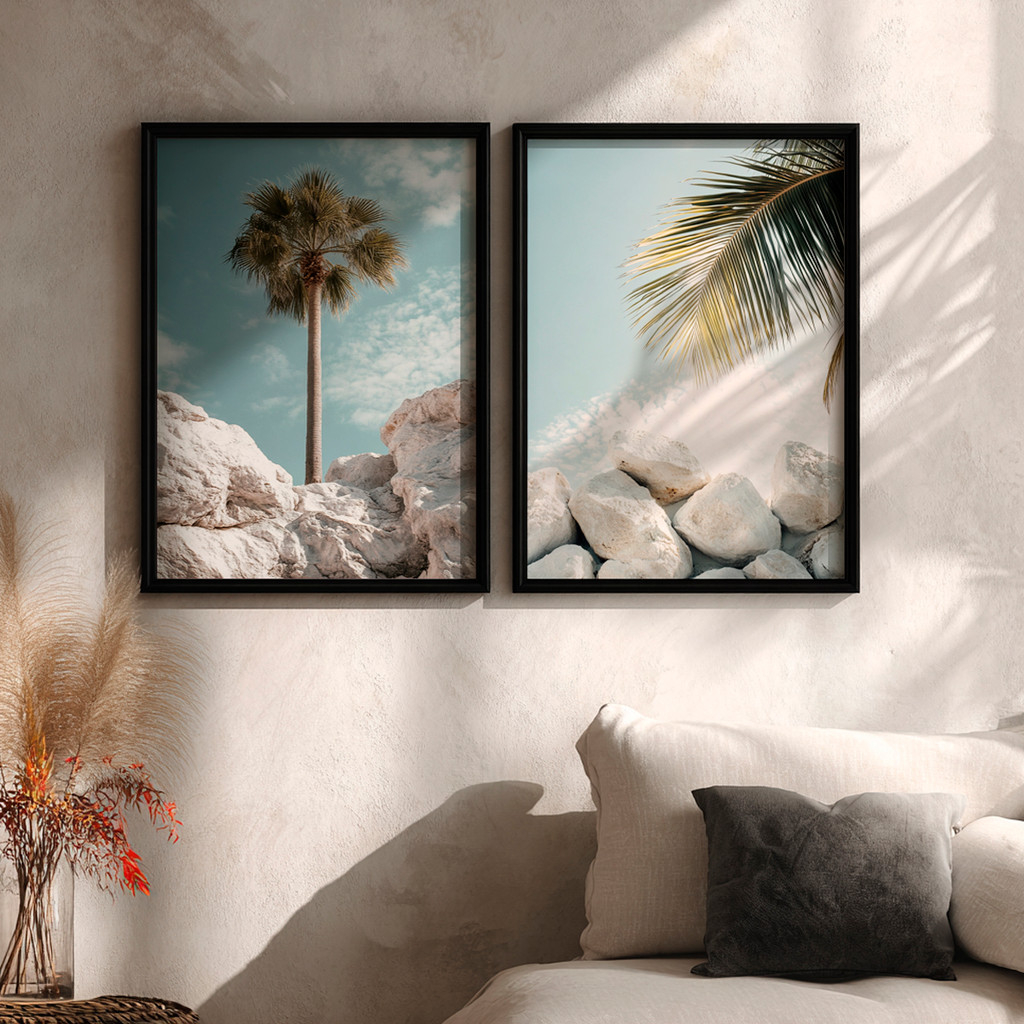 Este conjunto de dois quadros traz a leveza e a tranquilidade de uma paisagem tropical minimalista, combinando elementos naturais como palmeiras, pedras claras e céu suave. A composição transmite sensação de frescor, liberdade e conexão com a natureza, ideal para criar um ambiente acolhedor e relaxante.