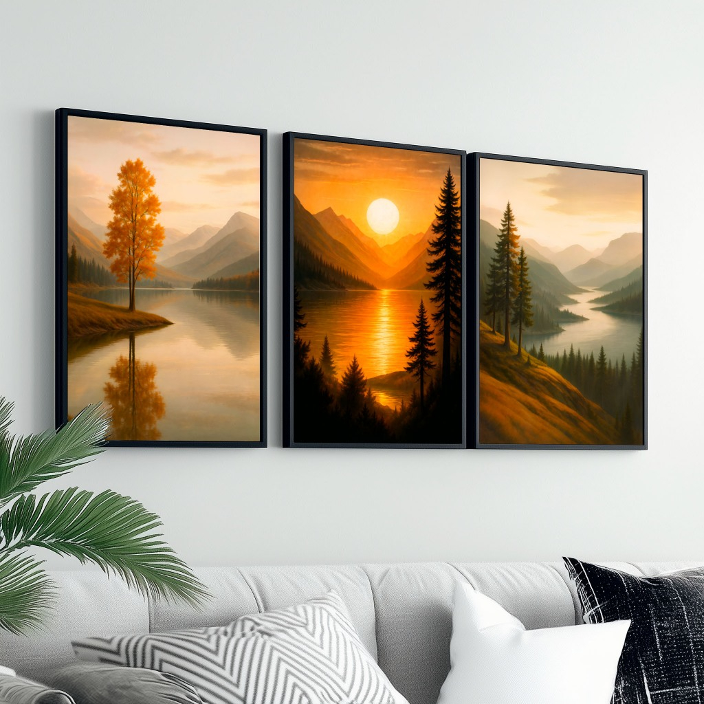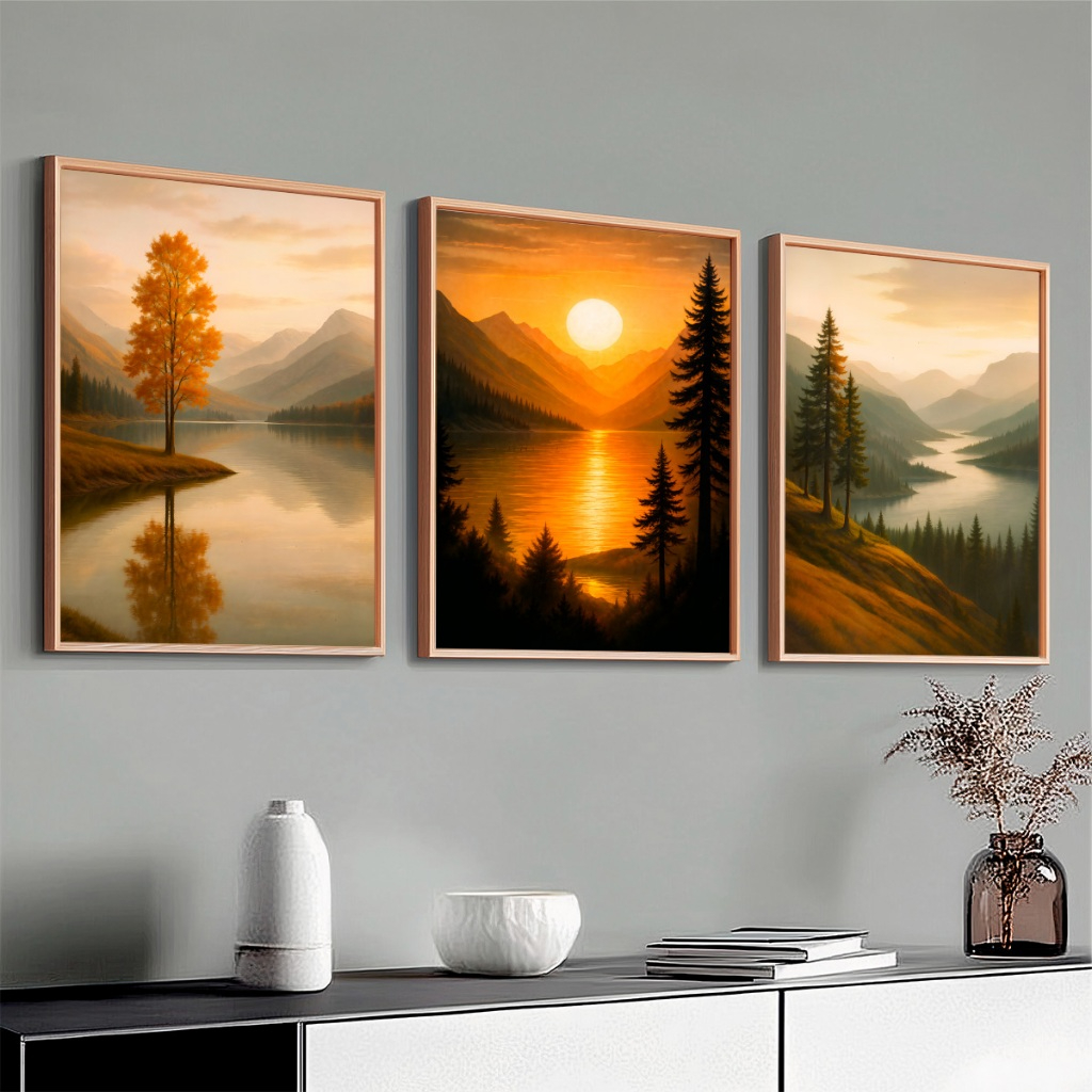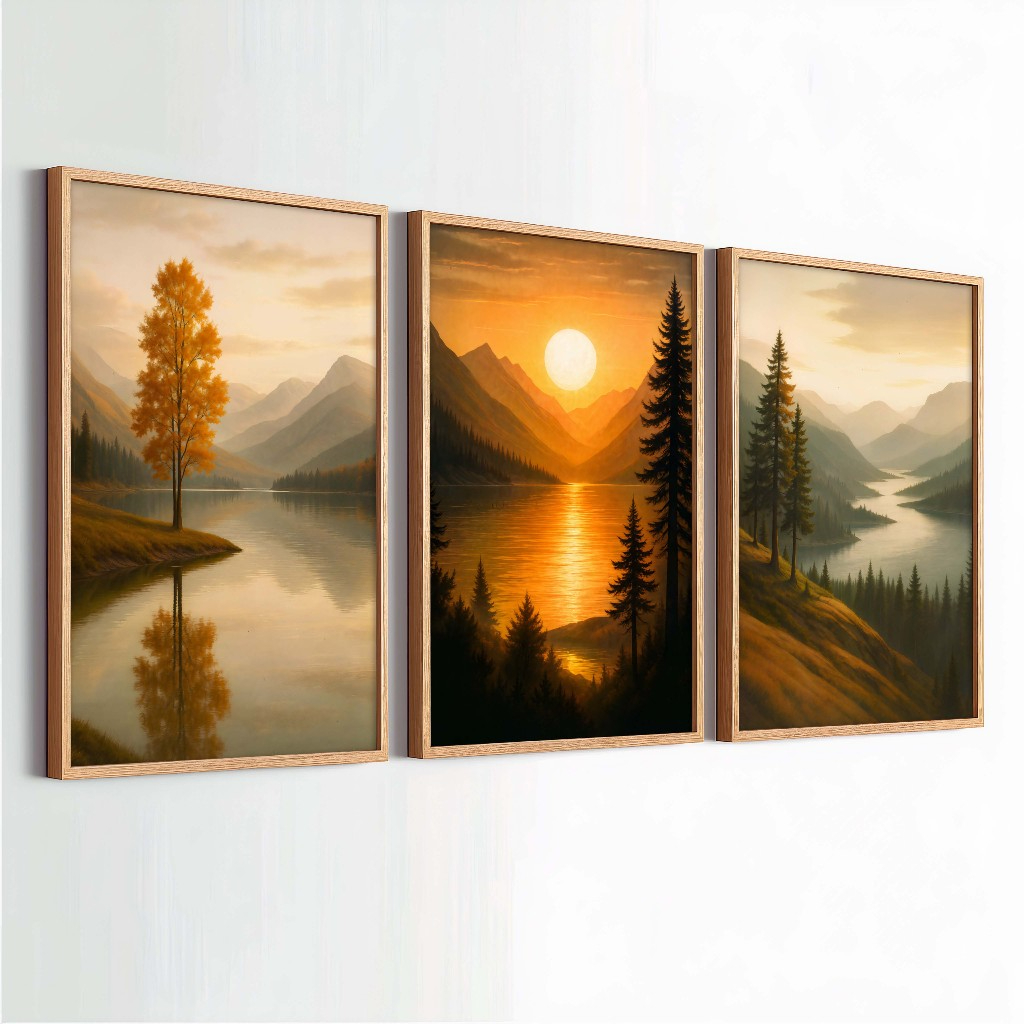 Cada quadro revela uma perspectiva única do mesmo cenário, o reflexo das águas calmas, o brilho do sol ao se despedir e a profundidade das montanhas cobertas por pinheiros. Essa composição harmoniosa transmite calma e contemplação, transformando qualquer ambiente em um refúgio visual de serenidade.