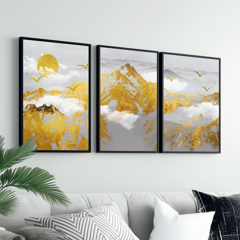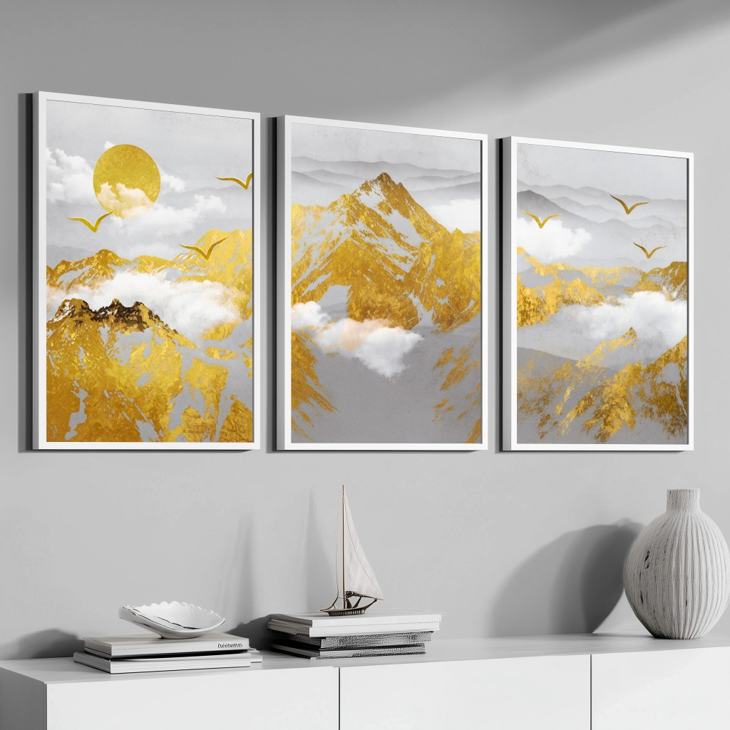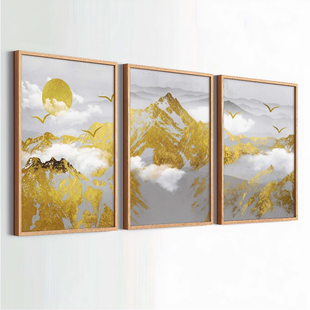 Com suas nuances de cinza suave e dourado reluzente, este trio se adapta perfeitamente a ambientes modernos, minimalistas ou clássicos, adicionando um toque de brilho e requinte sem perder a harmonia visual. É o tipo de arte que transforma uma parede comum em um ponto focal impressionante.