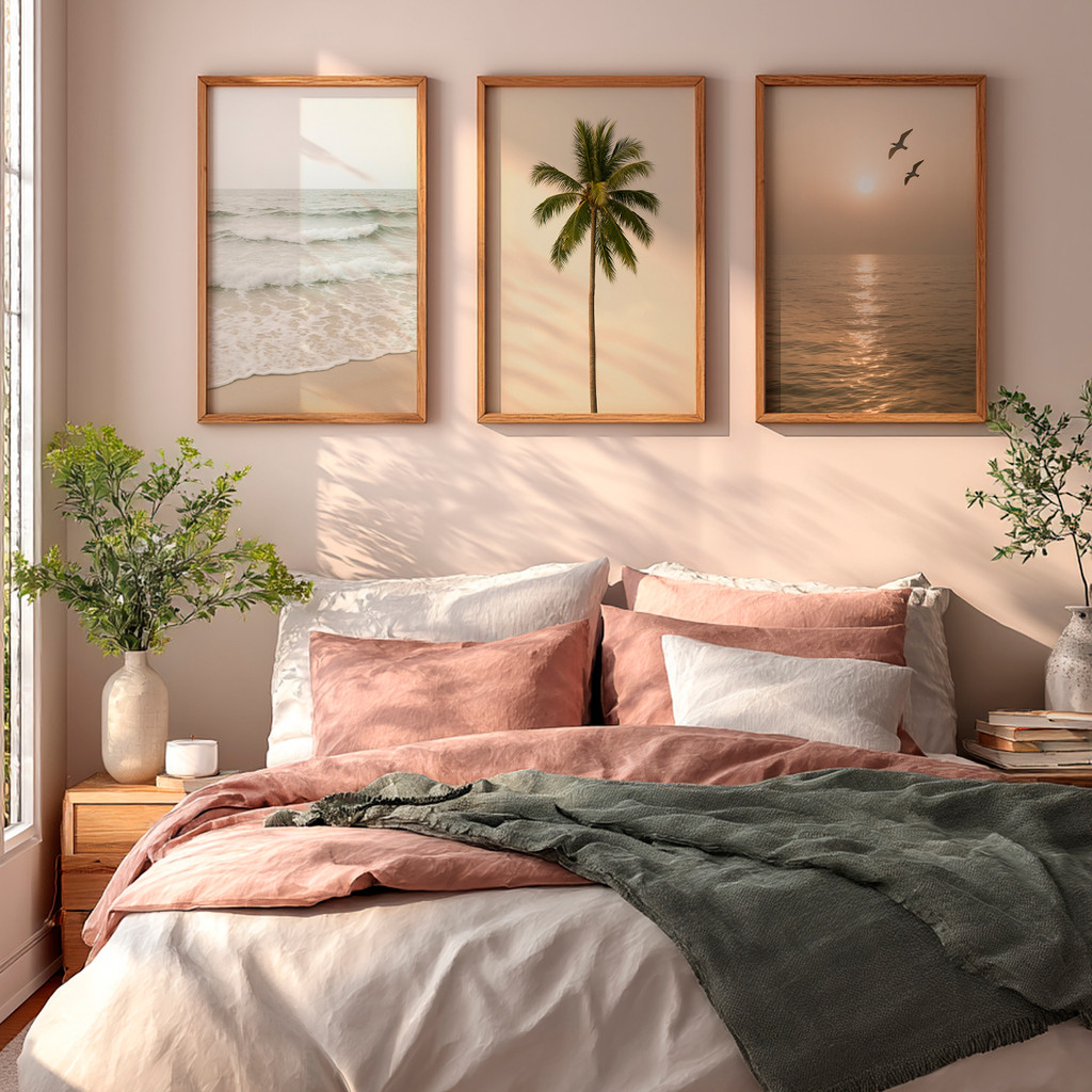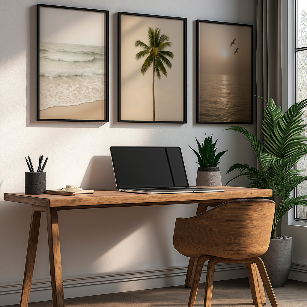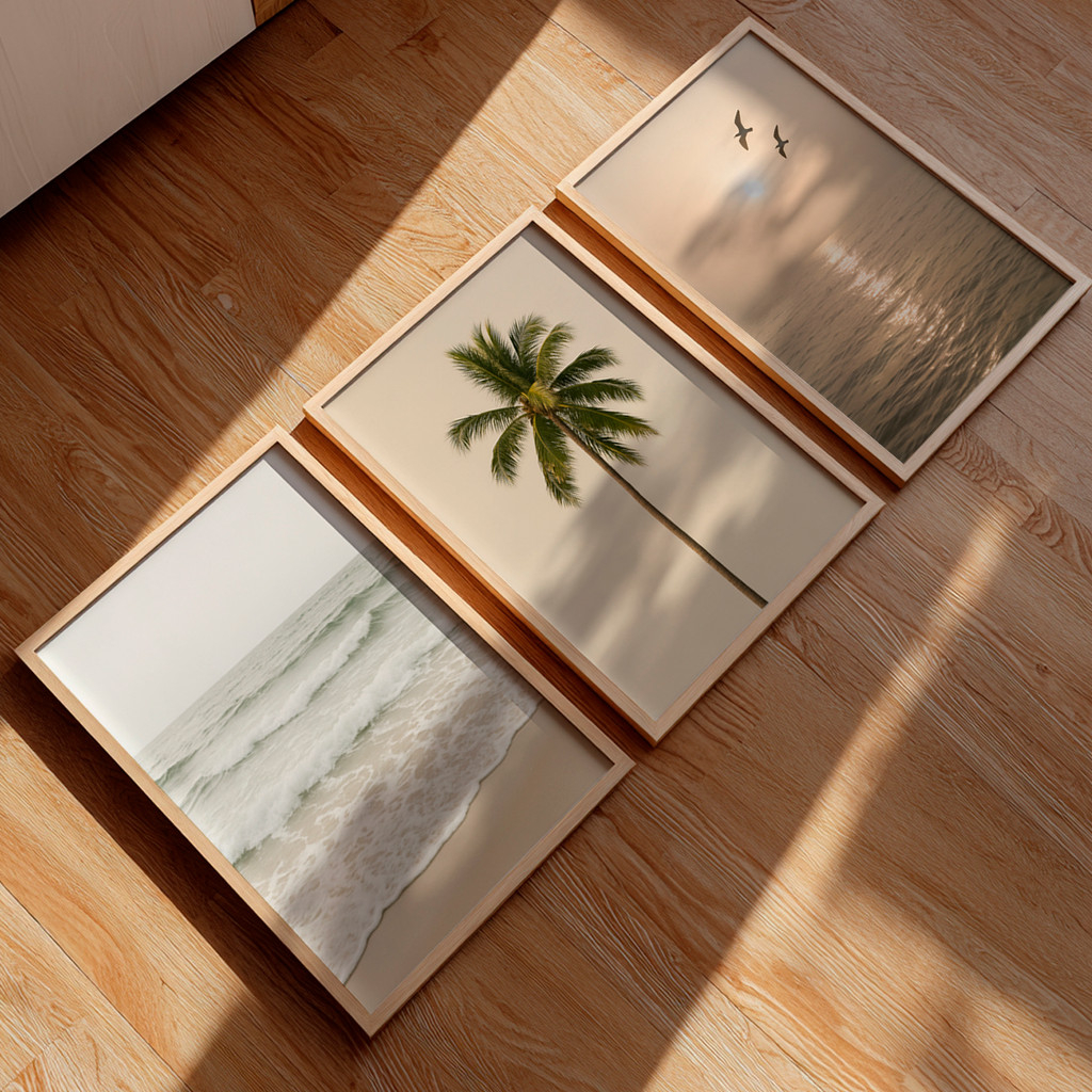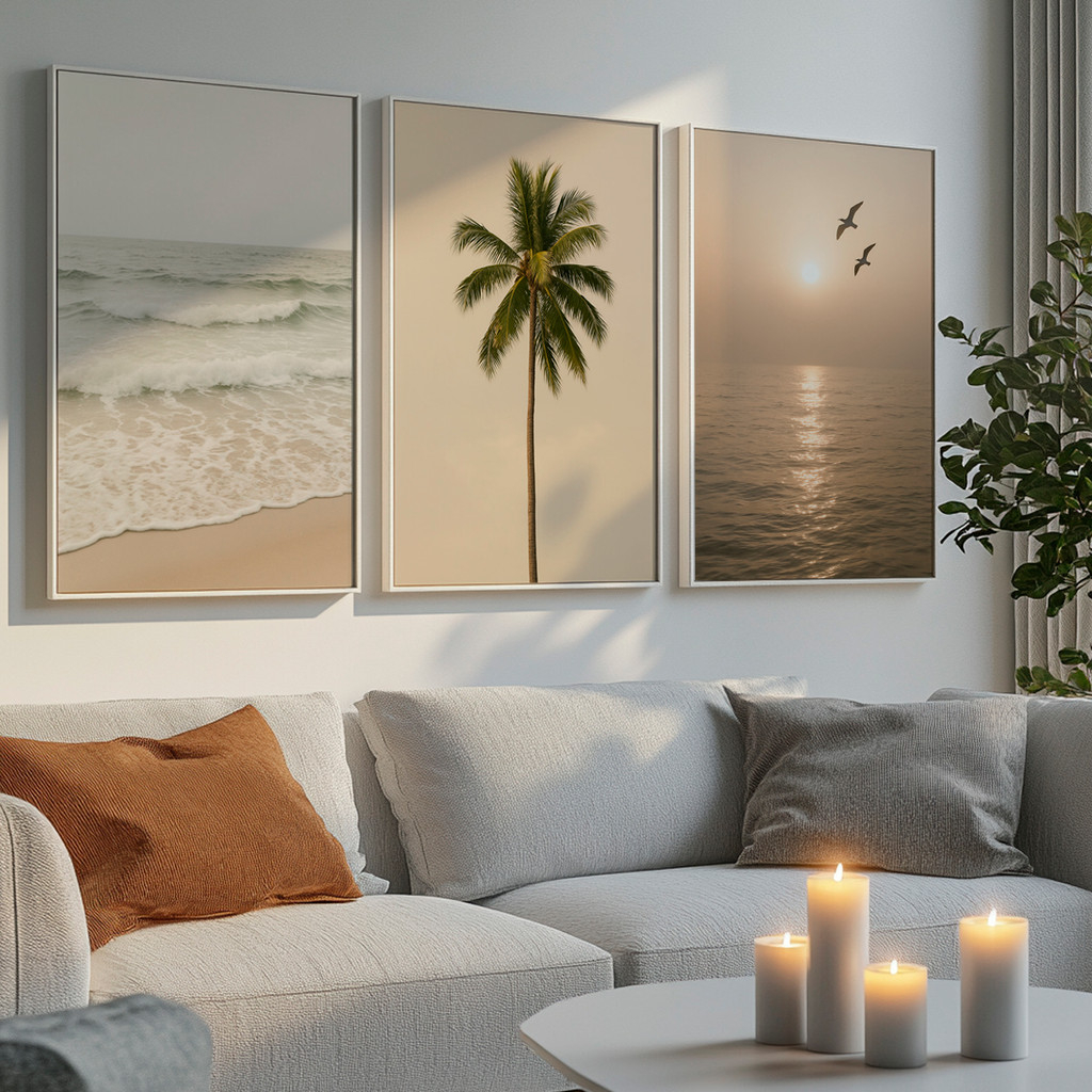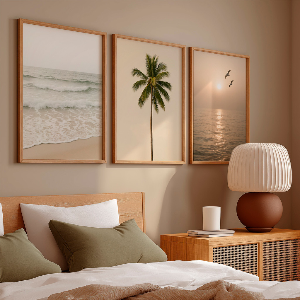 Este trio de quadros traz a calmaria e a beleza natural do litoral direto para o seu ambiente. As imagens apresentam uma praia serena, uma palmeira imponente e um pôr do sol suave, formando uma composição harmoniosa e acolhedora. O conjunto transmite leveza e tranquilidade, perfeito para quem busca um toque de paz no dia a dia.