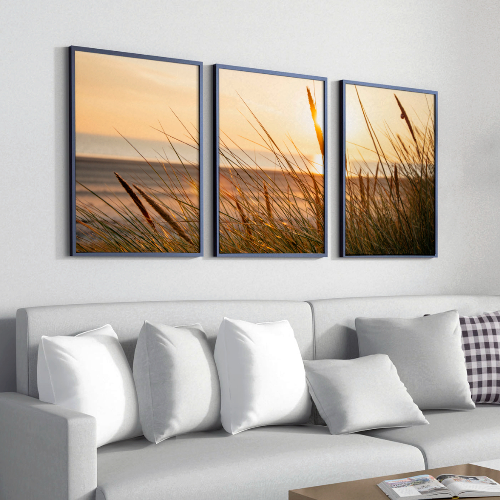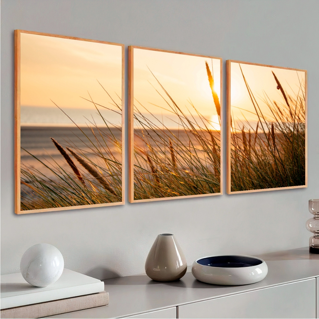 O Quadro Com Moldura Tarde na Praia traz a serenidade do pôr do sol à beira-mar, com tons dourados e alaranjados que criam uma atmosfera acolhedora e relaxante. As hastes delicadas de capim ao vento reforçam a sensação de calma e liberdade, tornando este trio uma escolha perfeita para quem deseja trazer a leveza da natureza para dentro de casa.