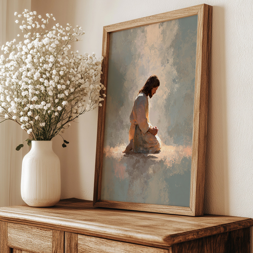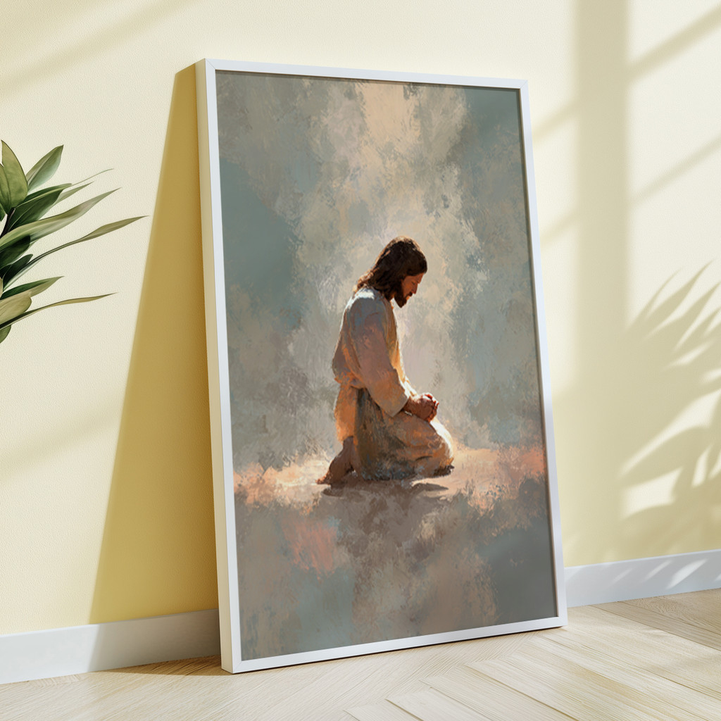 A composição magistral captura a essência da devoção através de pinceladas suaves e uma paleta acolhedora de tons terrosos e celestiais. O feixe de luz quente que ilumina a figura central não apenas destaca a riqueza de detalhes da pintura, mas também cria um ponto focal de conforto visual na sua parede. É uma arte que dialoga com perfeição em ambientes que buscam transmitir paz, harmonizando de forma impecável com diversas decorações.