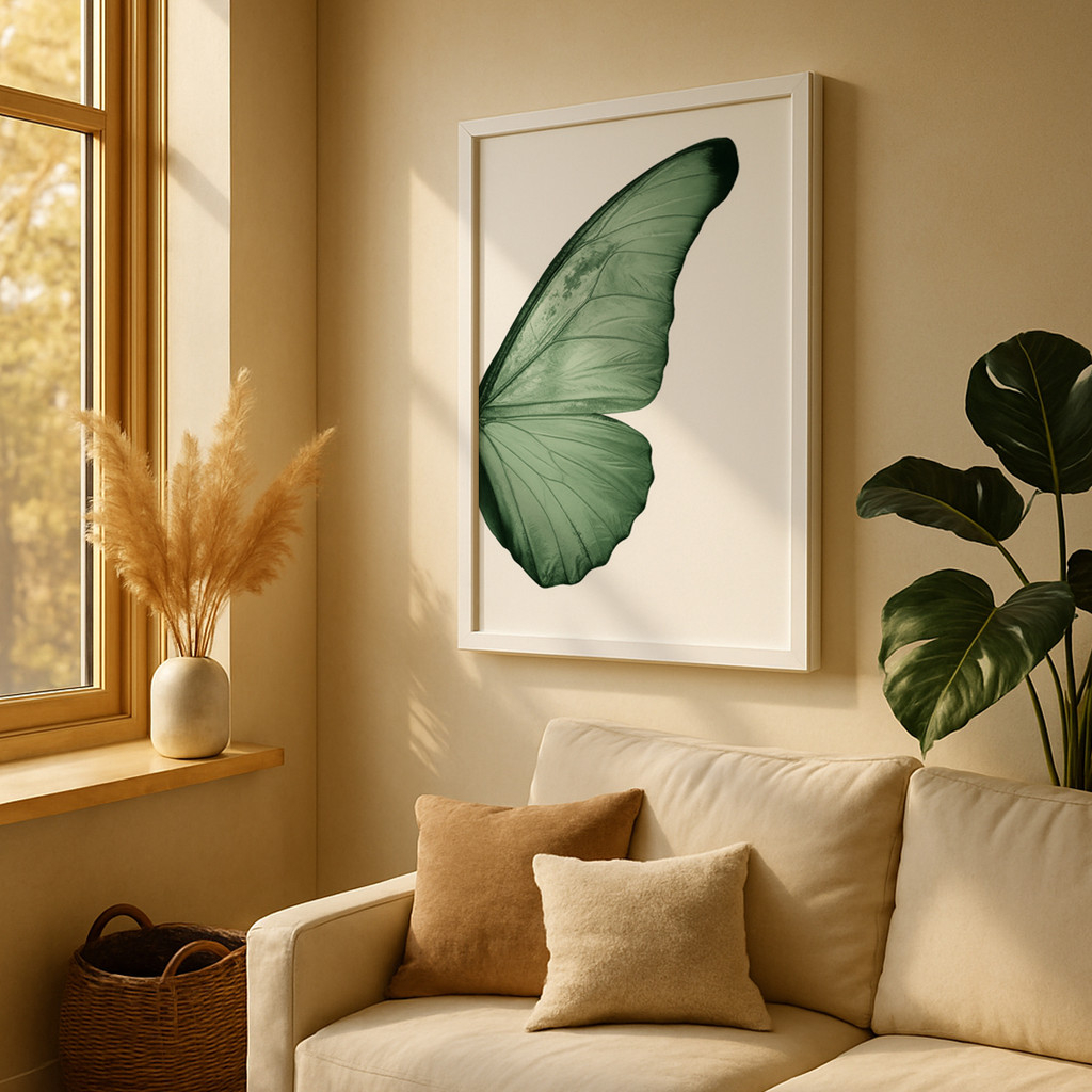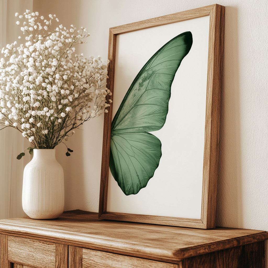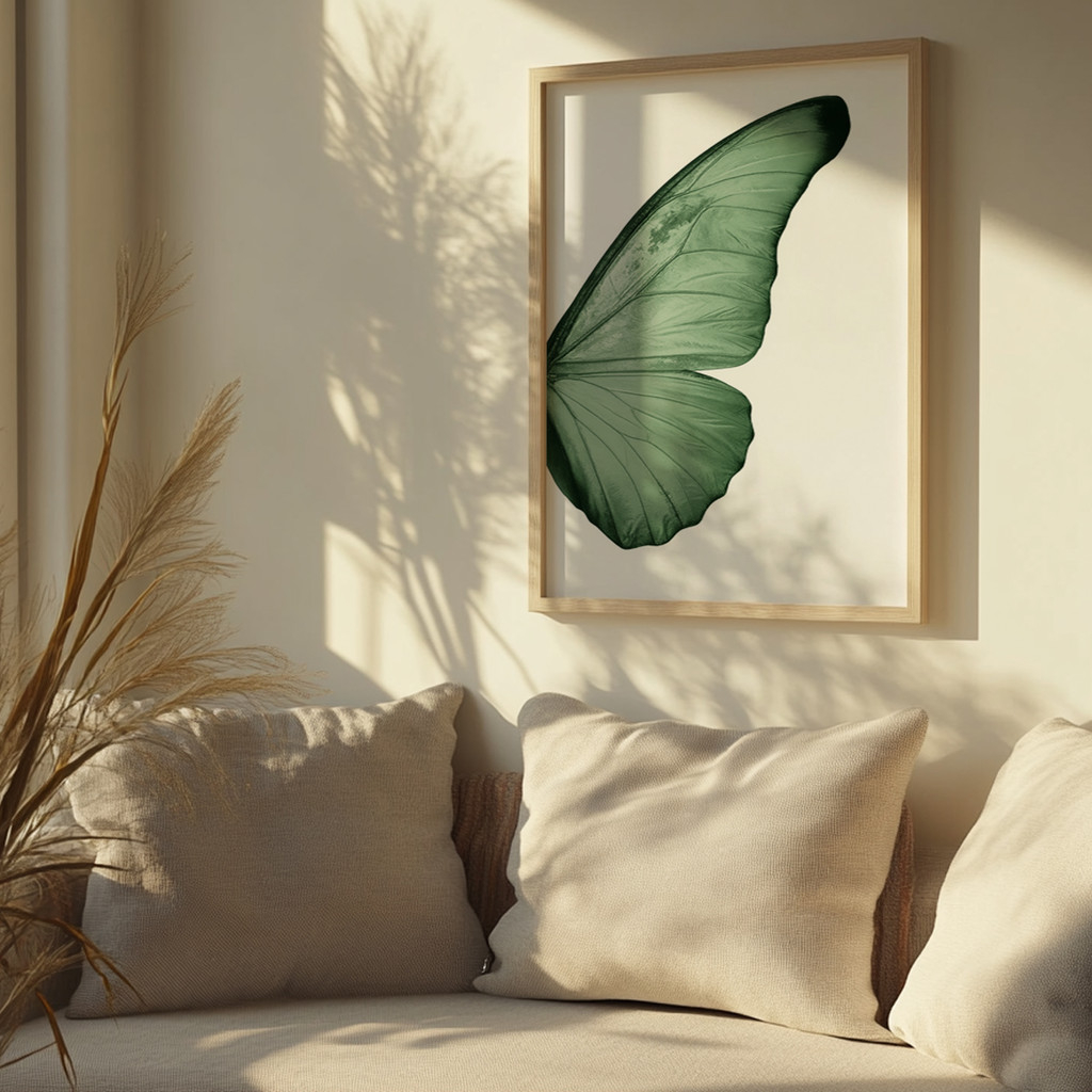 A paleta de cores é um convite ao relaxamento: tons de verde sálvia, musgo e esmeralda suave se espalham pela tela com uma textura que lembra a aquarela. As nervuras da asa são detalhadas com sutileza, criando um contraste orgânico sobre o fundo claro que traz modernidade e destaca a forma escultórica da natureza.