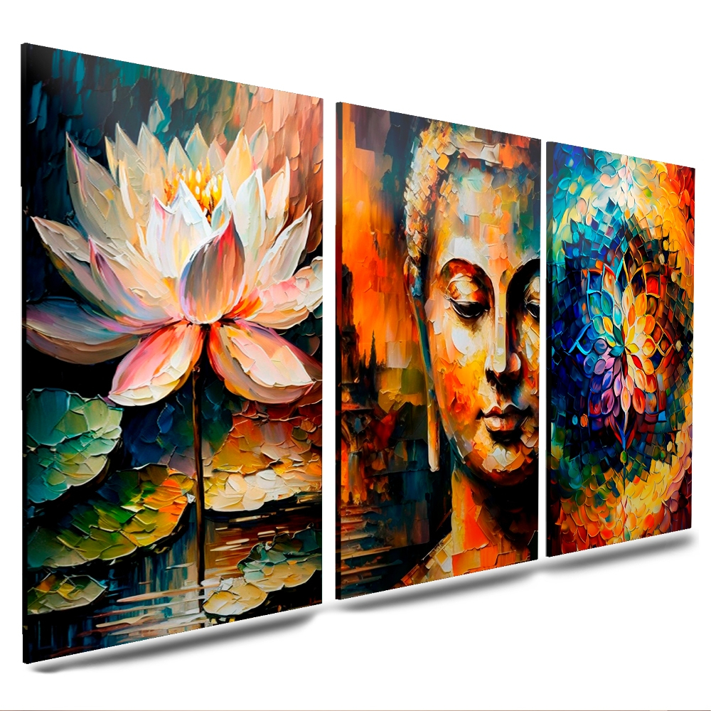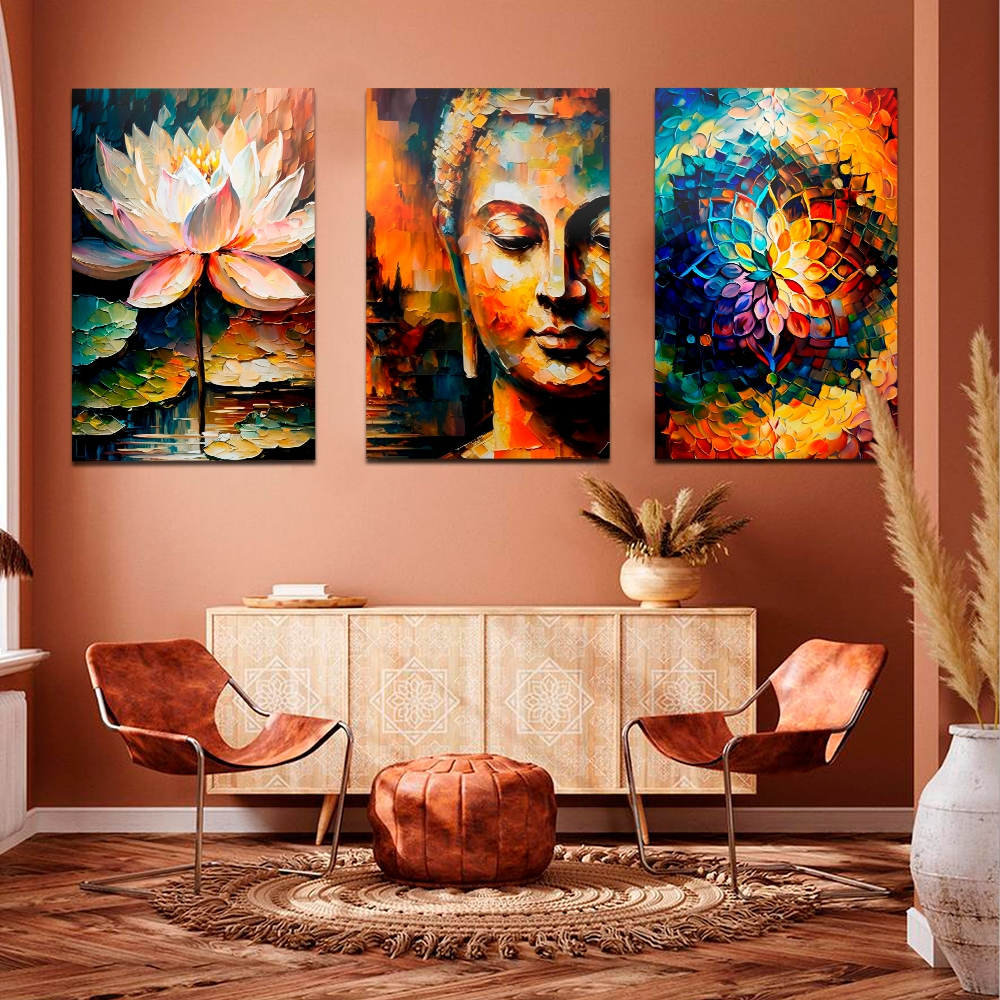 Transforme seu ambiente com este conjunto de três quadros decorativos que une a vibração das cores ao design sofisticado. Cada peça deste kit apresenta ilustrações vibrantes e abstratas, incluindo uma flor de lótus em tons de rosa, branco e amarelo, uma imagem abstrata com predominância de laranja e vermelho, e um padrão colorido abstrato em tons de azul, verde, laranja e vermelho. Este conjunto criativo e colorido é perfeito para adicionar vida e energia ao seu espaço, seja na sala de estar, no quarto ou no escritório.