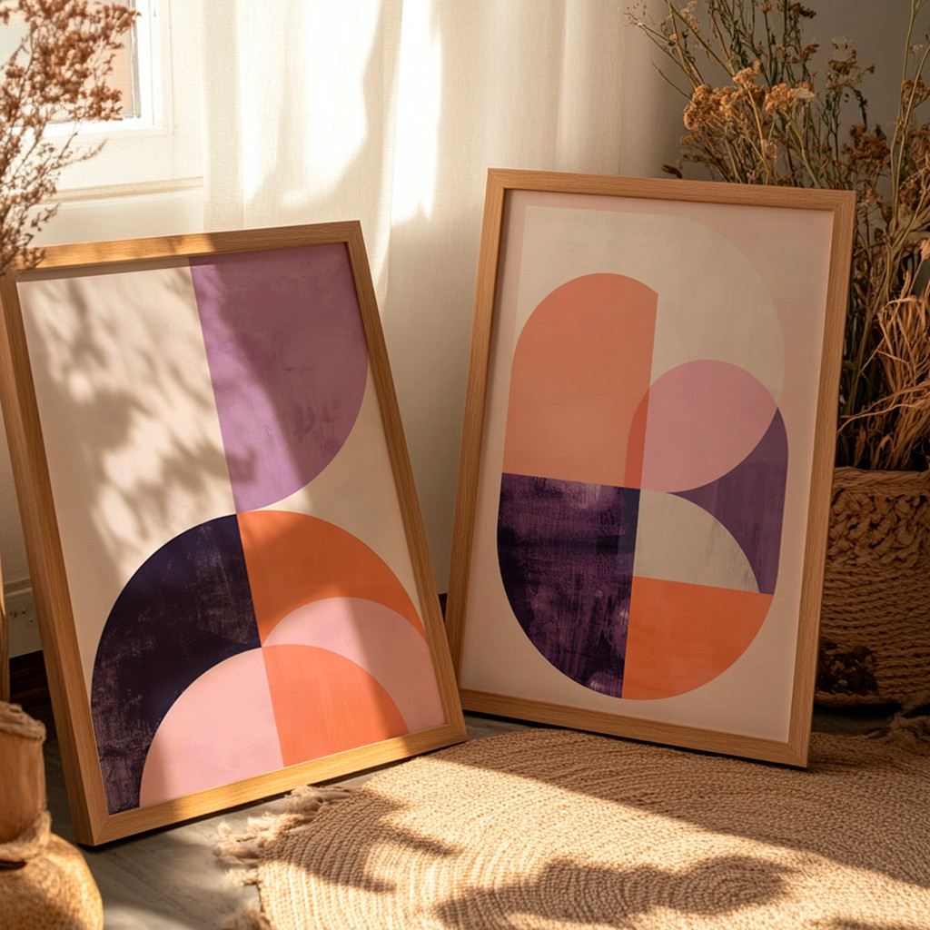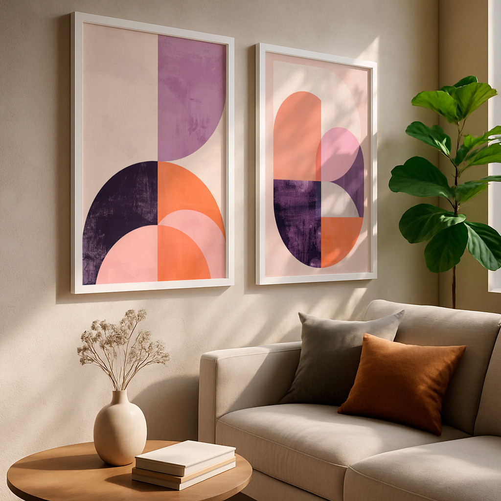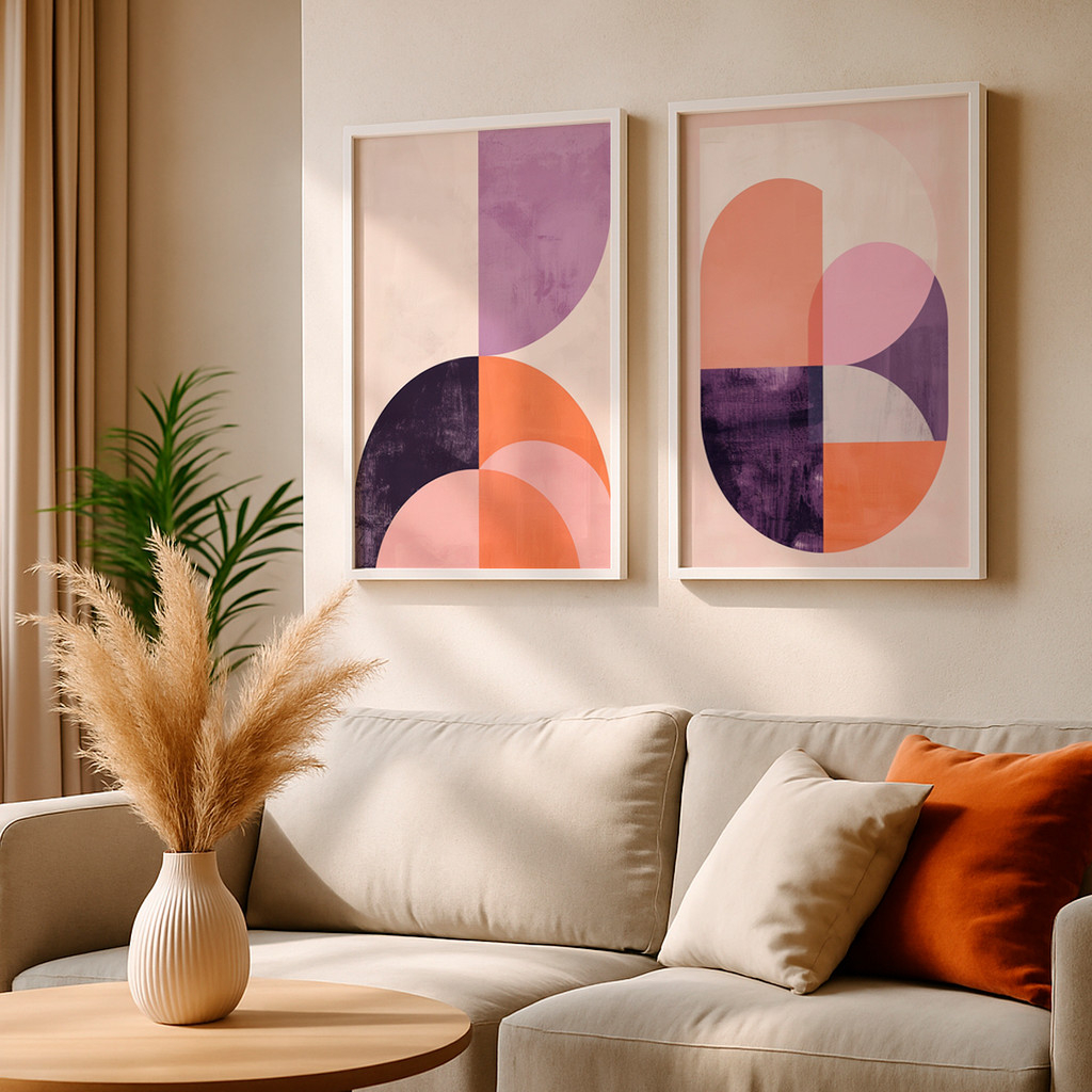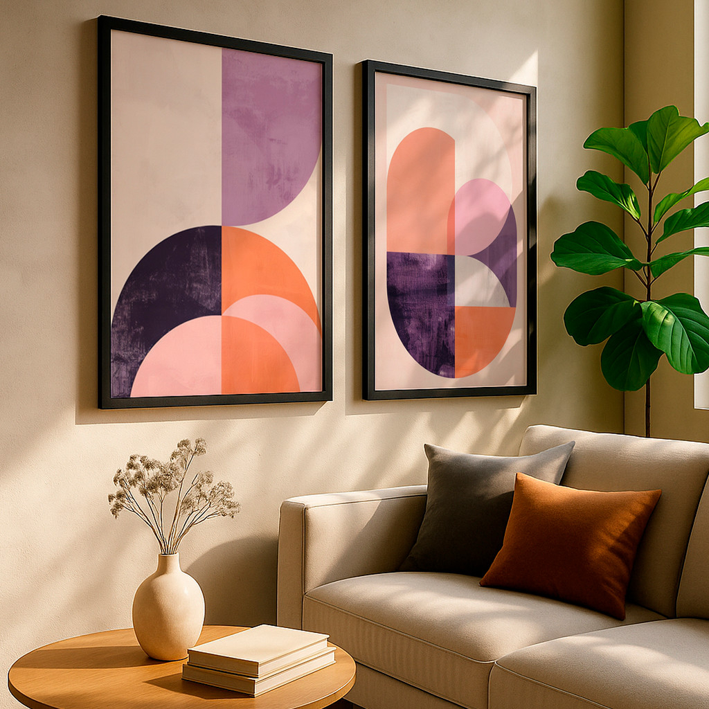 Esta dupla abstrata combina formas geométricas em tons suaves e vibrantes, criando uma composição moderna que transforma qualquer ambiente com elegância e personalidade. As curvas e blocos de cor se integram de maneira harmoniosa, resultando em um visual equilibrado e contemporâneo.