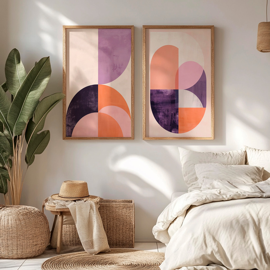 As paletas de lilás, pêssego e roxo profundo adicionam profundidade e movimento às obras, tornando-as ideais para salas de estar, quartos ou espaços que pedem um toque artístico mais atual. A suavidade do fundo contrasta com as formas marcantes, trazendo leveza e impacto visual ao mesmo tempo.