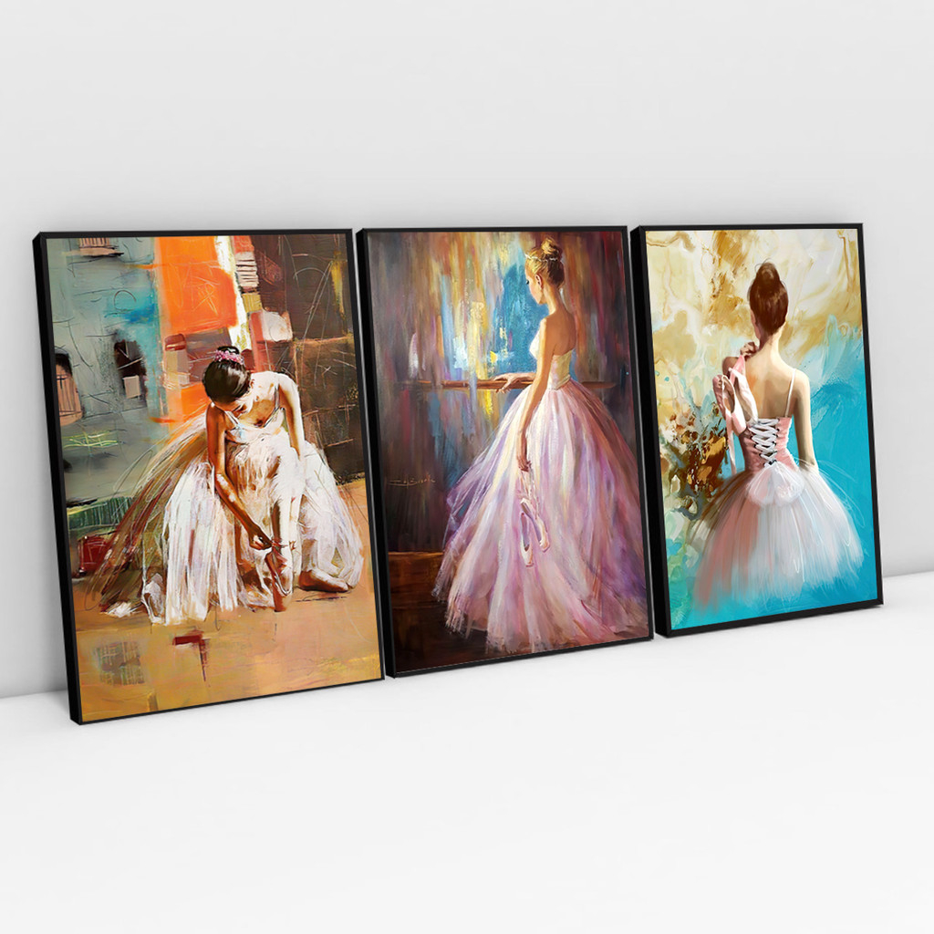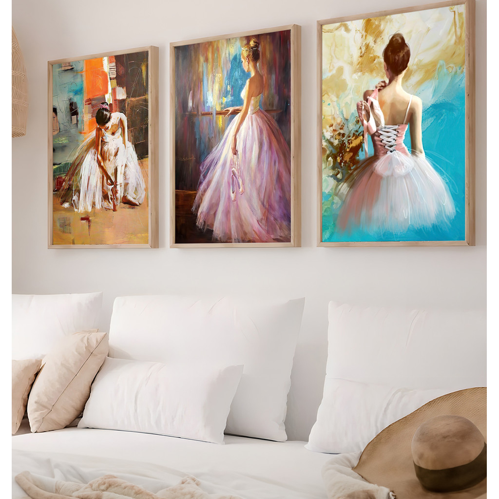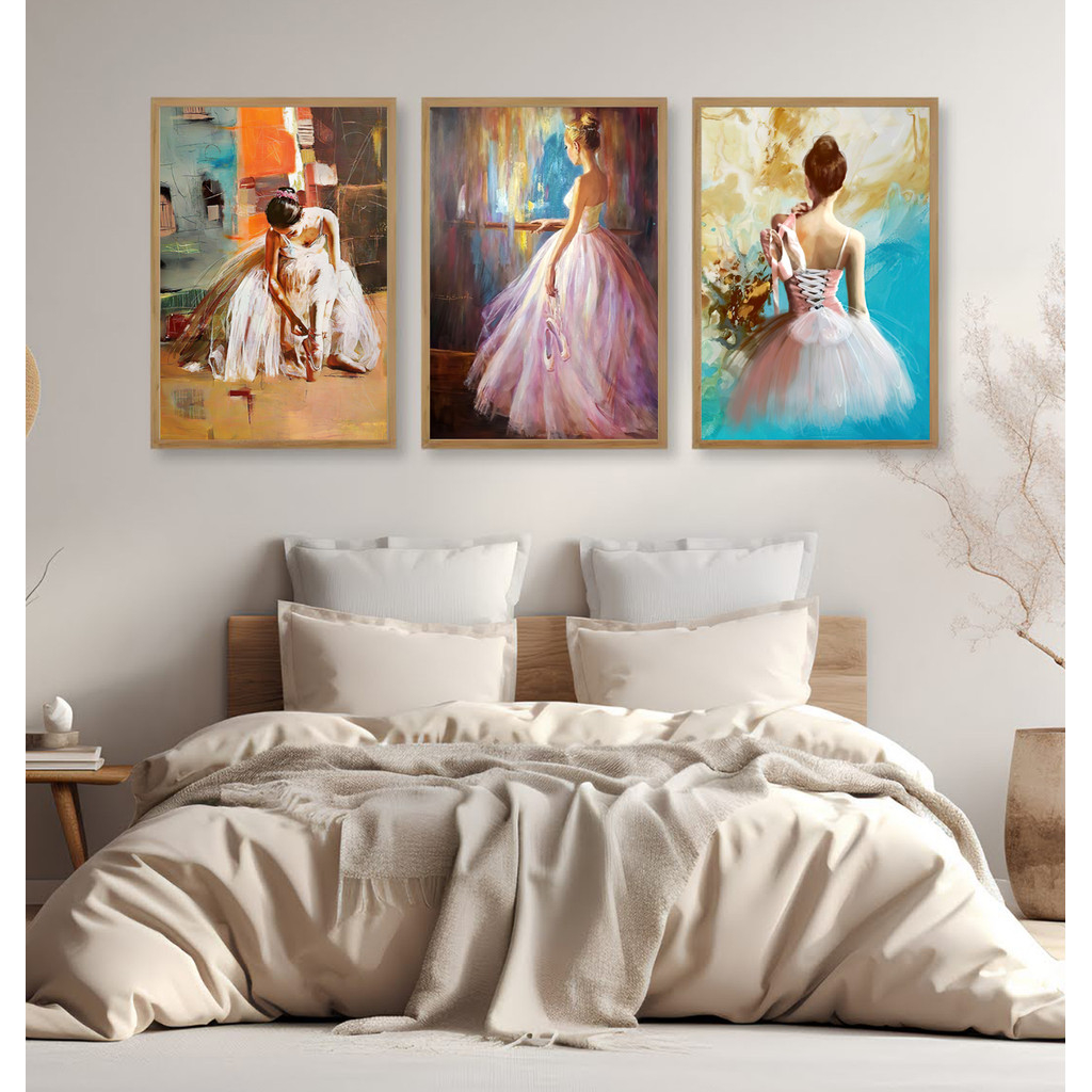 Cada peça deste deslumbrante trio revela um instante íntimo e precioso da jornada de uma bailarina, eternizado através de pinceladas expressivas e vibrantes que remetem à alta pintura impressionista. Da concentração ao amarrar as sapatilhas em meio a tons quentes de terracota e amarelo, passando pela postura impecável envolta em tules lilases e rosados, até o descanso contemplativo de costas para um vibrante fundo azul ciano. A fusão magistral dessas cores cria uma narrativa visual incrivelmente rica em textura, emoção e beleza atemporal.