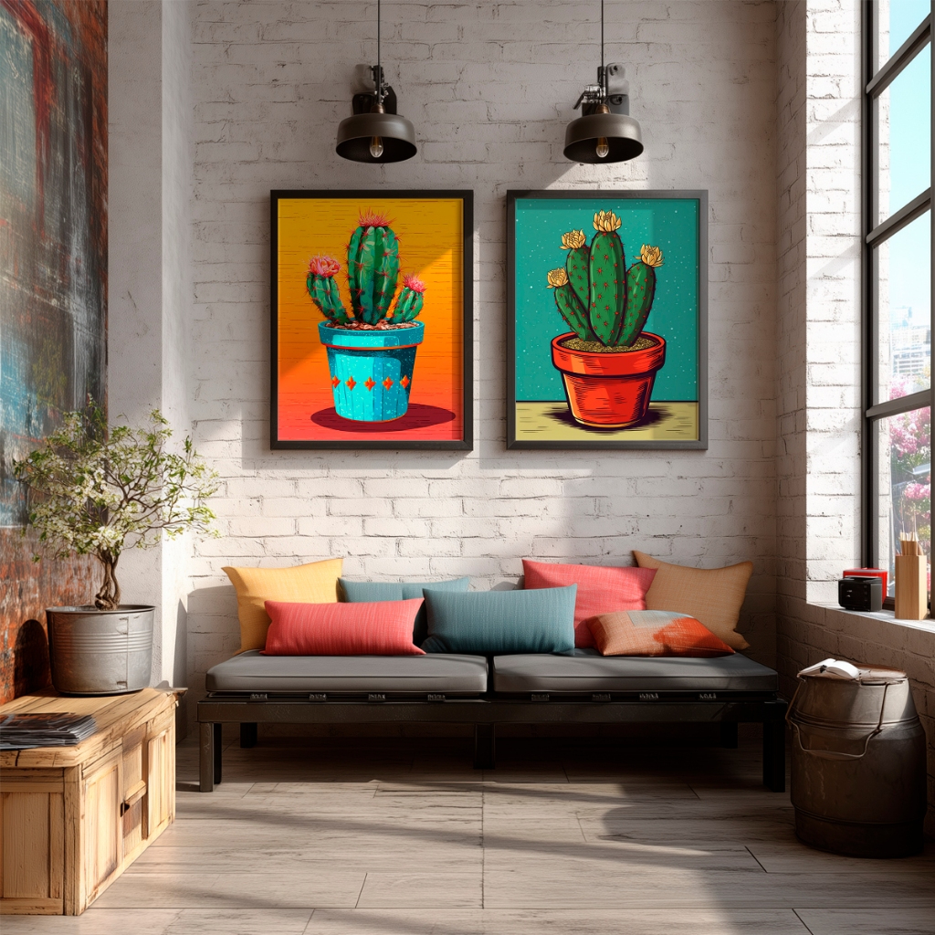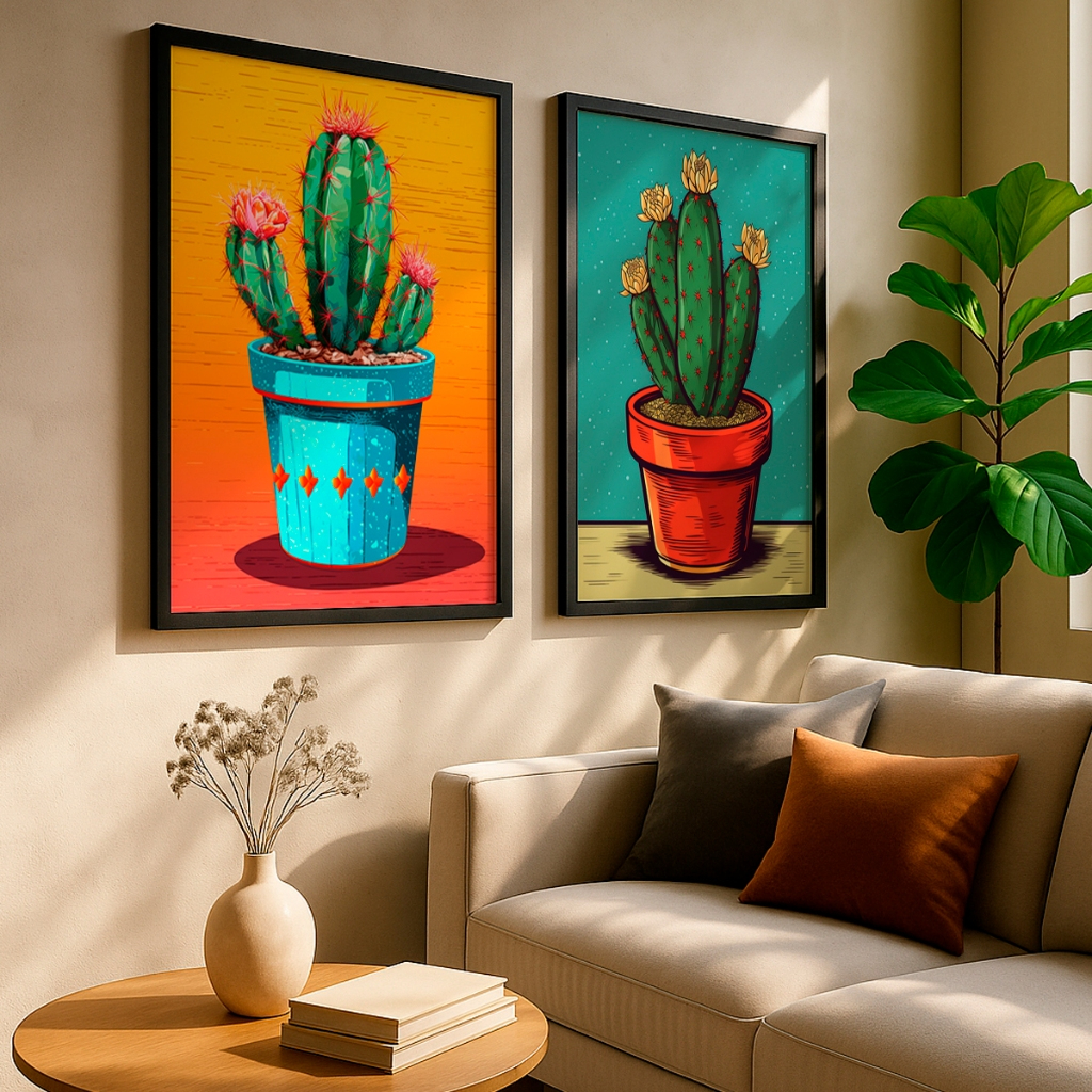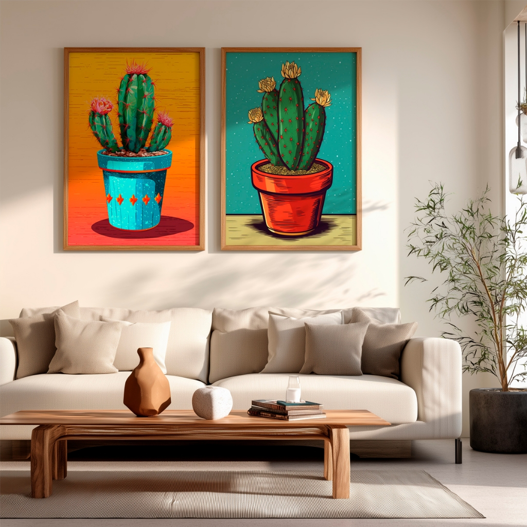 Dê vida e personalidade instantânea às suas paredes com o conjunto Cactos Vibrantes, uma dupla de telas que transborda autenticidade e alegria. Esta composição foi criada para quem não tem medo de ousar na decoração e busca transformar ambientes sóbrios em espaços cheios de atitude e calor visual, utilizando uma paleta de cores magnética que prende o olhar.