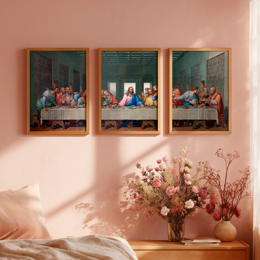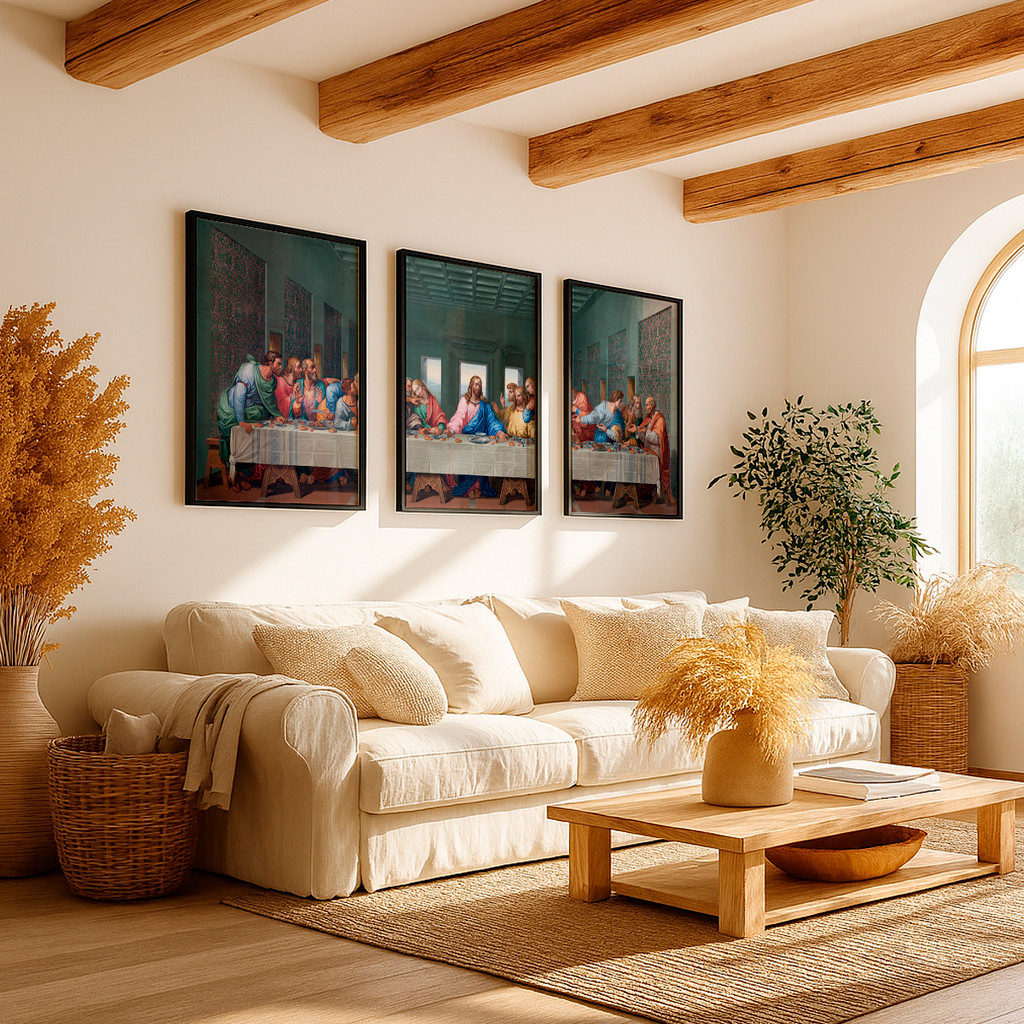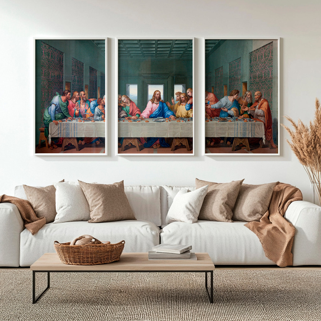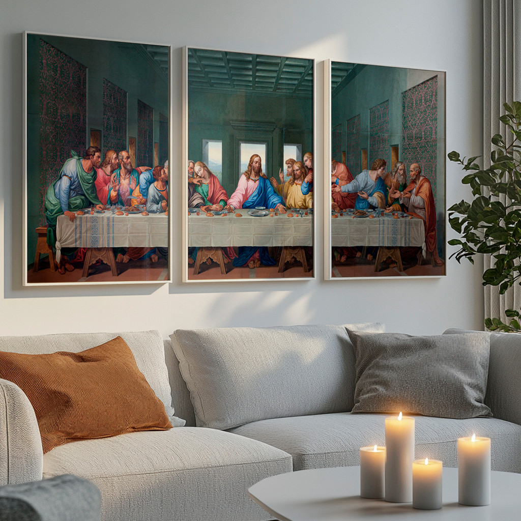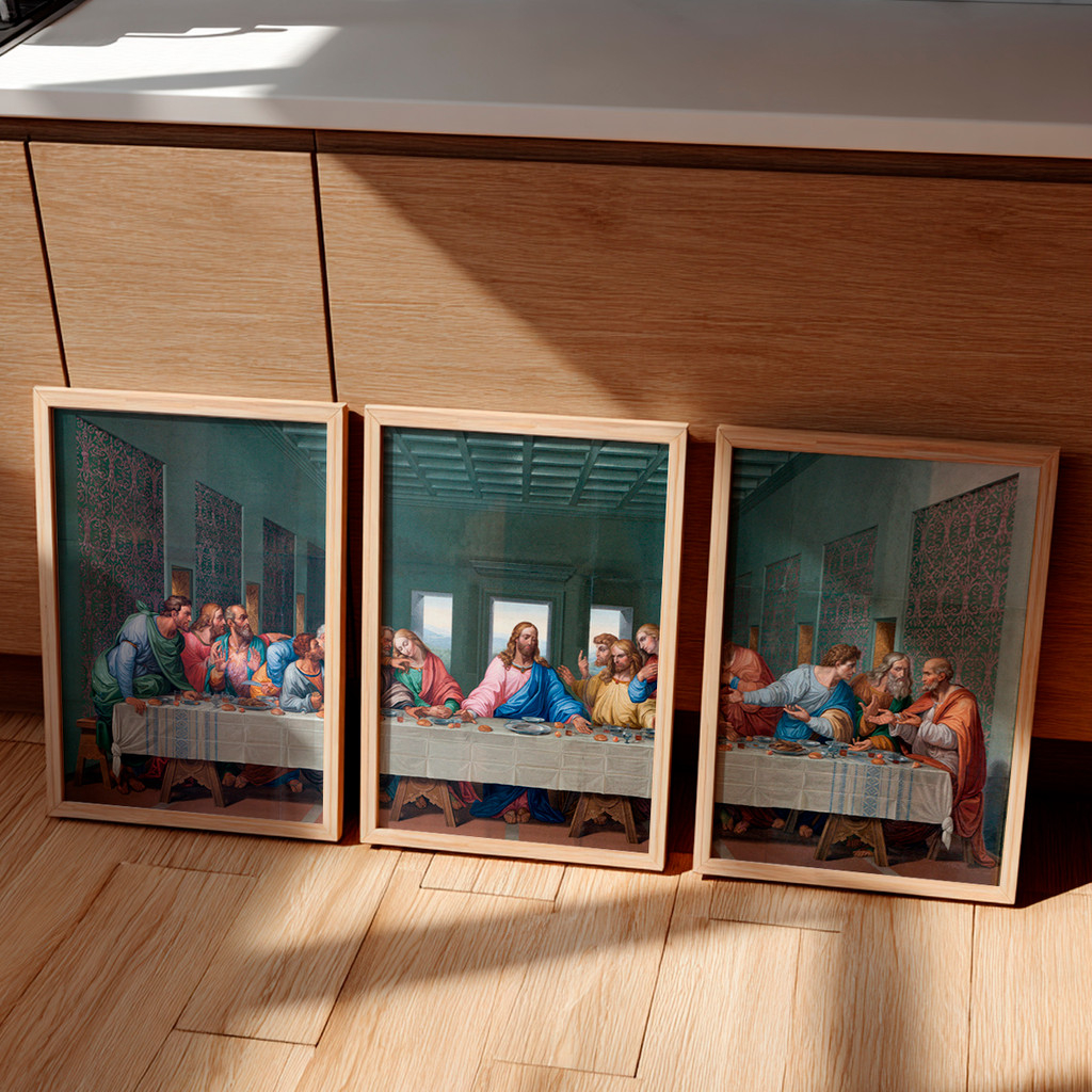 Dividida magistralmente em três telas imponentes, a composição recria a célebre cena com cores profundas, tons terrosos e texturas que remetem às grandes obras renascentistas. A tela central destaca a serenidade luminosa da figura de Cristo, enquanto os painéis laterais capturam a dinamicidade e as expressões vívidas dos apóstolos. Essa fragmentação contemporânea moderniza uma obra atemporal, garantindo que ela preencha a sua parede com elegância, criando um ponto focal que atrai o olhar e acalma a alma.