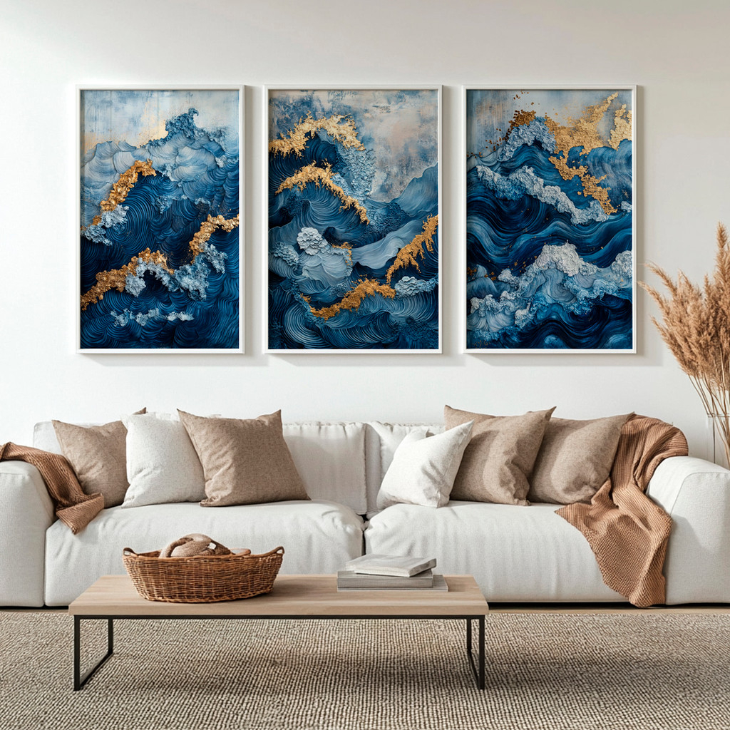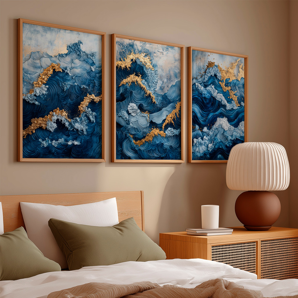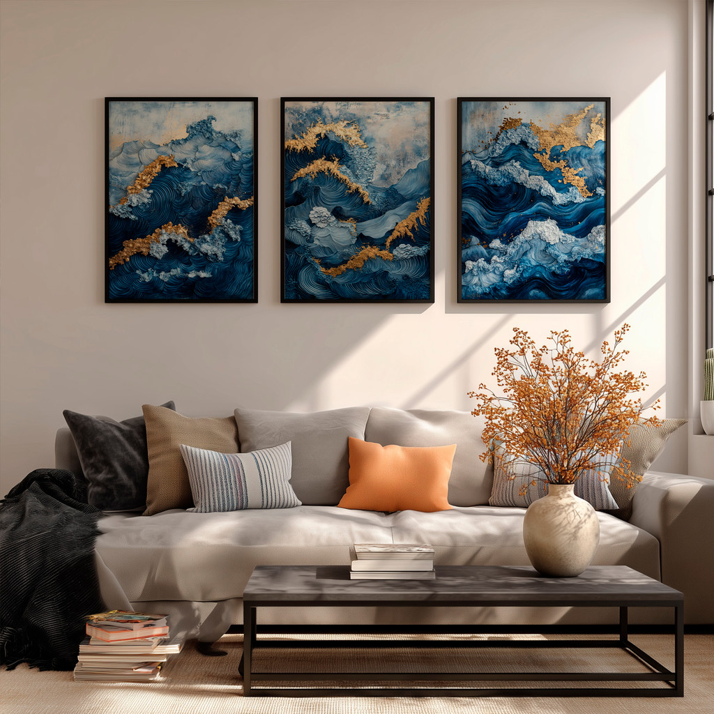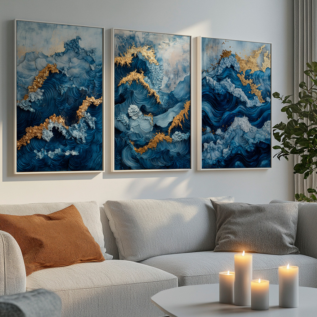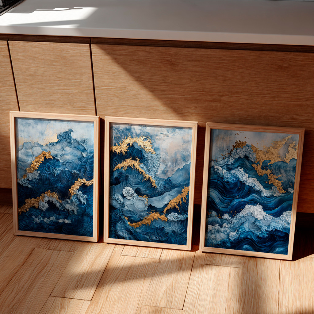Este conjunto de três quadros traz a força e a beleza do oceano de forma artística e sofisticada. As ondas intensas em tons de azul profundo, somadas aos detalhes em dourado, criam uma composição marcante que transforma qualquer ambiente em um espaço cheio de personalidade e equilíbrio visual.