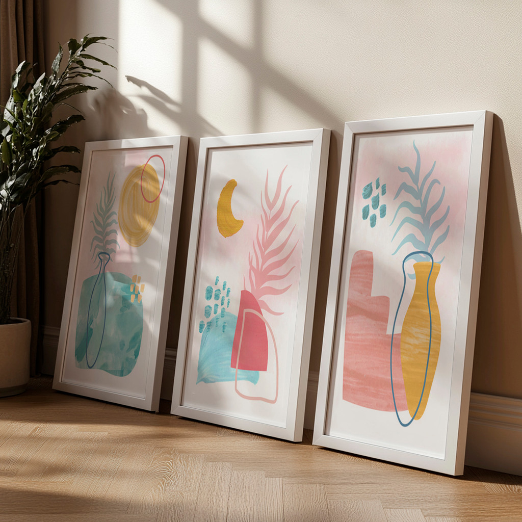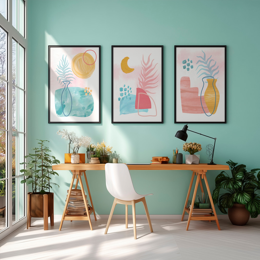 À esquerda, formas abstratas e fluidas dão suporte a um vaso minimalista e um sol radiante, evocando o frescor de uma manhã de primavera. No centro, a composição ganha um toque místico com a presença da lua crescente e folhagens esguias que dançam sobre um fundo aquarelado, enquanto a tela à direita finaliza o conjunto com geometrias suaves e um vaso dourado, criando um equilíbrio visual que transmite organização e acolhimento imediato.