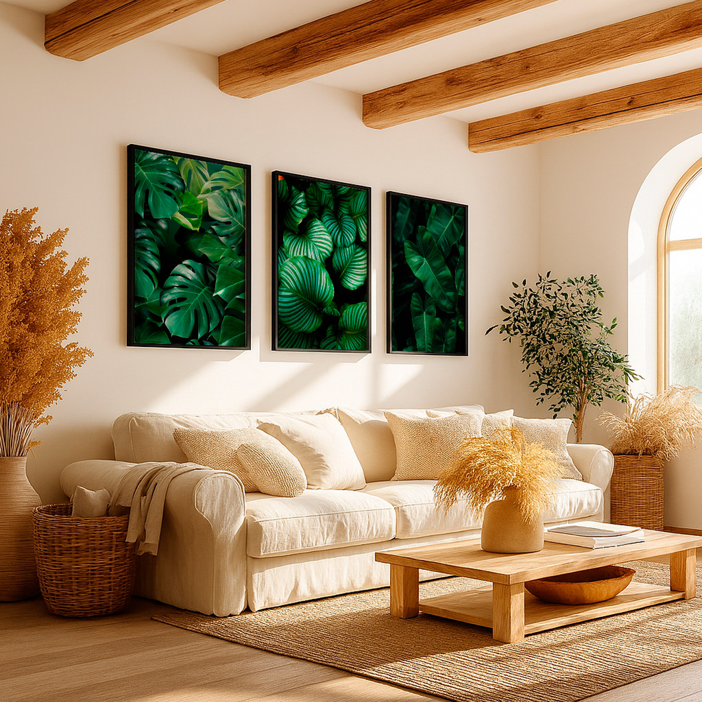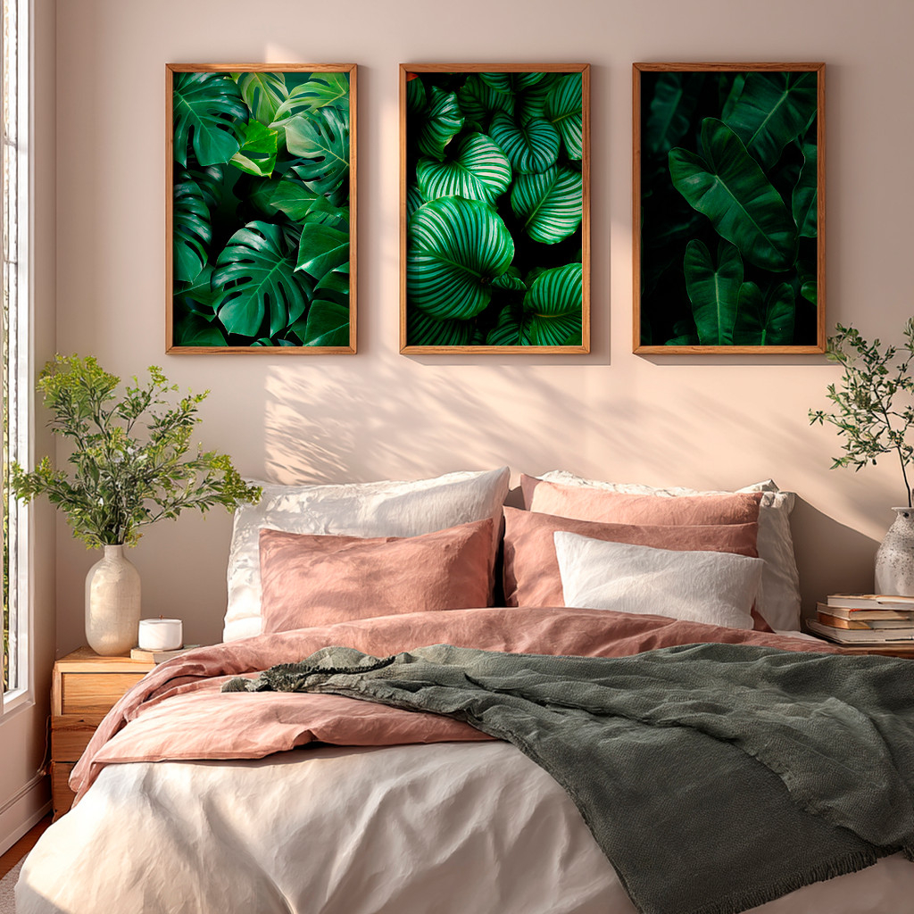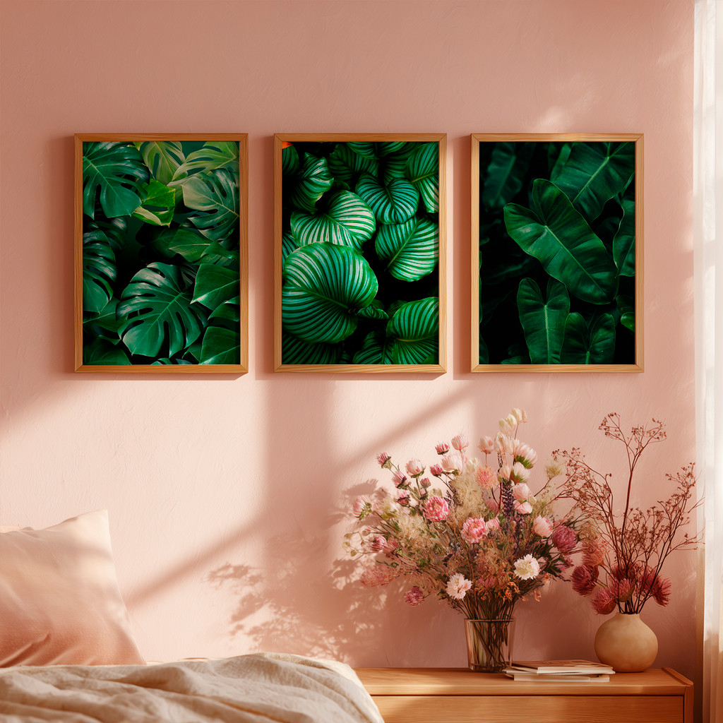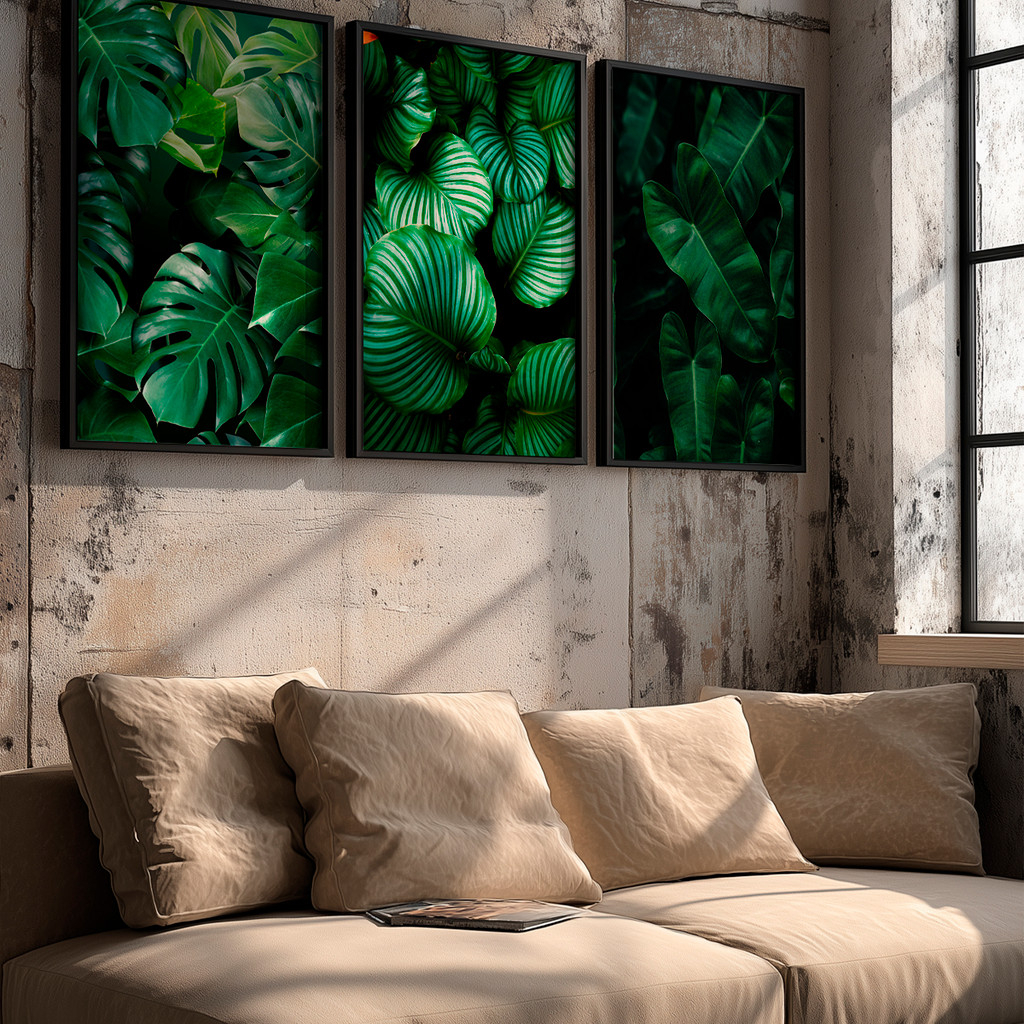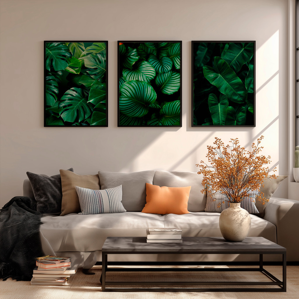 A peça à esquerda destaca as icônicas e imponentes folhas de Costela de Adão, simbolizando longevidade e estilo atemporal. No centro, a textura detalhada e as linhas precisas criam um ritmo visual hipnotizante, enquanto o quadro à direita encerra a composição com folhagens alongadas em um verde denso e elegante, garantindo um equilíbrio perfeito entre sombra e luz.
