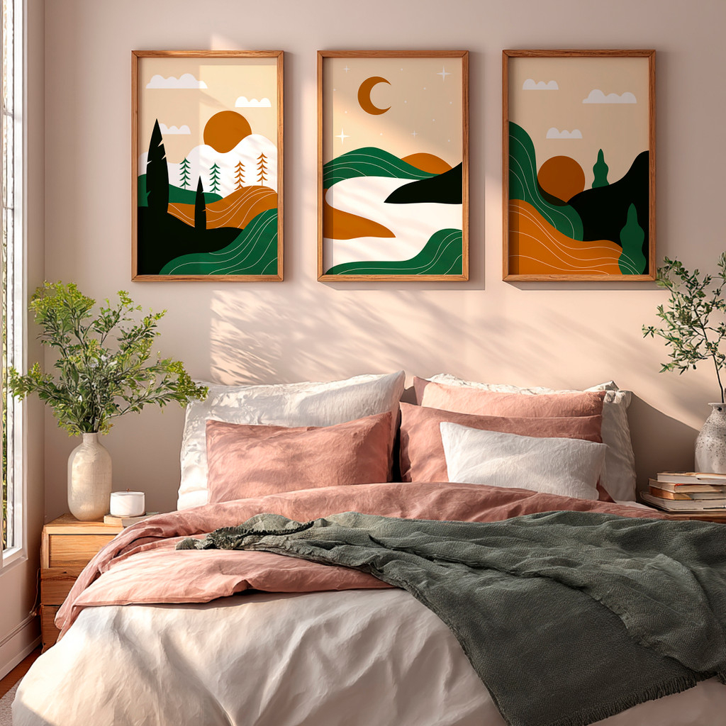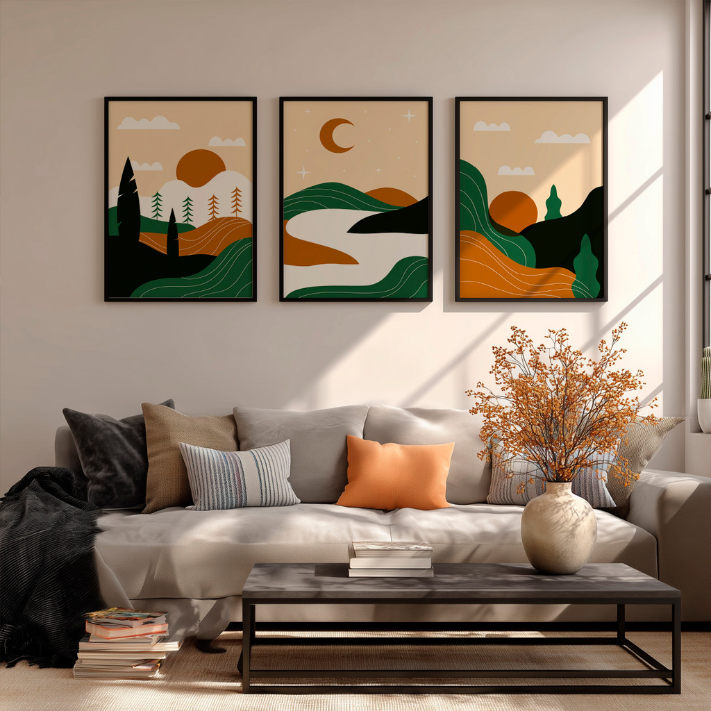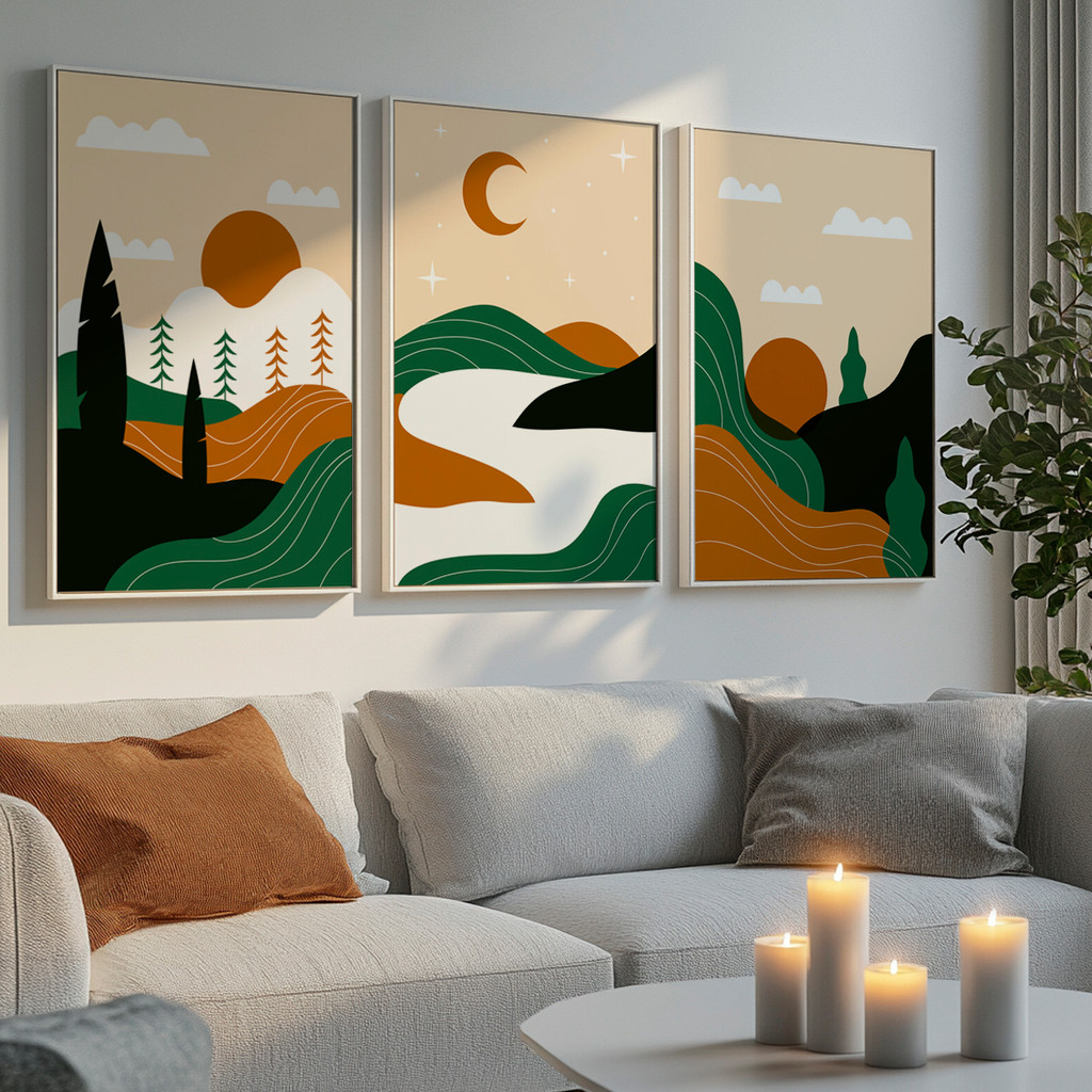 À esquerda, o sol poente repousa sobre colinas onduladas e pinheiros esguios, evocando a paz das montanhas. No centro, a composição ganha profundidade com um lago sereno sob o arco de uma lua crescente e o brilho das estrelas, enquanto a peça da direita completa a jornada visual com a energia vibrante de vales coloridos e nuvens estilizadas, criando um fluxo harmonioso que acalma e inspira.
