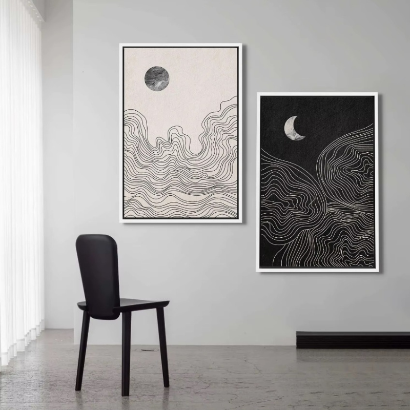Esse conjunto de dois quadros traz uma proposta moderna e minimalista que impressiona pela elegância. Com traços contínuos que criam movimento e profundidade, as obras evocam a beleza das formas abstratas em perfeita harmonia. As composições em preto e branco, com elementos lunares, transmitem sofisticação e tornam o ambiente muito mais estiloso.