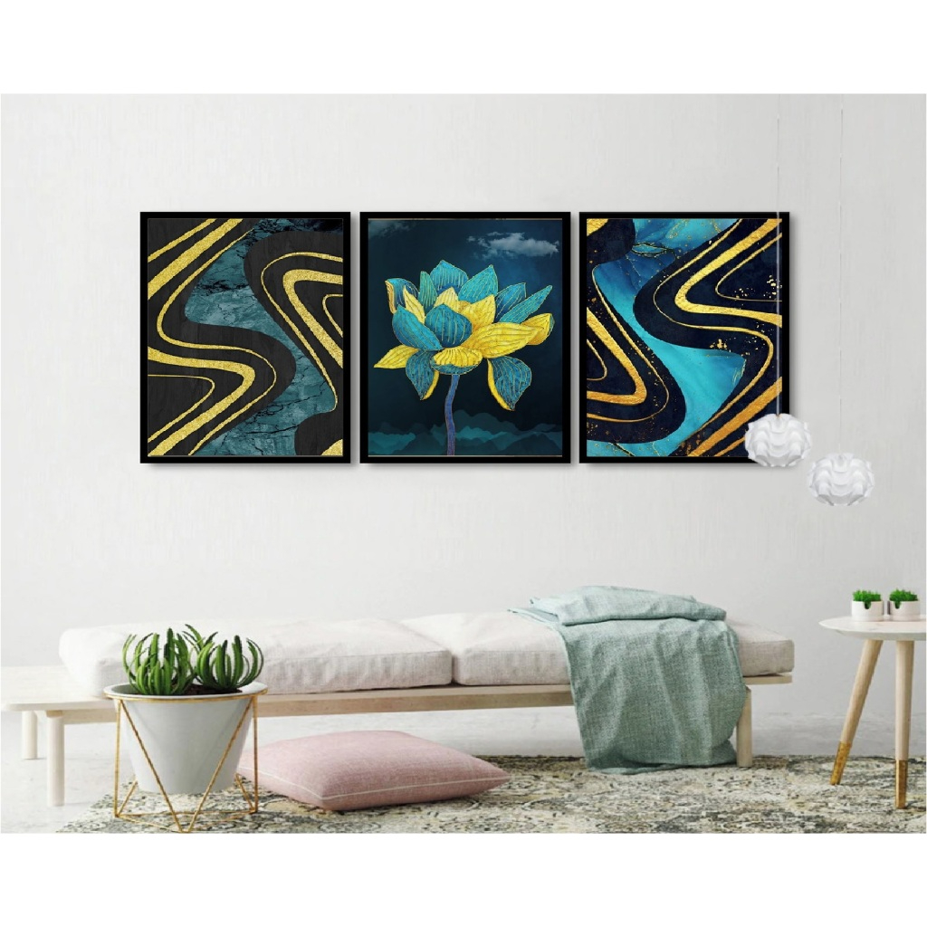 O Quadro Geometria Delicada traz o equilíbrio entre a força das formas abstratas e a delicadeza de uma flor em destaque. As linhas fluidas em preto, azul e dourado criam movimento, enquanto o centro floral transmite leveza e sofisticação.