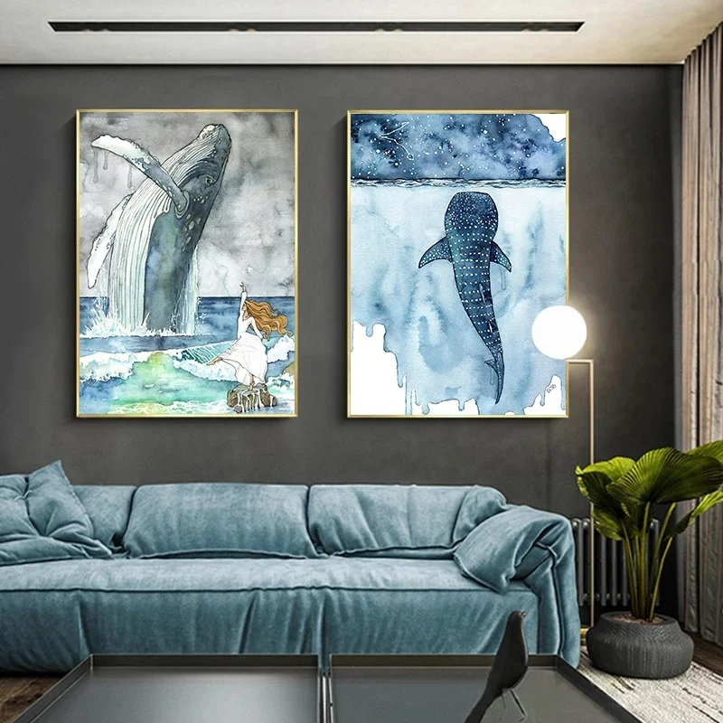 Seja na sala de estar, no quarto ou em um espaço de trabalho criativo, esses quadros se destacam pela harmonia de cores e pela temática única. A combinação entre os tons de azul e os elementos artísticos cria um clima sereno e sofisticado, que combina com estilos modernos, minimalistas e até mais ousados. Mais do que peças decorativas, esses quadros despertam sensações e contam histórias. Eles trazem à sua casa a beleza do oceano e a grandeza dos animais marinhos, tornando o ambiente mais inspirador e cheio de personalidade.