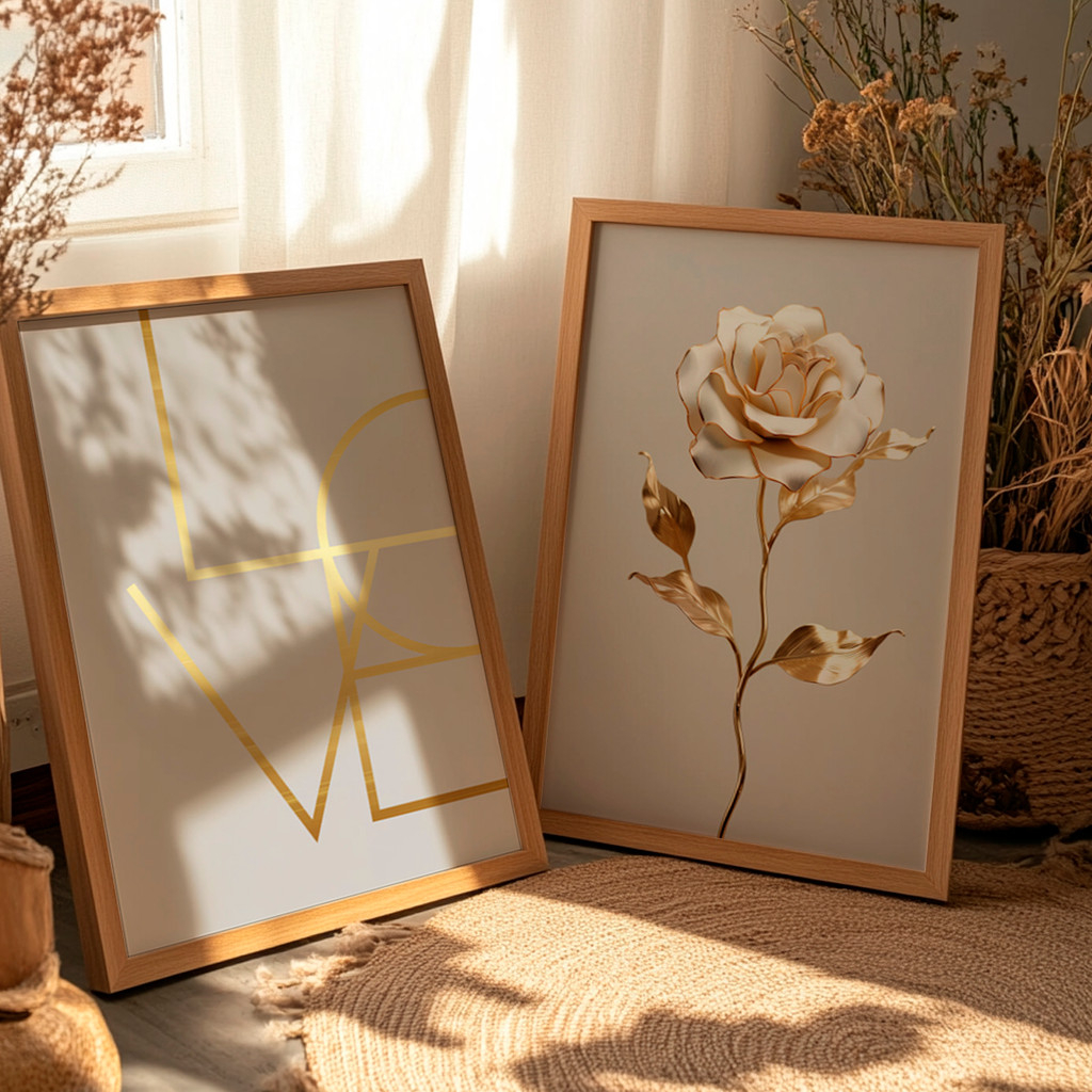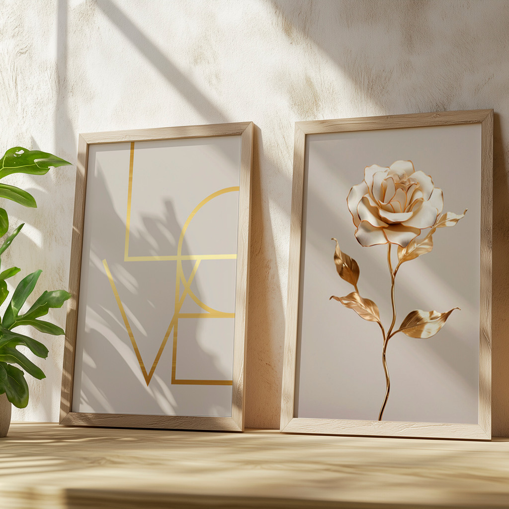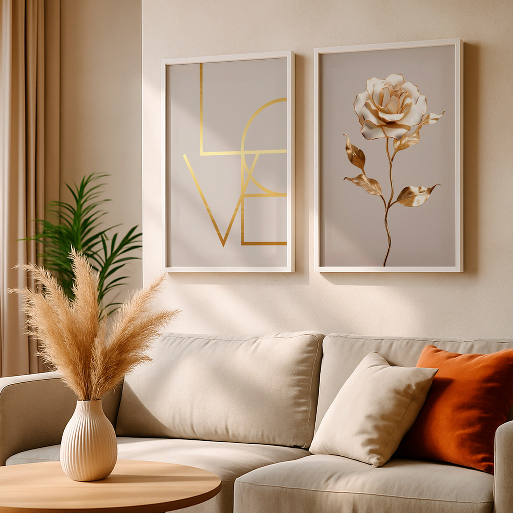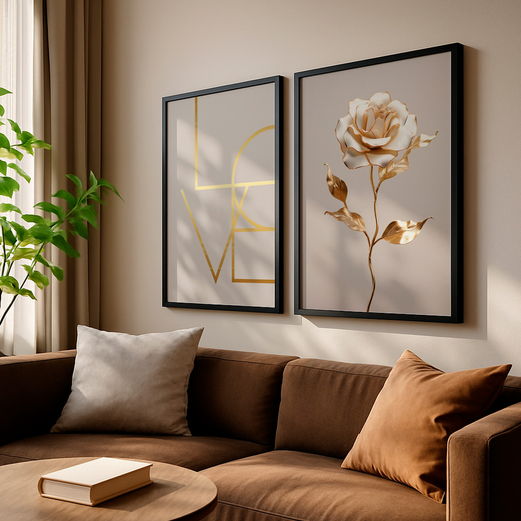 O Quadro Amor e Flor combina a delicadeza de uma rosa estilizada com a tipografia moderna da palavra “LOVE”, ambos trabalhados em tons dourados que transmitem leveza, romantismo e sofisticação. O conjunto cria uma atmosfera acolhedora e elegante, perfeita para ambientes que buscam transmitir boas energias e um toque afetivo.